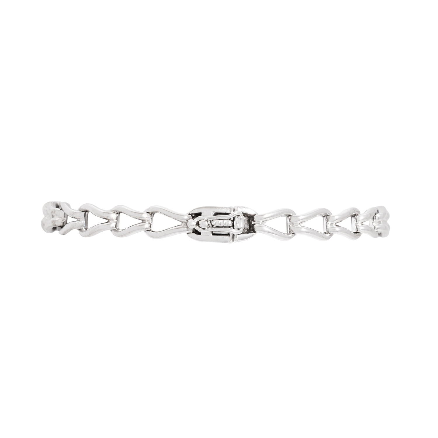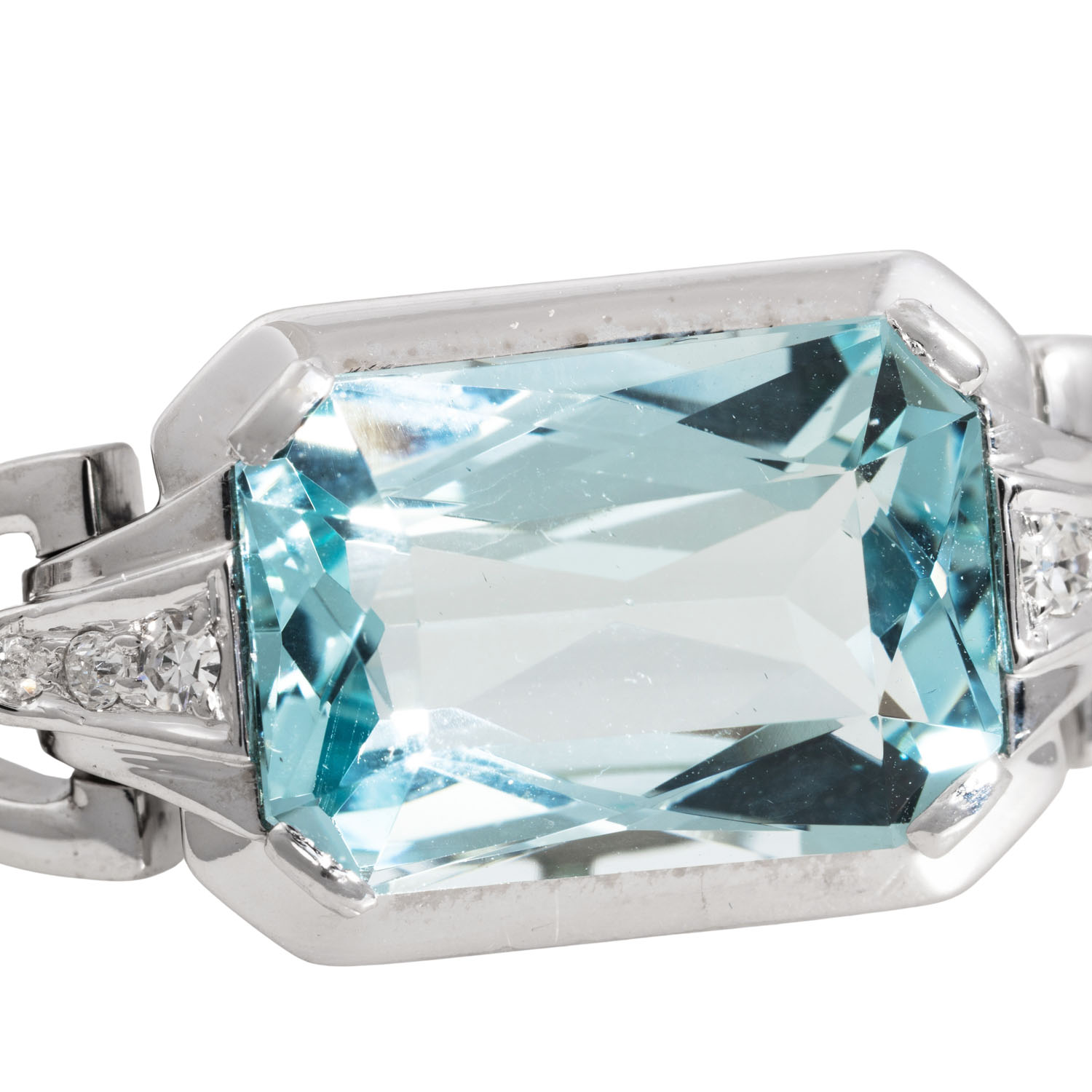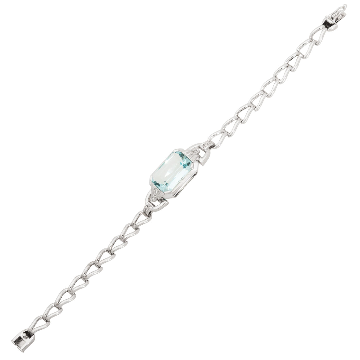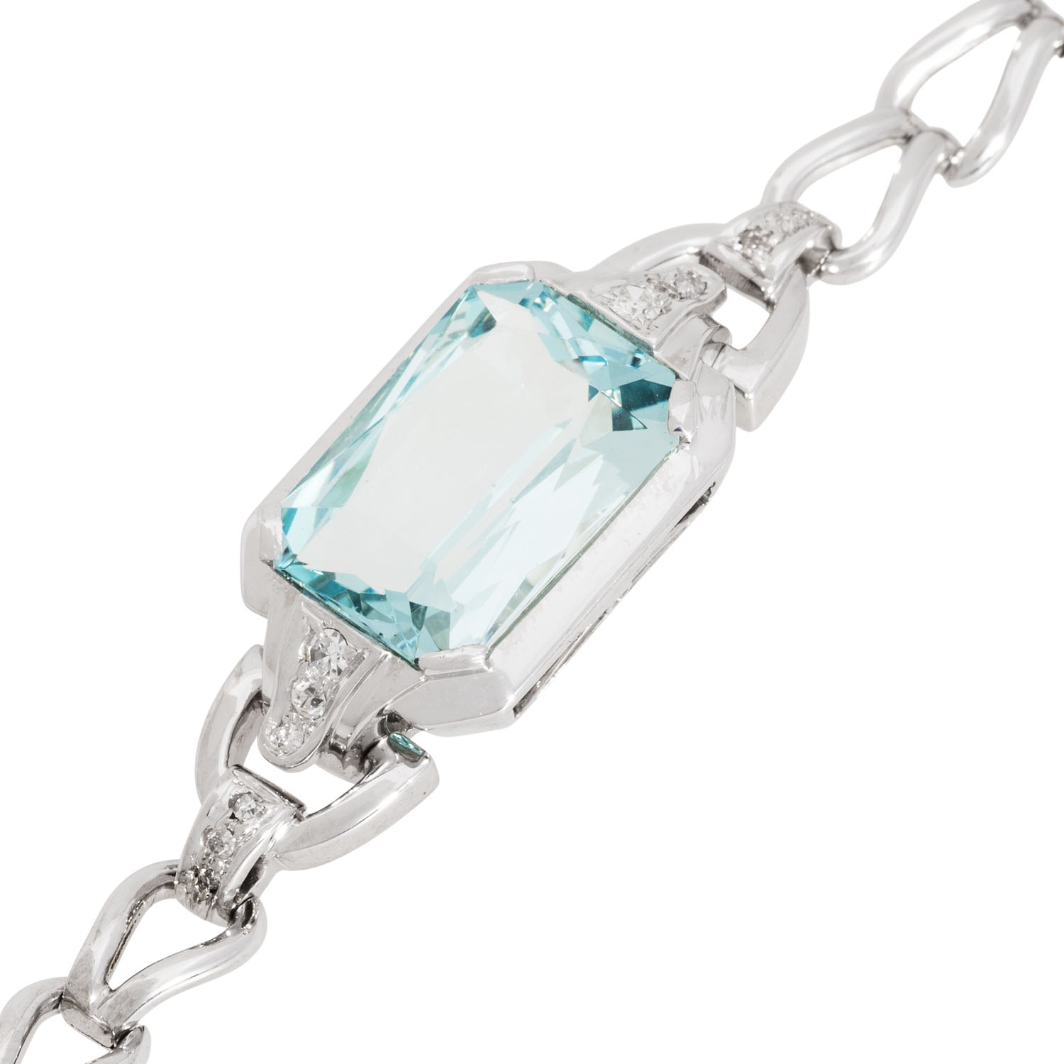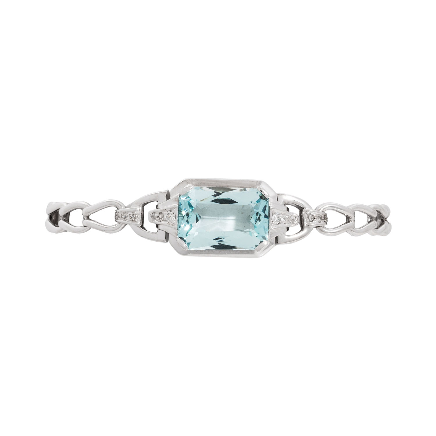 Bracelet with octagonal faceted aquamarine 16x11 mm and small diamonds, 14K white gold, 16 g, L: 18 cm, mid of 20th century, minor signs of wear.