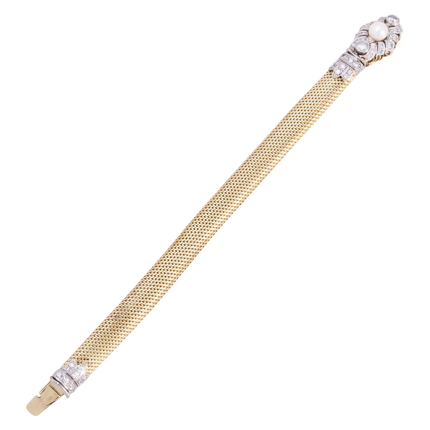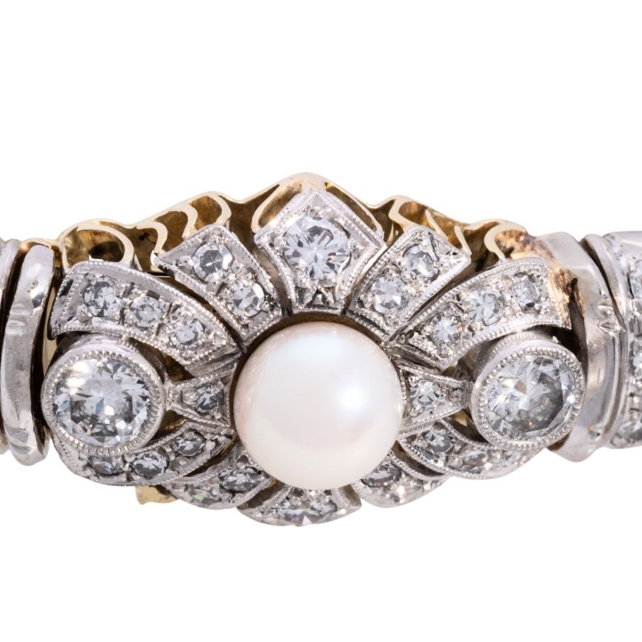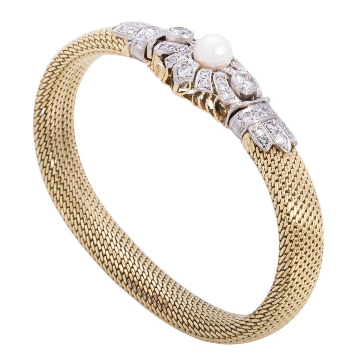 Bracelet with diamond-jewel-clasp, centred Akoya cultured pearl 6.5 mm, brilliant- and single-cut diamonds totalling ca. 1.2 ct, good colour and clarity, 14K yellow and white gold, 35.8 g, L: 17 cm, mid of 20th century, good condition.