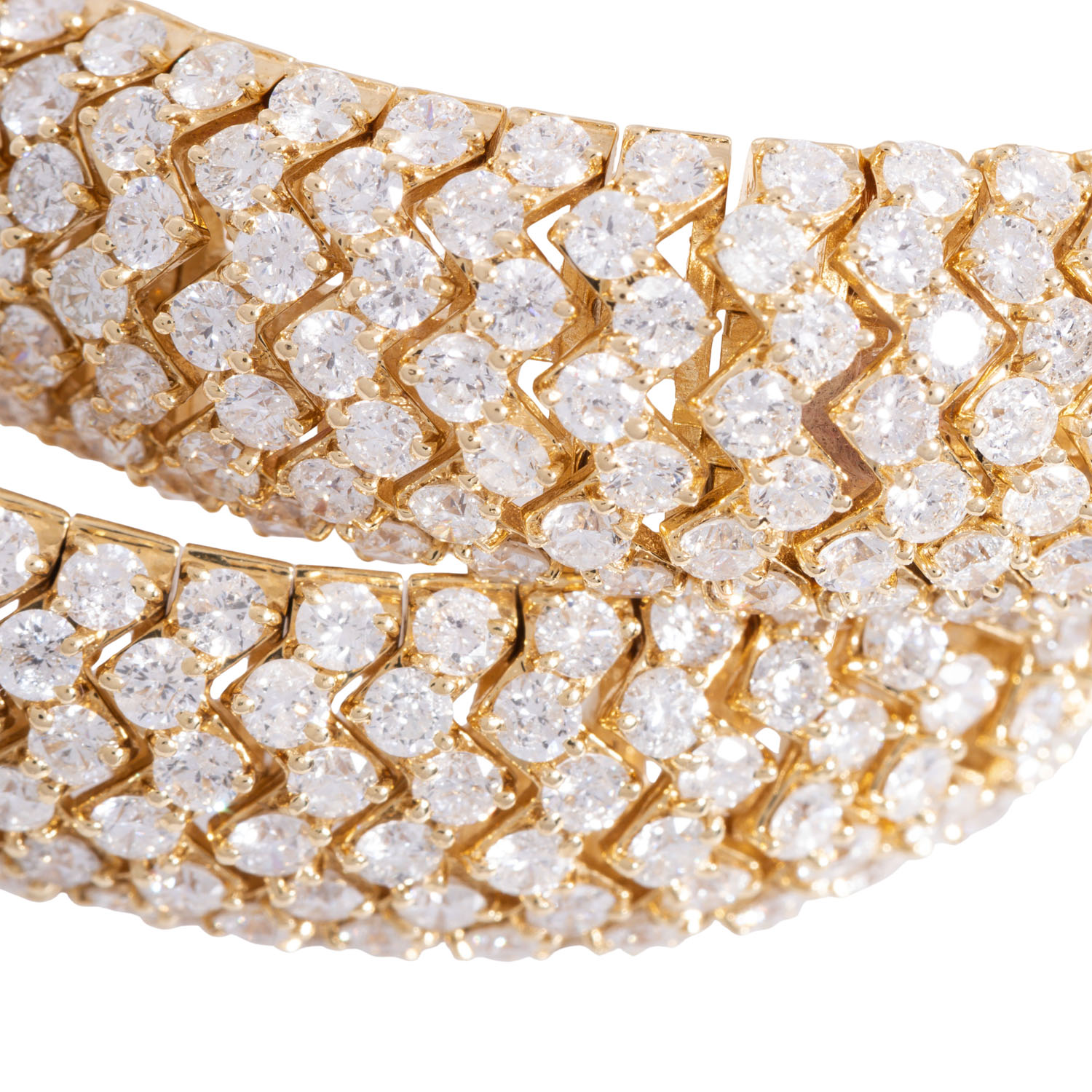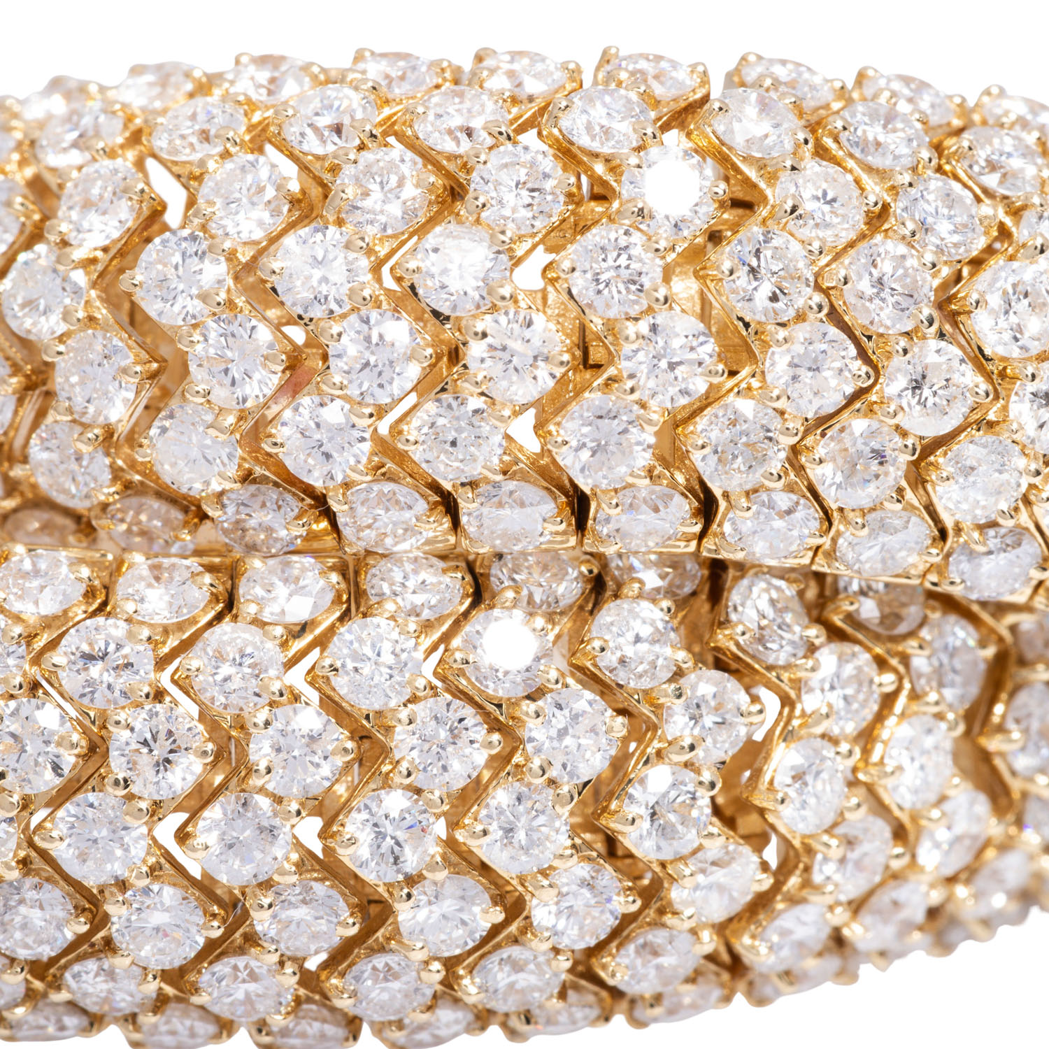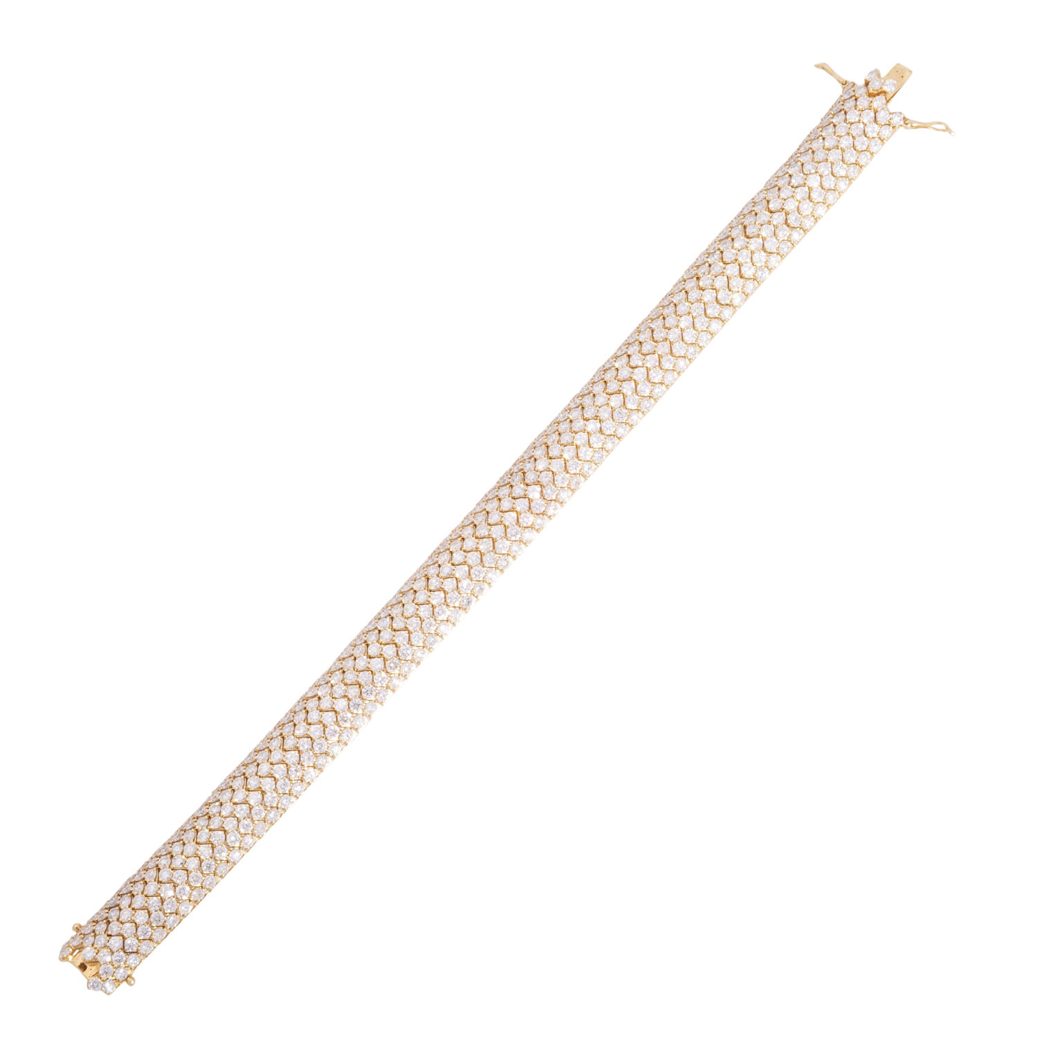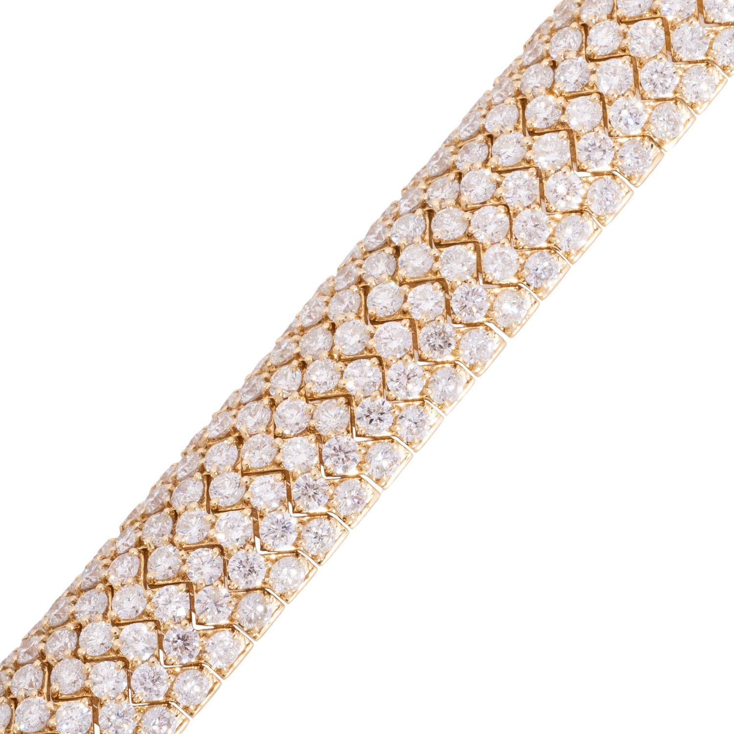 Bracelet with brilliant-cut diamonds totalling ca. 18.75 ct (engraved), low to medium colour and clarity, 18K yellow gold, 45.7 g, L: 19 cm, W: 12 mm, H: 4.5 mm, 20th/21st century, signs of wear, beautiful flexible finish.