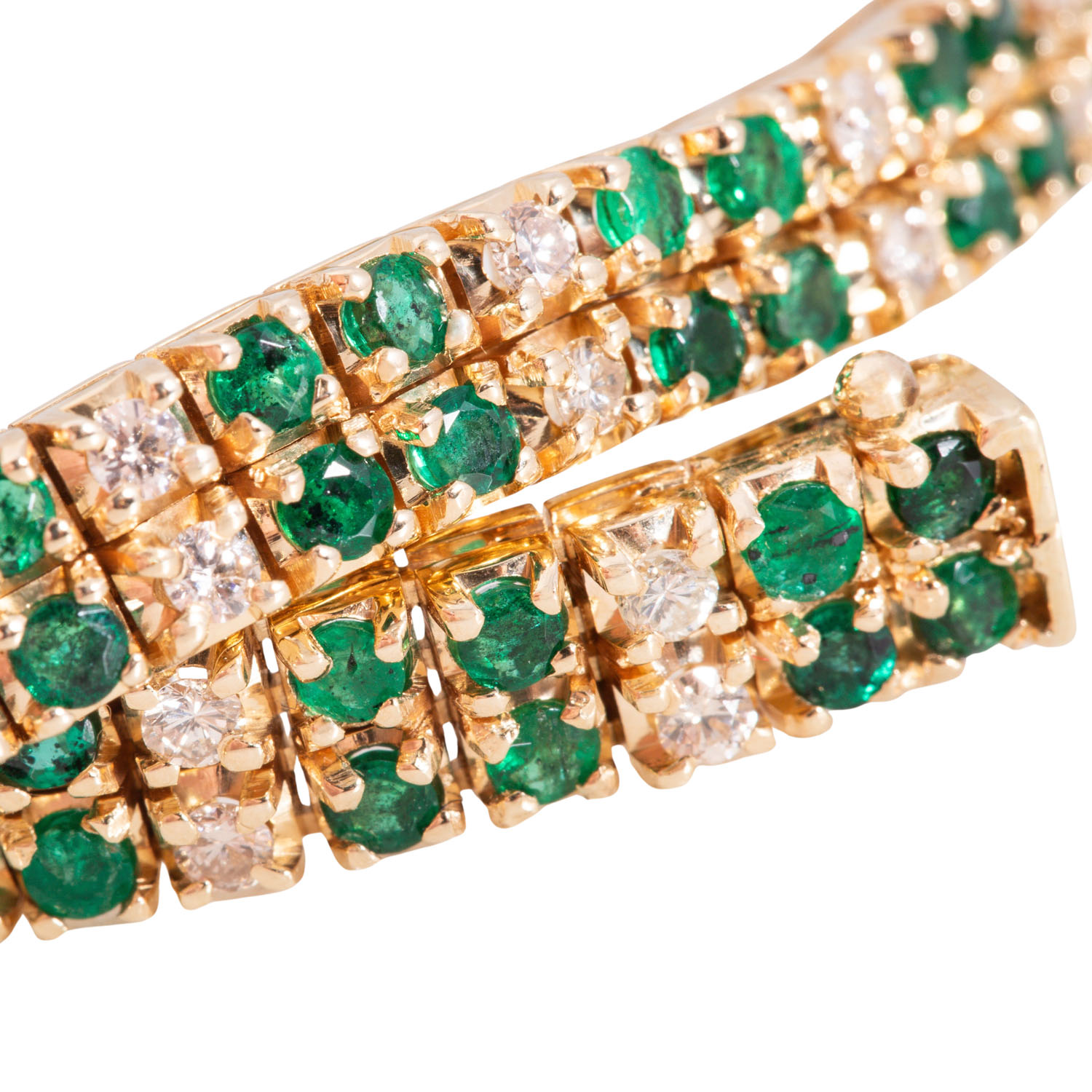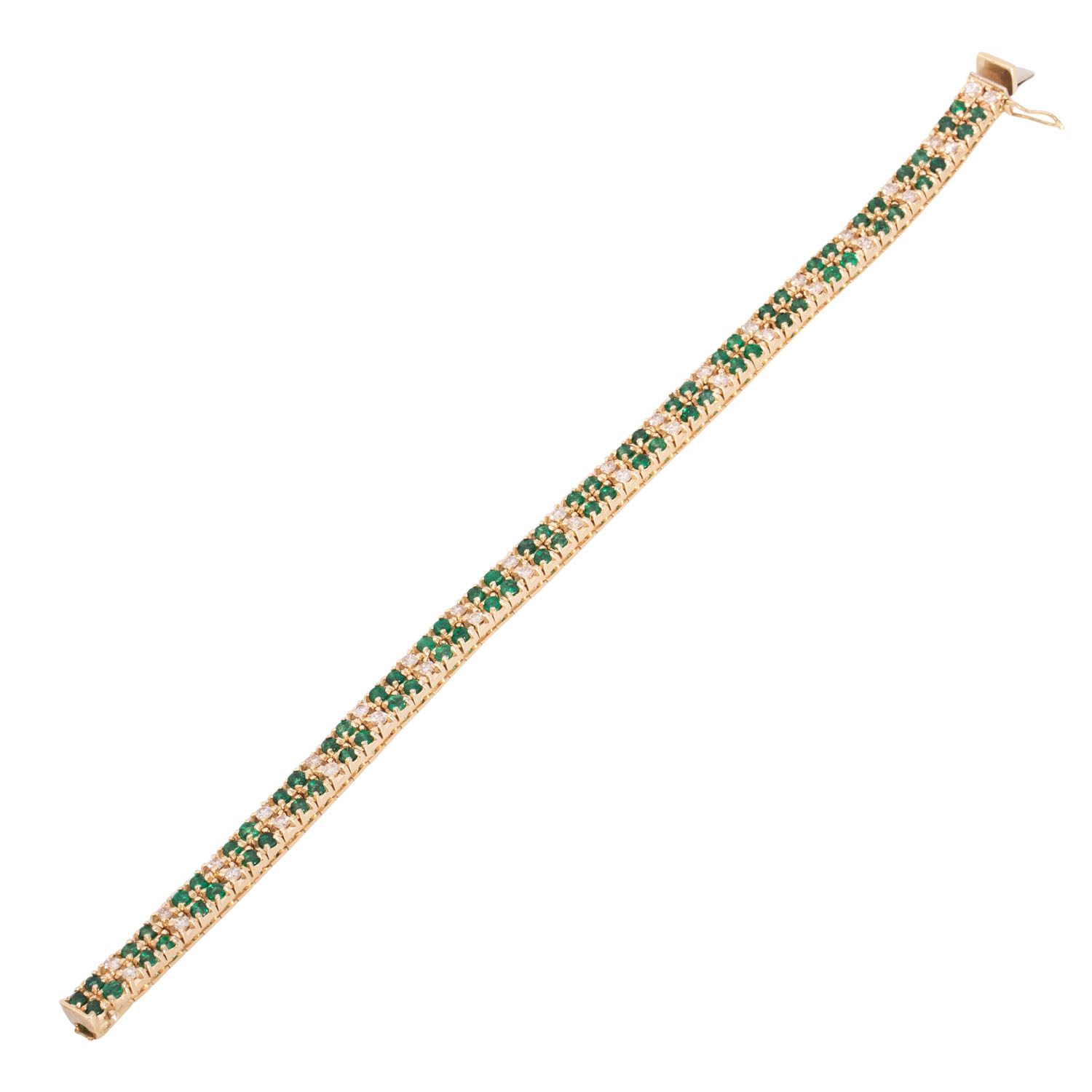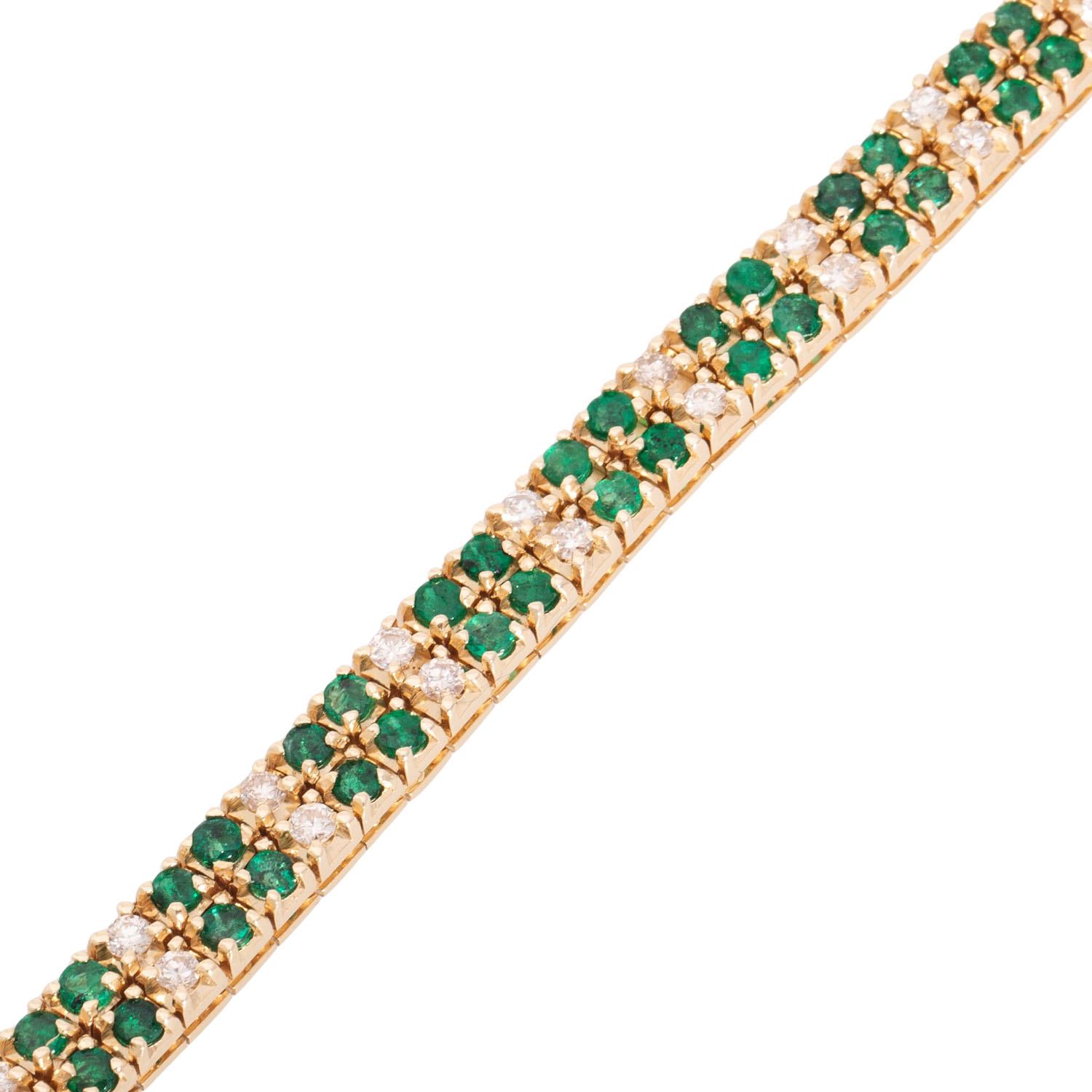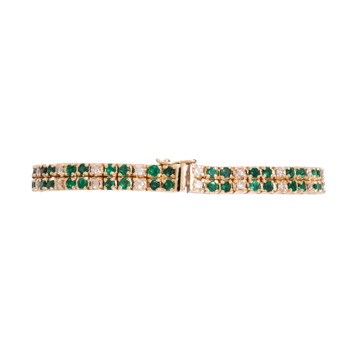 Bracelet with brilliant-cut diamonds totalling ca. 1.3 ct, ca. WHITE-STW (H-J)/SI-I1 and emeralds, partly chipped, 14K yellow gold, 26.7 g, L: 18.5 cm, W: 6 mm, 2nd half of 20th century, minor signs of wear, solid craftsmanship.