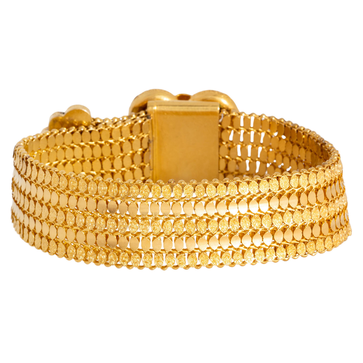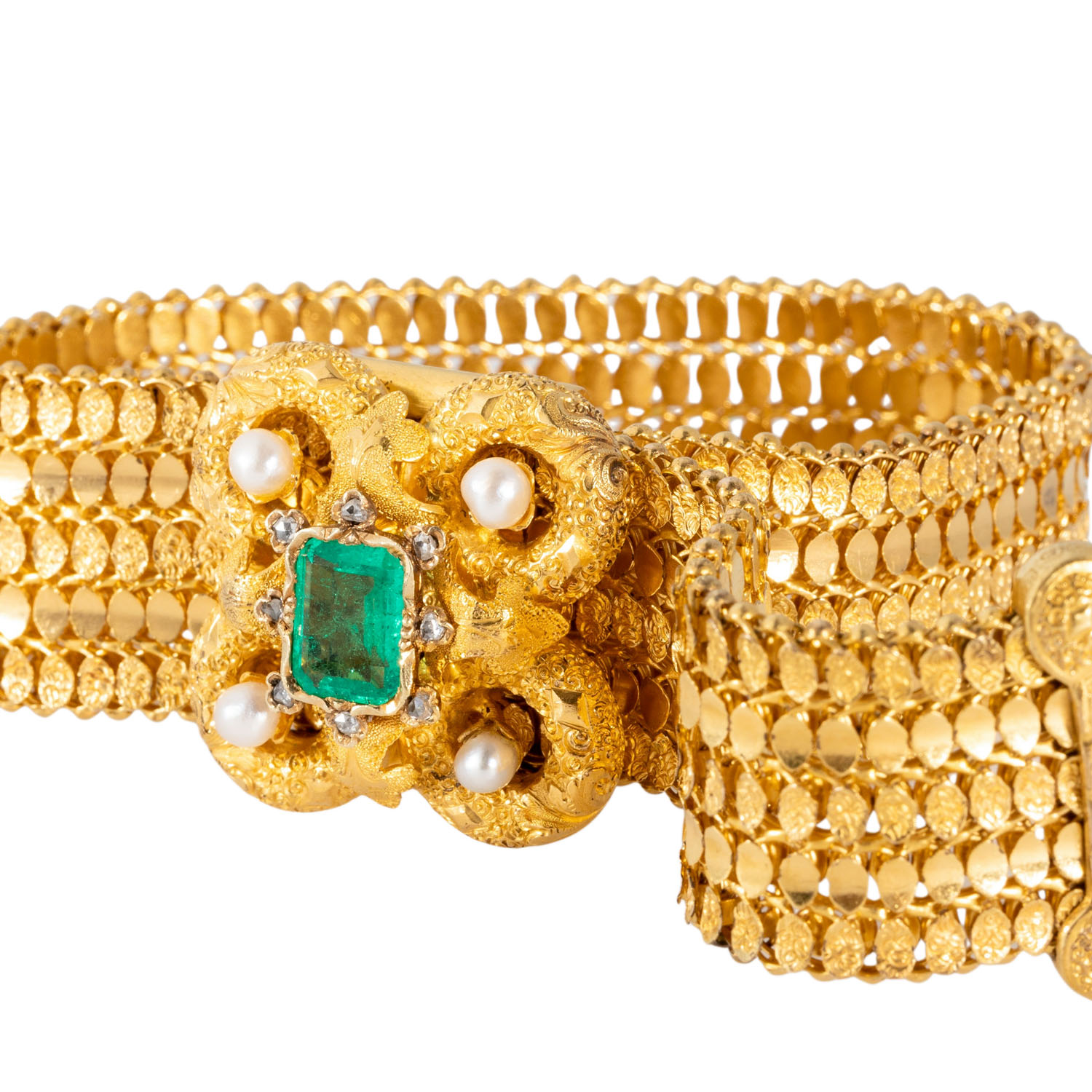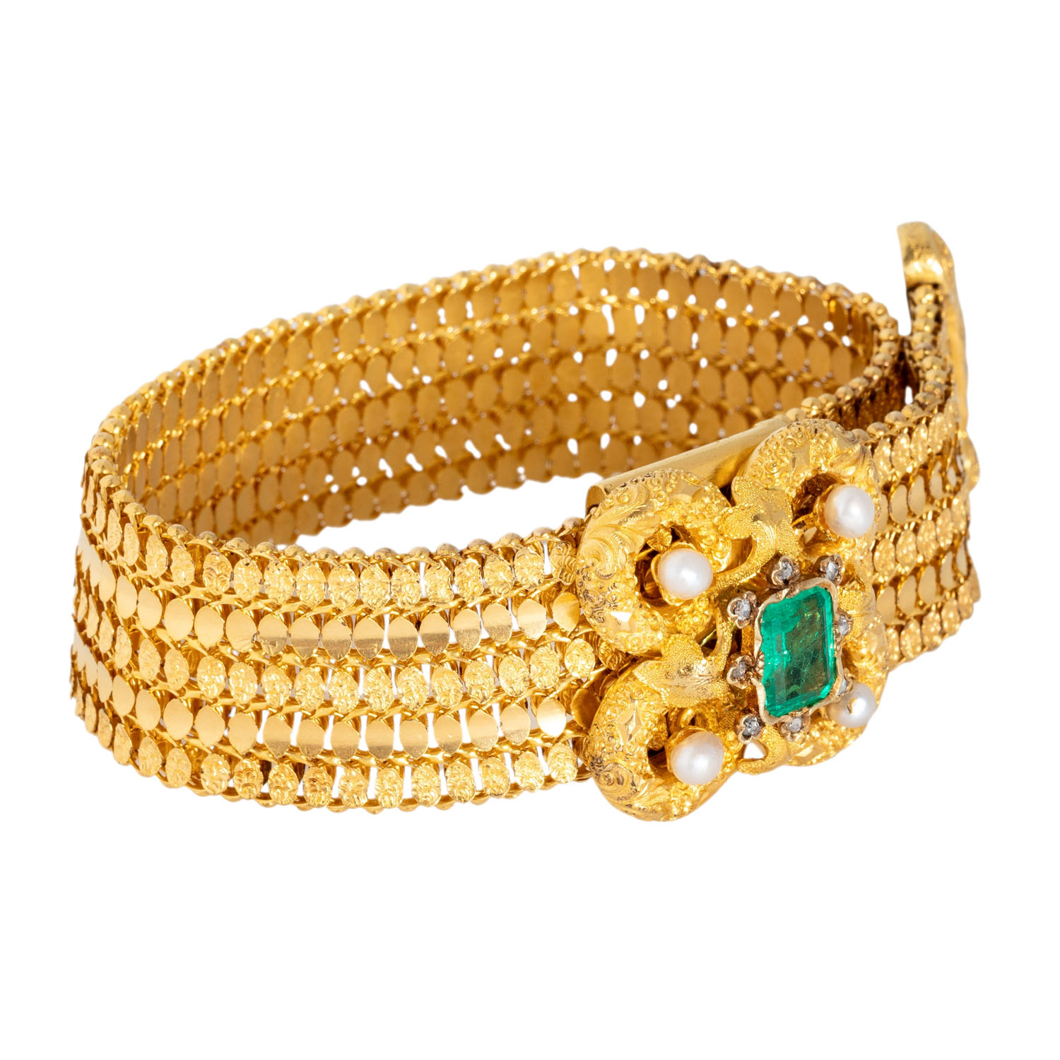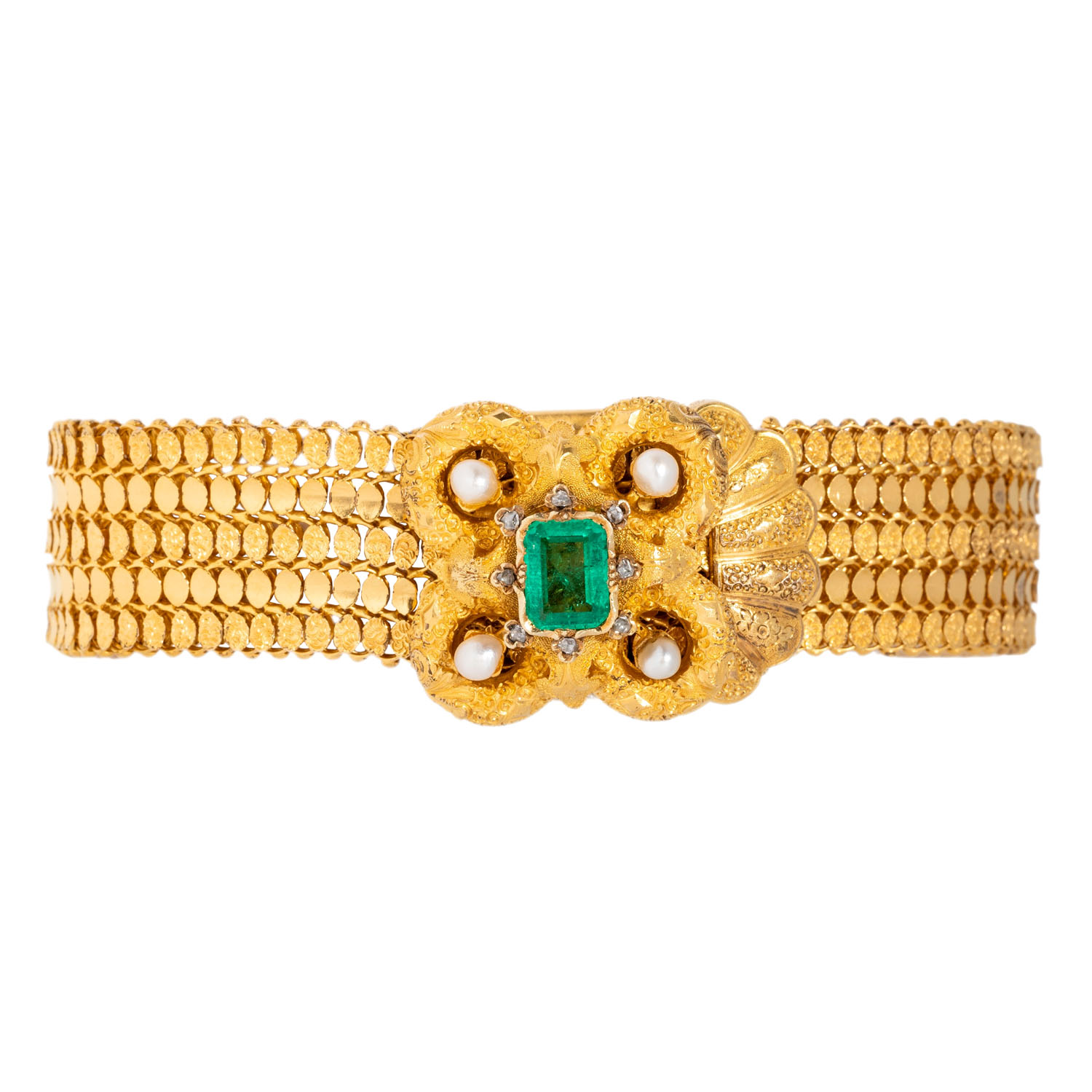 Bracelet with fine emerald, 4 pearls and 8 rose-cut diamonds, emerald-cut, approx. 9 x 6.8 mm, approx. 2.3 ct, very beautiful colour, probably Colombia, pearls probably natural pearls, light baroque shape, D: approx. 3.8 mm, beautiful luster, 21.6K yellow gold, 62.2 g, L: approx. 15.5 - 21.5 cm, W: approx. 2.1 - 2.8 cm, 20th century, good condition considering its age.