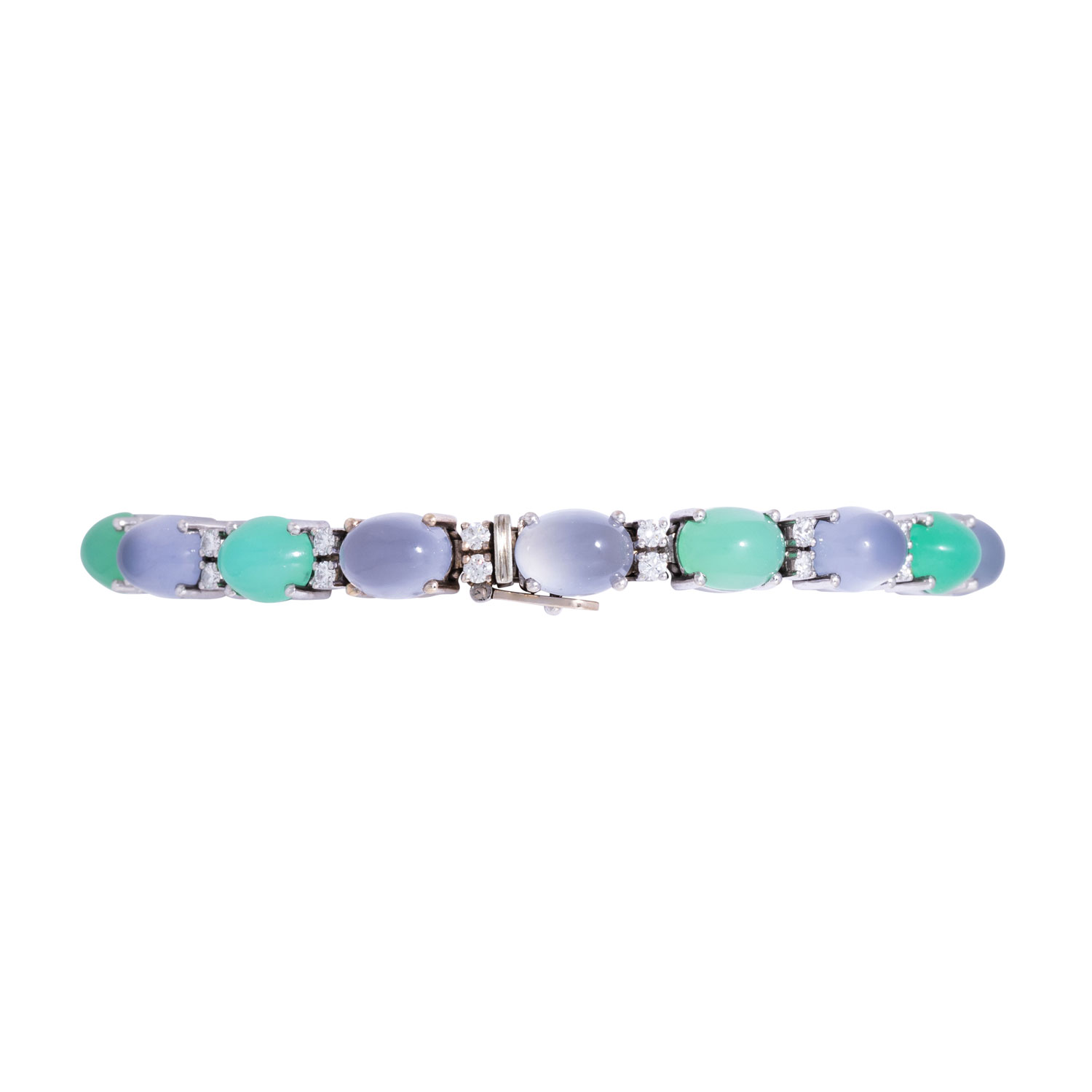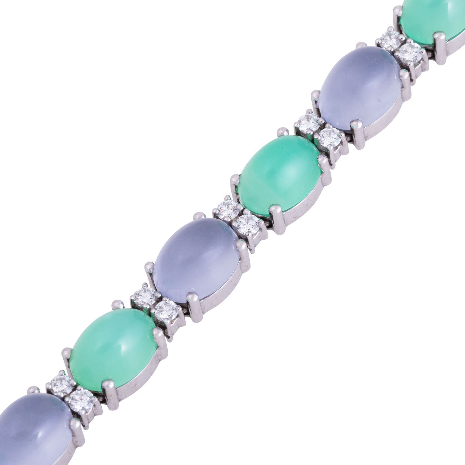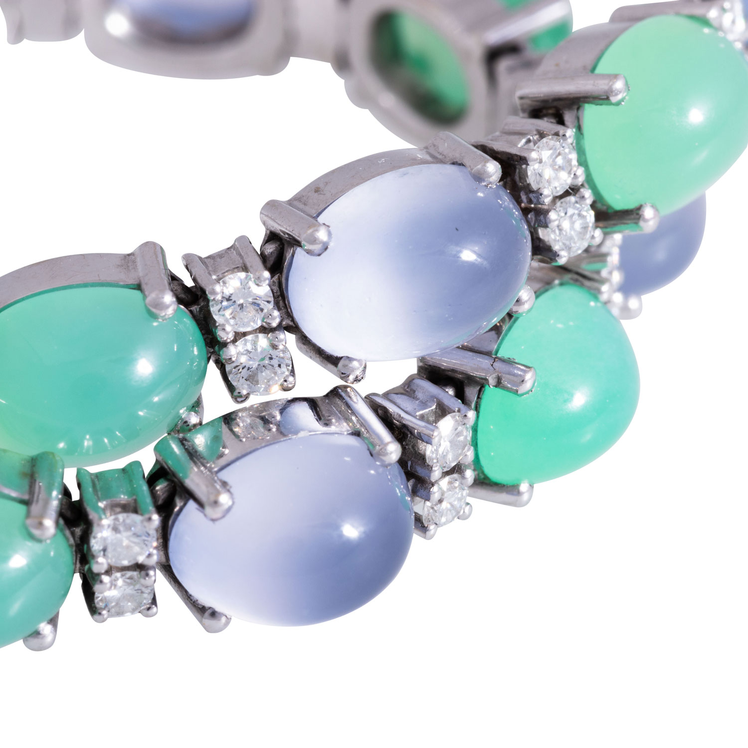 Bracelet with green and blue chalcedony cabochons and brilliant- cut diamonds totalling ca. 0,90 ct, WHITE (H)/ VS. 18 K WG, 23,7g. Length: ca. 18 cm, 2nd half 20th century, minor signs of wear, with maker's mark: Behner & Cie, Pforzheim.