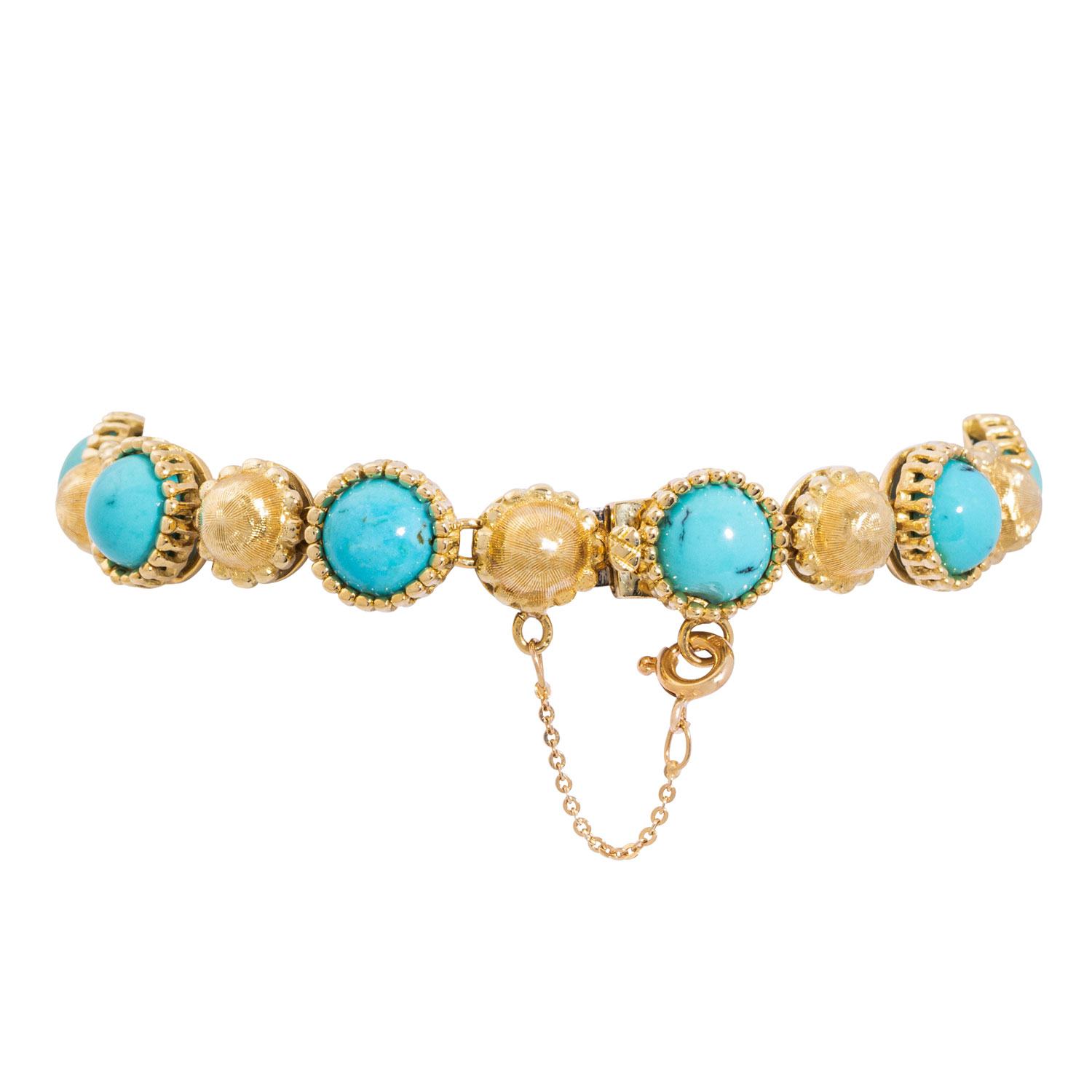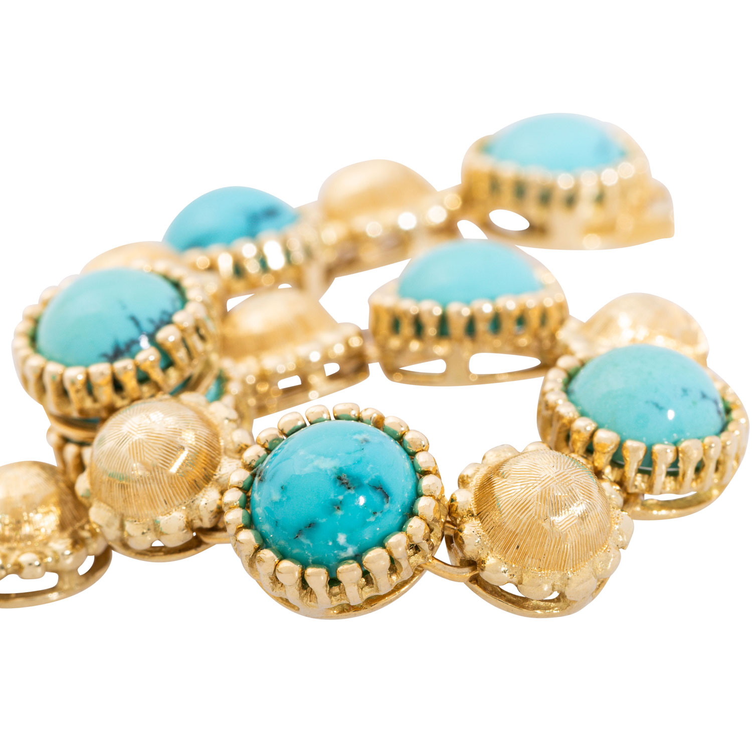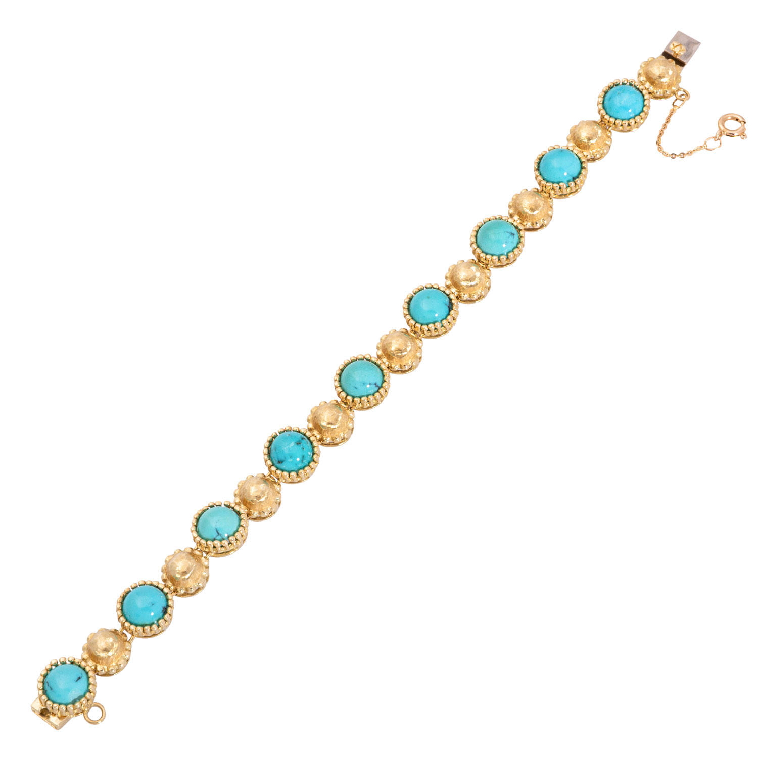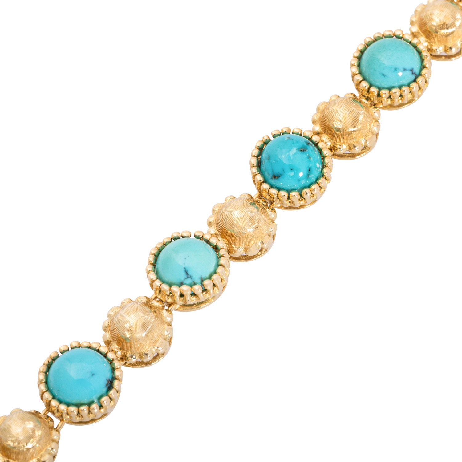Bracelet with round cabochon-cut turquoises D: 8 mm, alternating with round gold parts, 18K yellow gold, 28.9 g, L: 18 cm, 2nd half of 20th century, signs of wear, 1 turquoise chipped, some slightly discoloured, markde 'APHRODITE'.