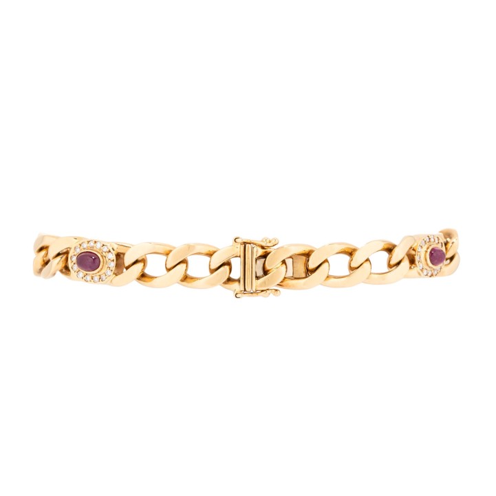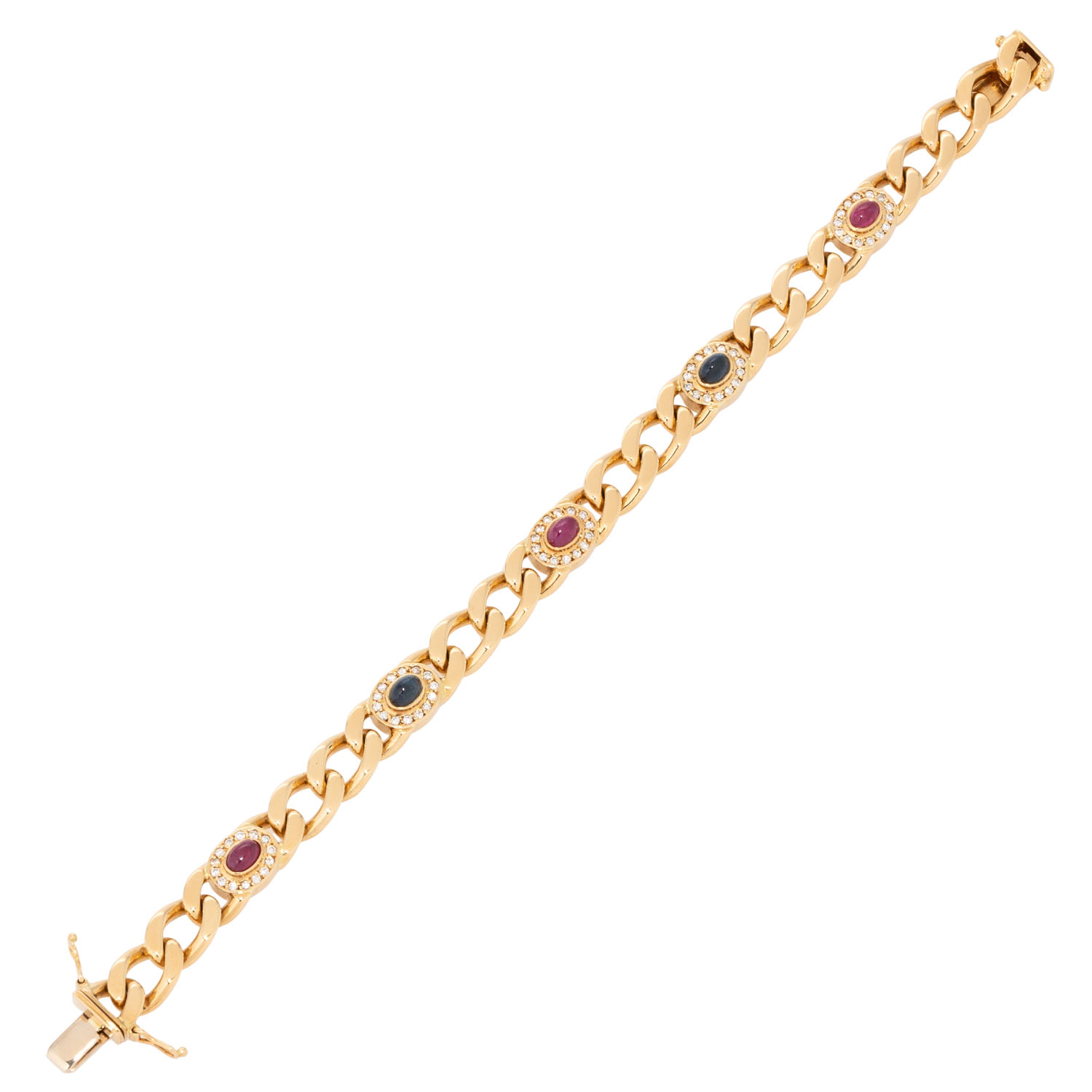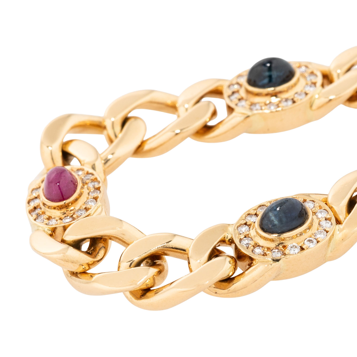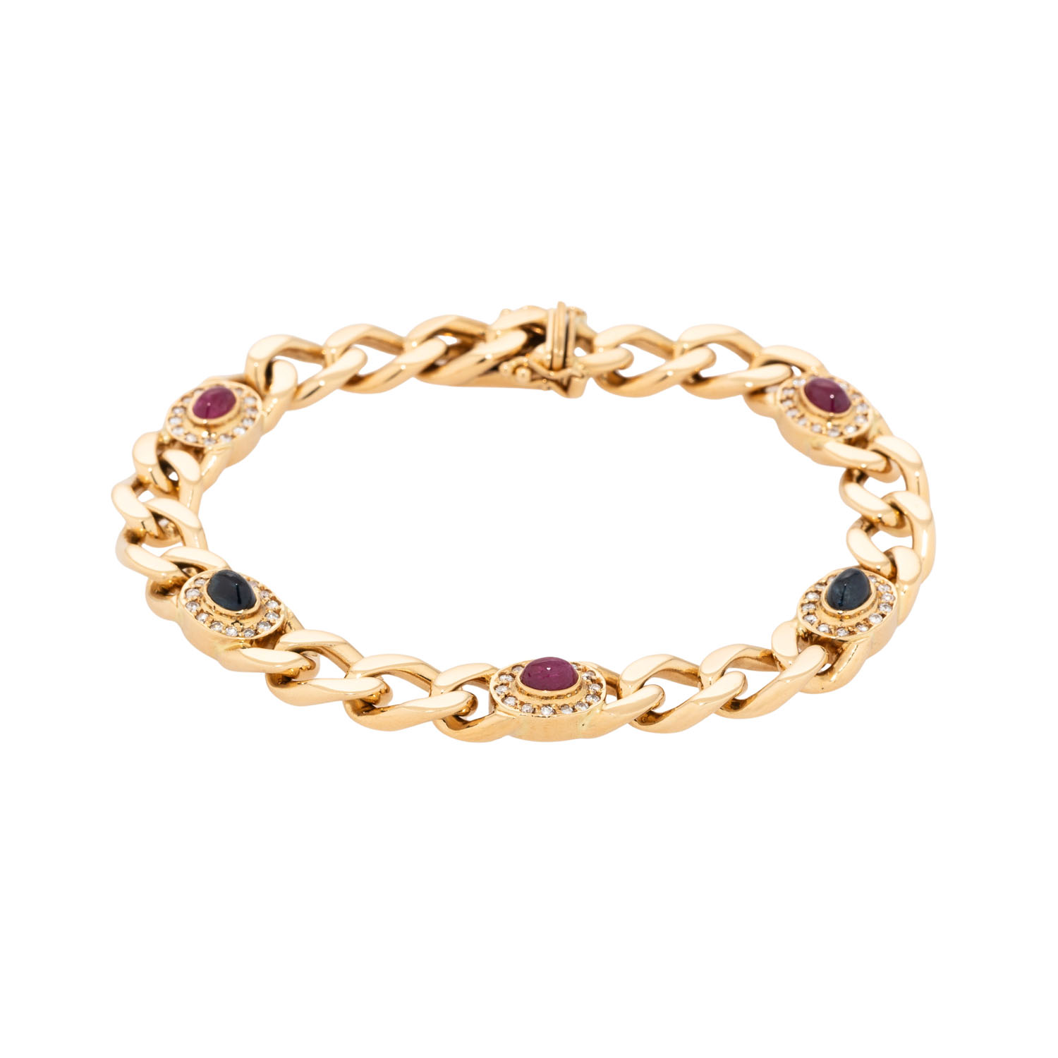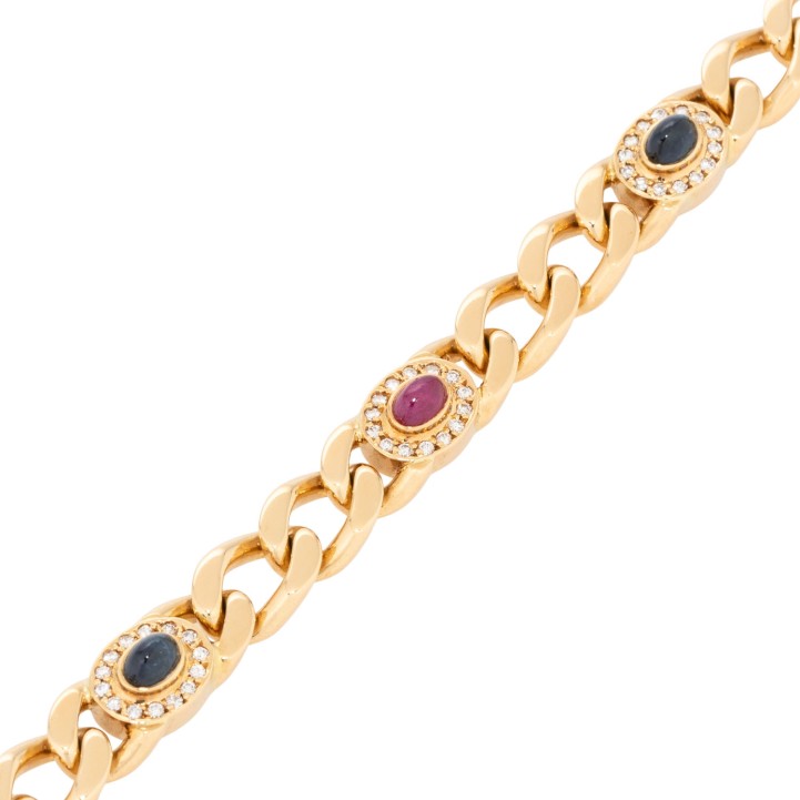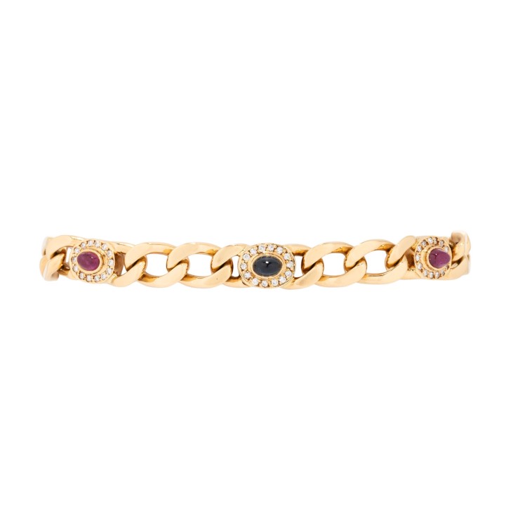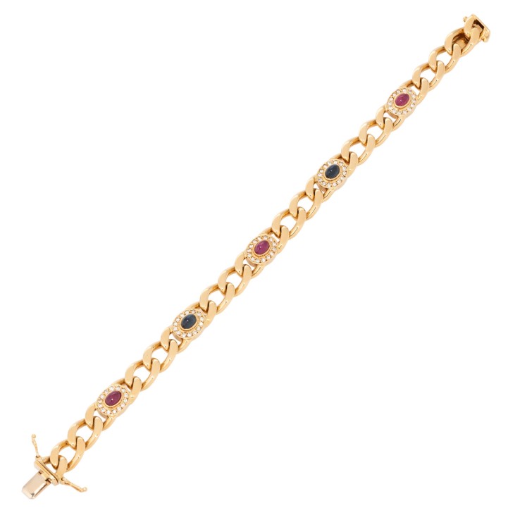 Bracelet with rubies, sapphires and brilliant-cut diamonds totalling ca. 0.70 ct, good to very good color a. clarity, 18K YG, 35.2 g, L: ca. 19.5 cm, 2nd half 20th century, mint condition.