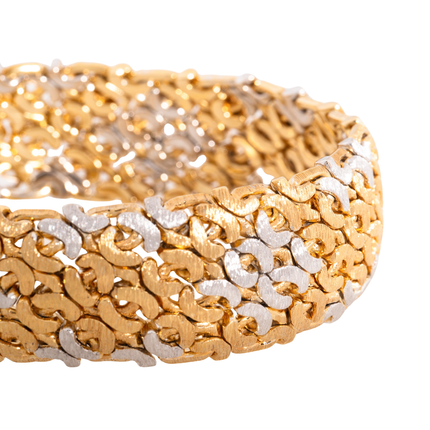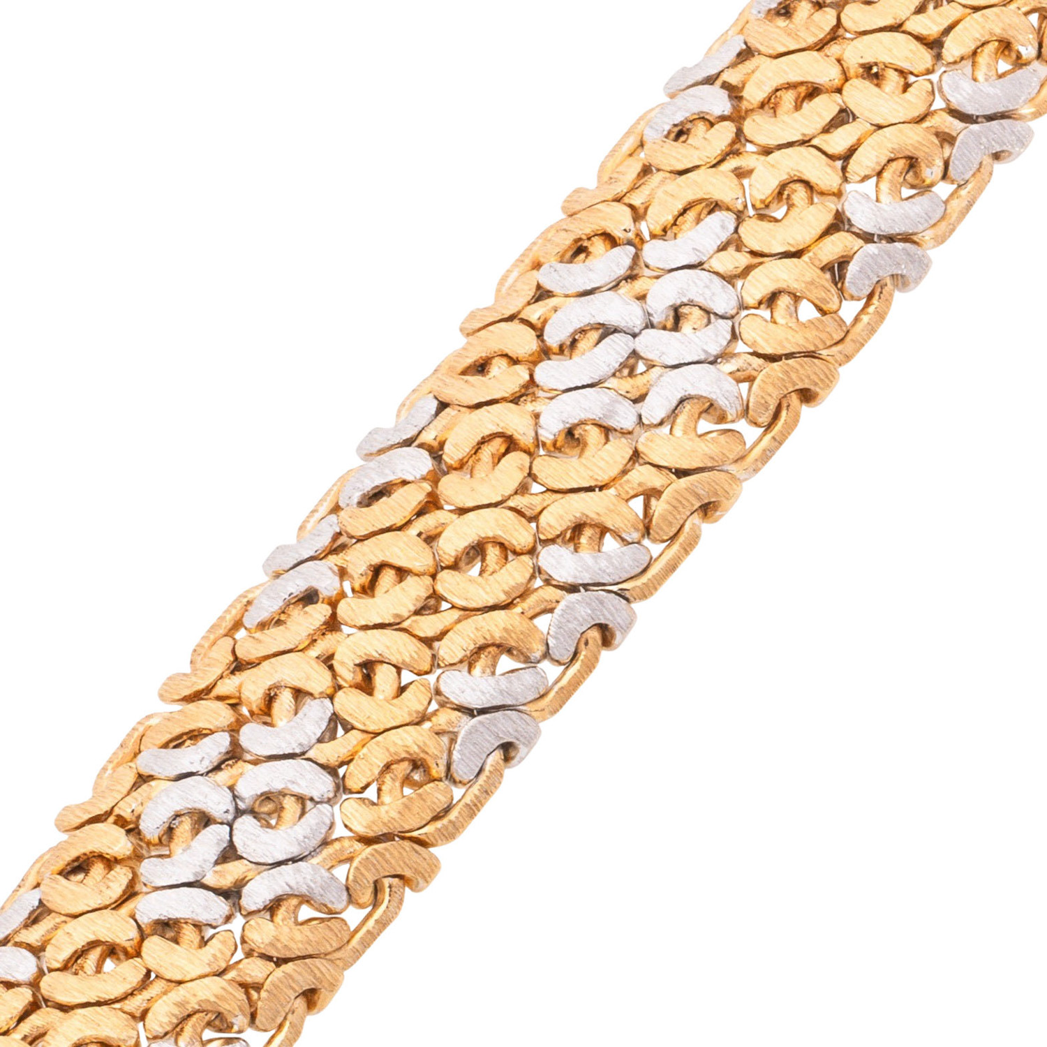 Phantasy bracelet, satin matt, 18K yellow and white gold, 104.5 g, L: ca. 19 cm, W: ca. 1.9 cm, mid 20th century, minimal signs of wear, box clasp with 2 safety catches.