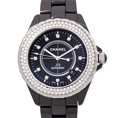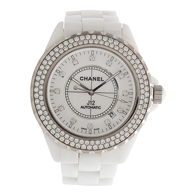 CHANEL Armbanduhr "J12", weiße Keramik (Boden Edelstahl). Stahl-Lünette u. Ziffernblattmit Dia.-Besatz. Automatik-Werk.