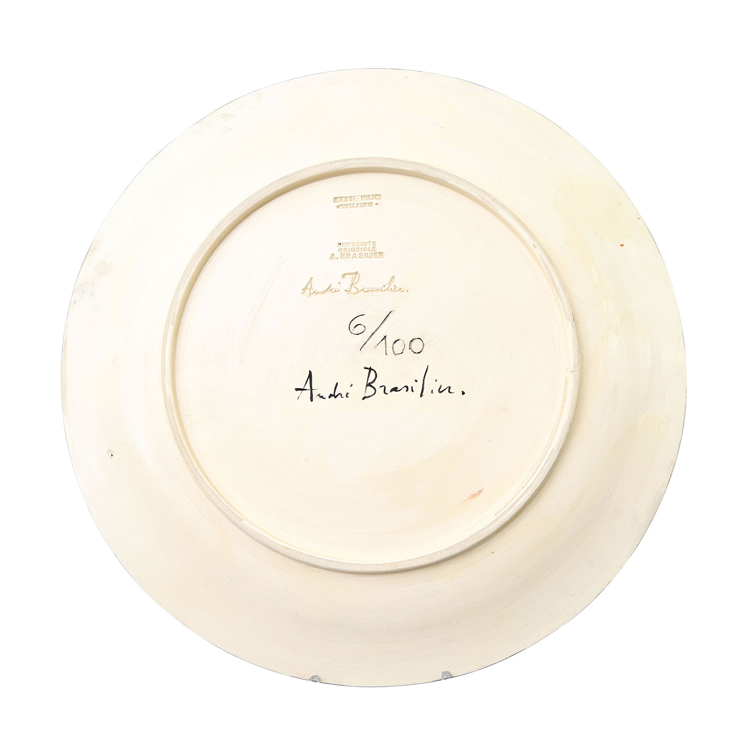 BRASILIER, ANDRÉ (born 1929), plate 'Flowers in a vase'. Ceramic, incised and blue painted motif of flowers in a vase, signed and impressed mark (SASSI-MILICI VALLAURIS and EMPREINTE ORIGINALE A. BRASILIER), no. 6/100, d. approx. 34.5cm, slight signs of age.