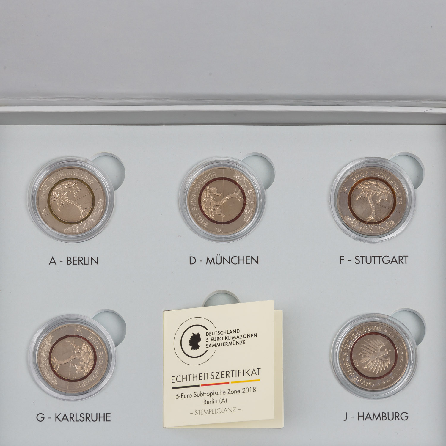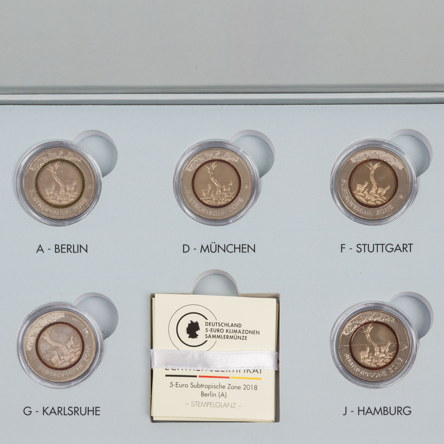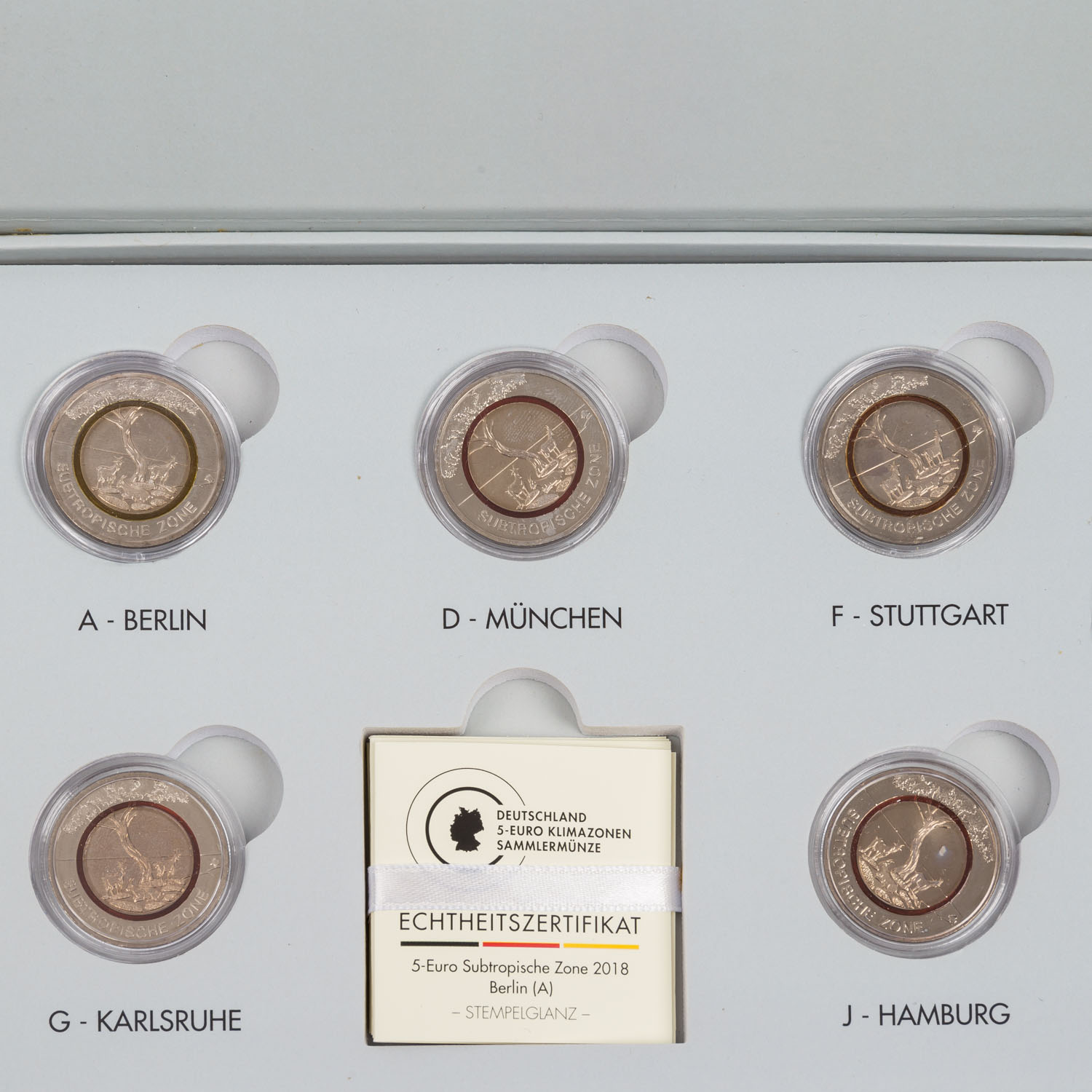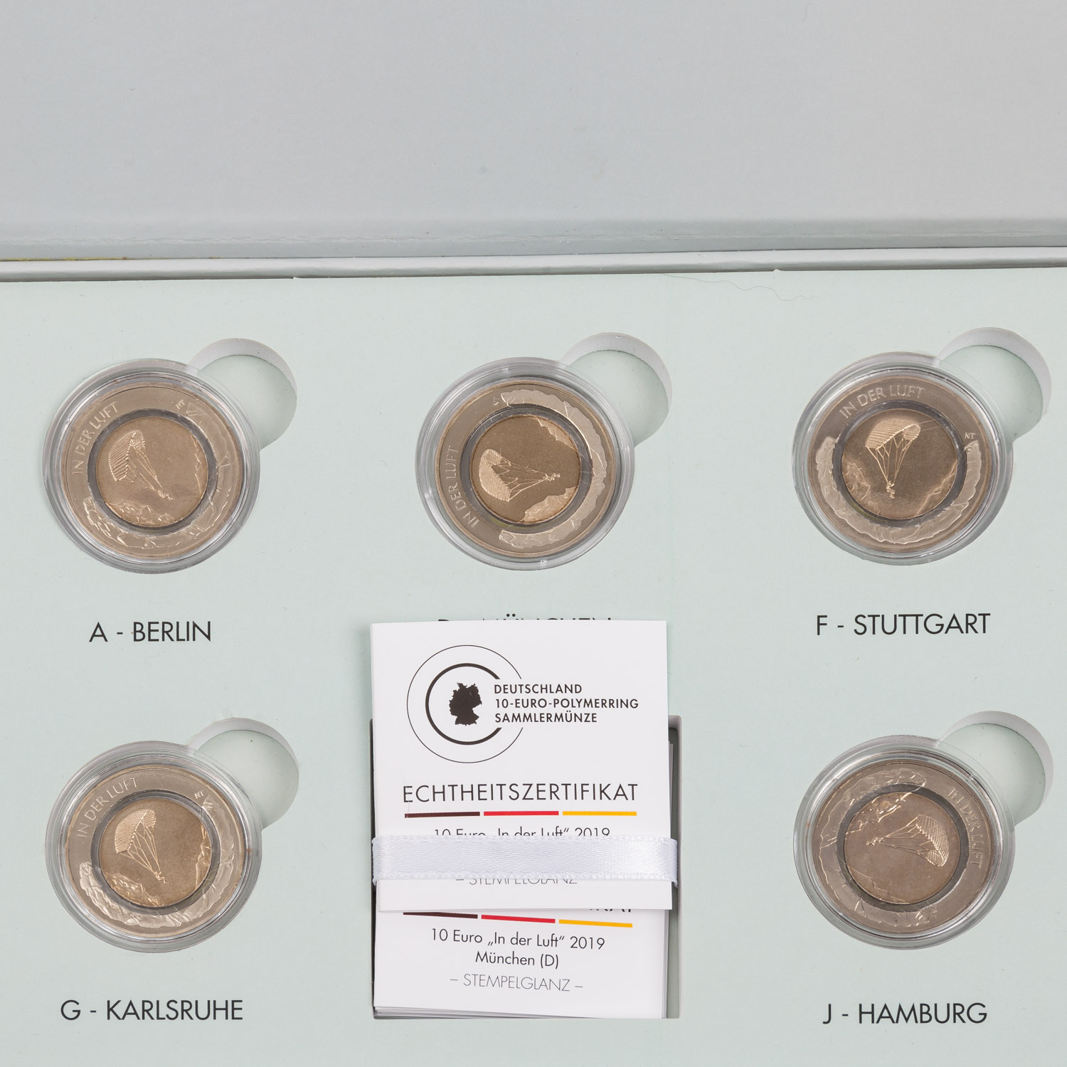 BRD - 4 x sets of polymer ring collector coins in original LED light boxes of which 3 à 5 x 5-Euro polymer ring 'Subtropical Zone' 2018; 1 à 5 x 10-Euro polymer ring 'In der Luft' 2019, each FDC condition, encapsulated, in original LED light boxes and slipcase, with certificates.