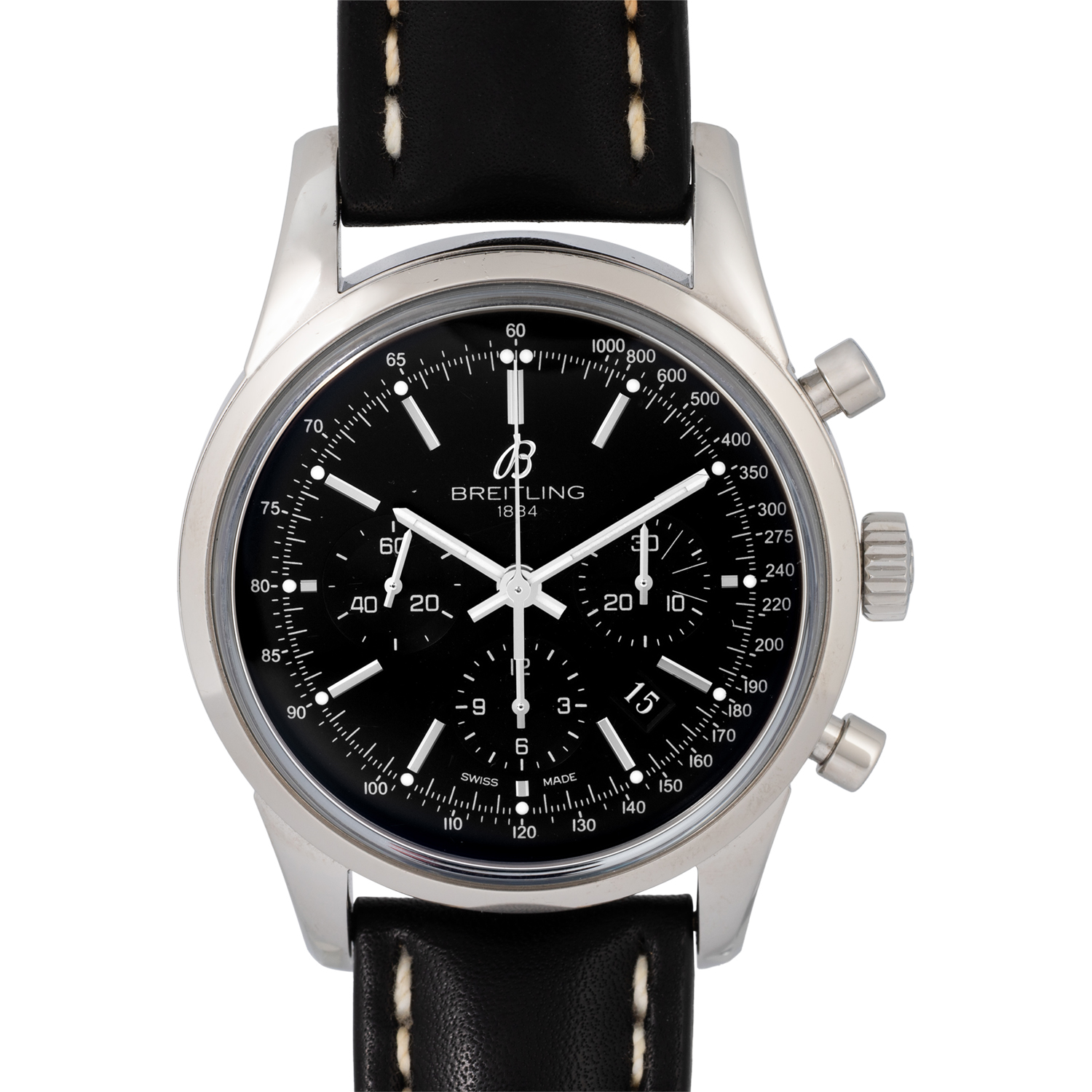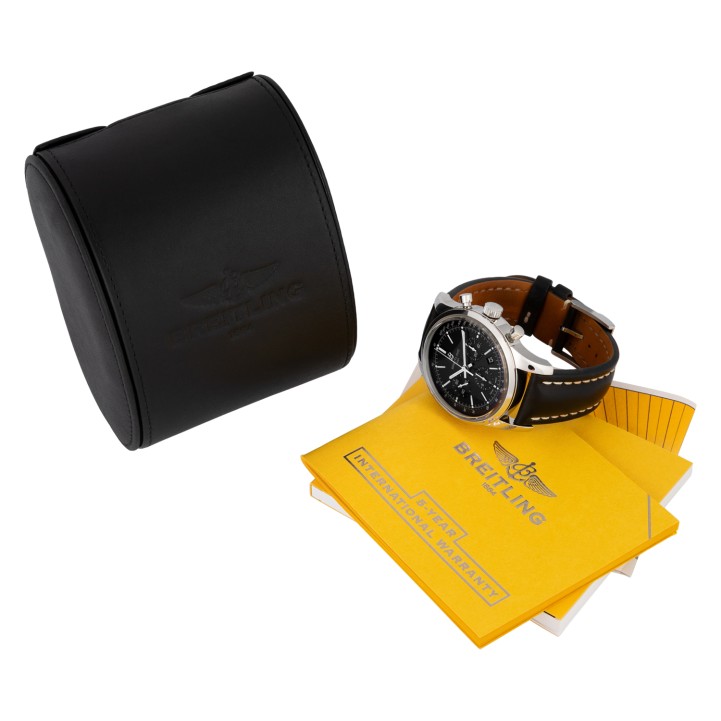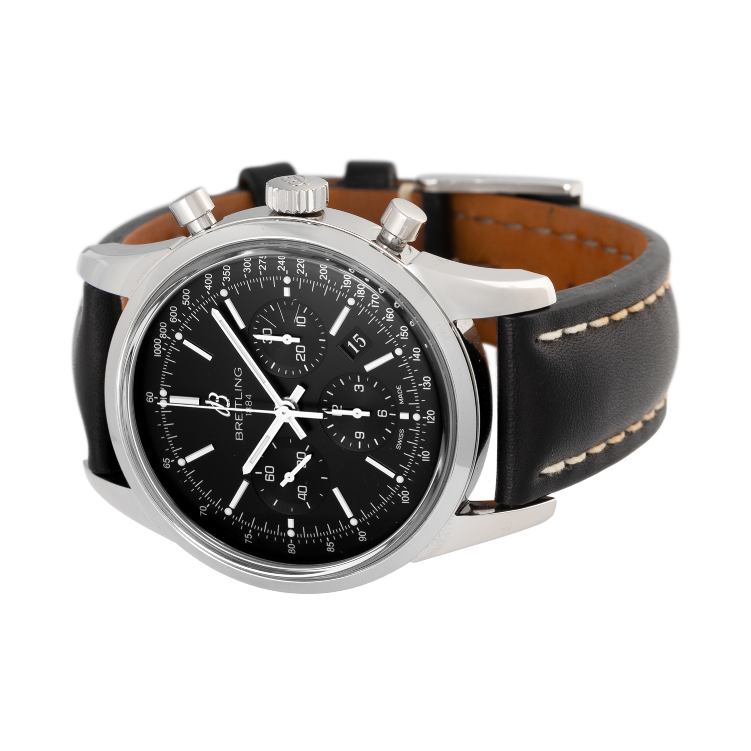 BREITLING Transocean Chronograph Ref. AB0152. First purchased on December 1, 2012, from Hunke in Ludwigsburg. Stainless steel with sapphire crystal case back. Automatic movement with very good accuracy (+1 sec., 265° amplitude). Black dial with baton indices and date display. Original leather strap with pin buckle. Good condition, slight signs of wear. Original box, instructions, warranty and chronometer certificate, and original purchase receipt included. Diameter approx. 43 mm, measured without crown.