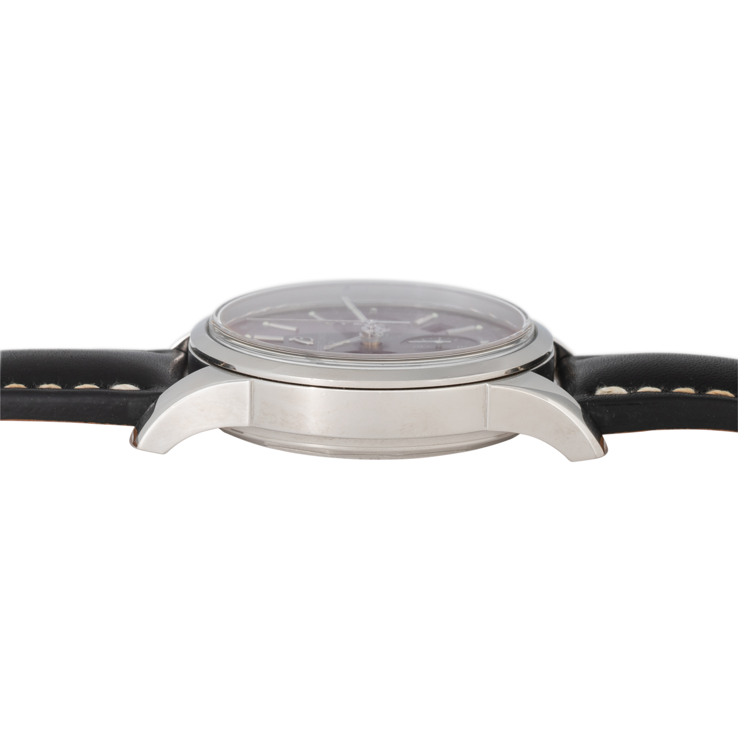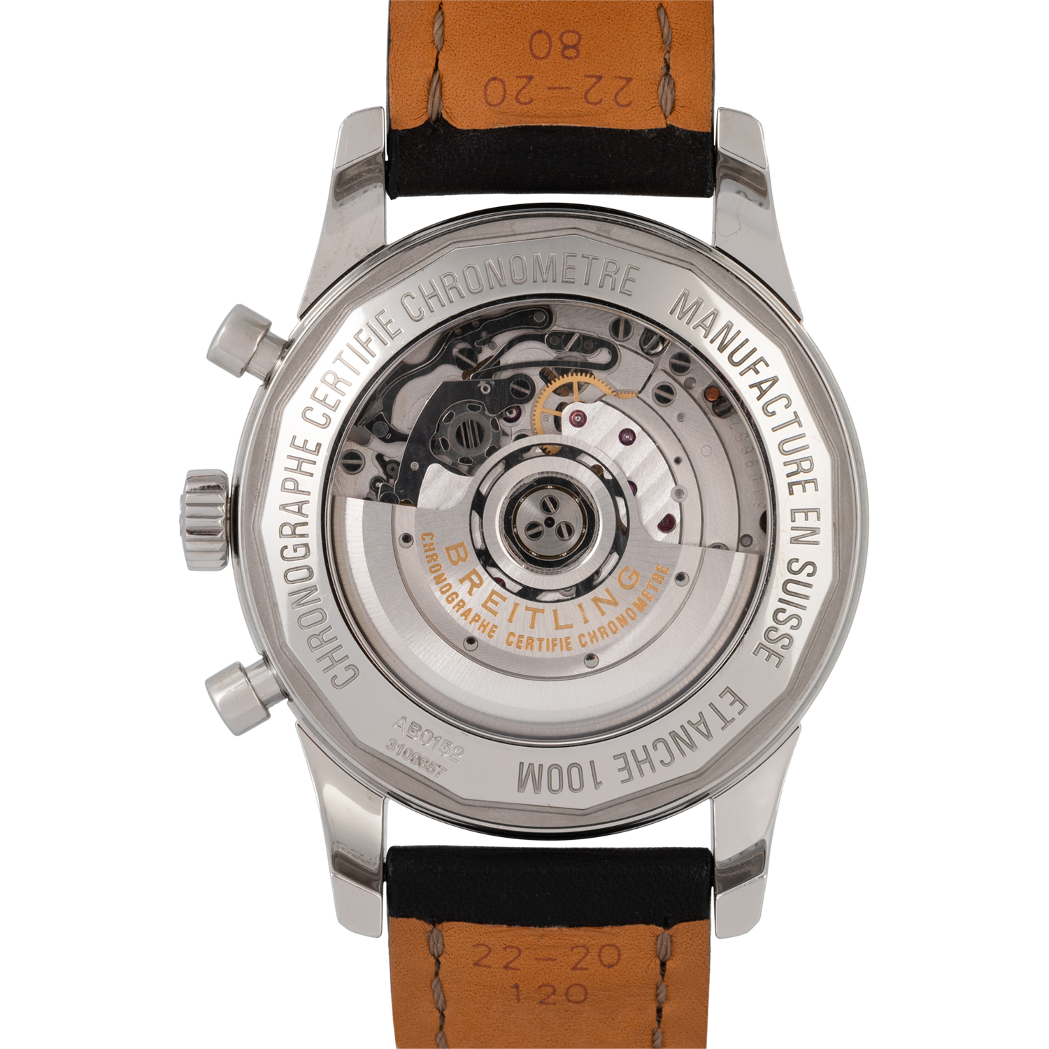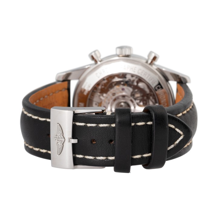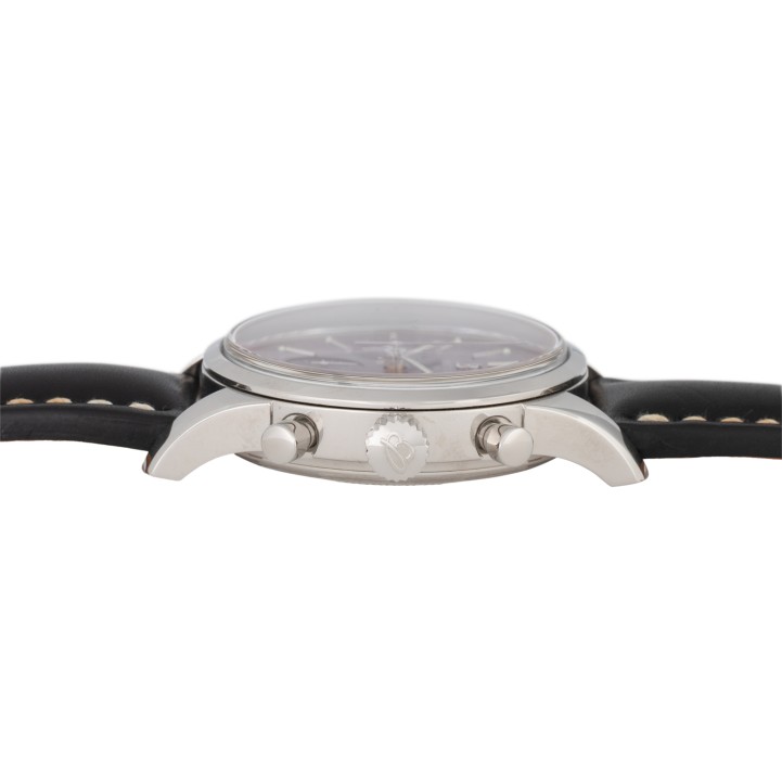 BREITLING Transocean Chronograph Ref. AB0152. First purchased on December 1, 2012, from Hunke in Ludwigsburg. Stainless steel with sapphire crystal case back. Automatic movement with very good accuracy (+1 sec., 265° amplitude). Black dial with baton indices and date display. Original leather strap with pin buckle. Good condition, slight signs of wear. Original box, instructions, warranty and chronometer certificate, and original purchase receipt included. Diameter approx. 43 mm, measured without crown.