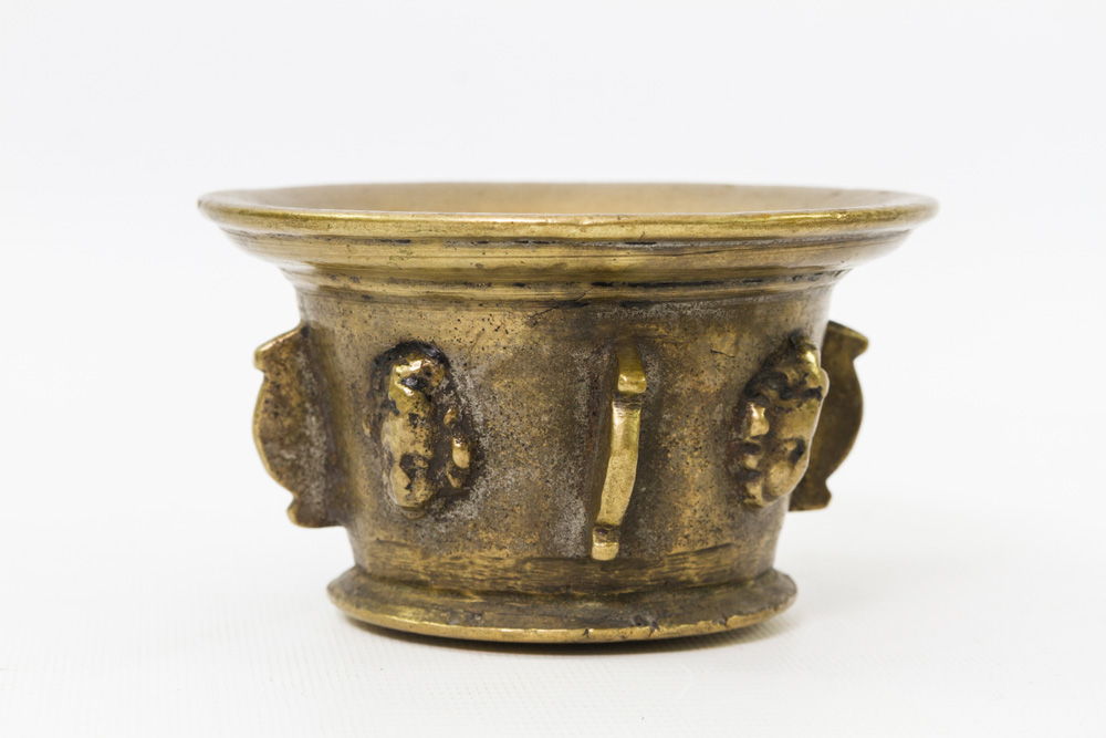 BRONZE CUP WITH PISTILL 16th/17th century, slightly conical body with flared mouth, the wall decorated with 4 curved ribs and mascarons in relief, h: 7 cm. Signs of age and use.