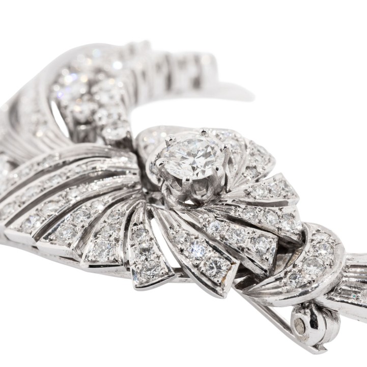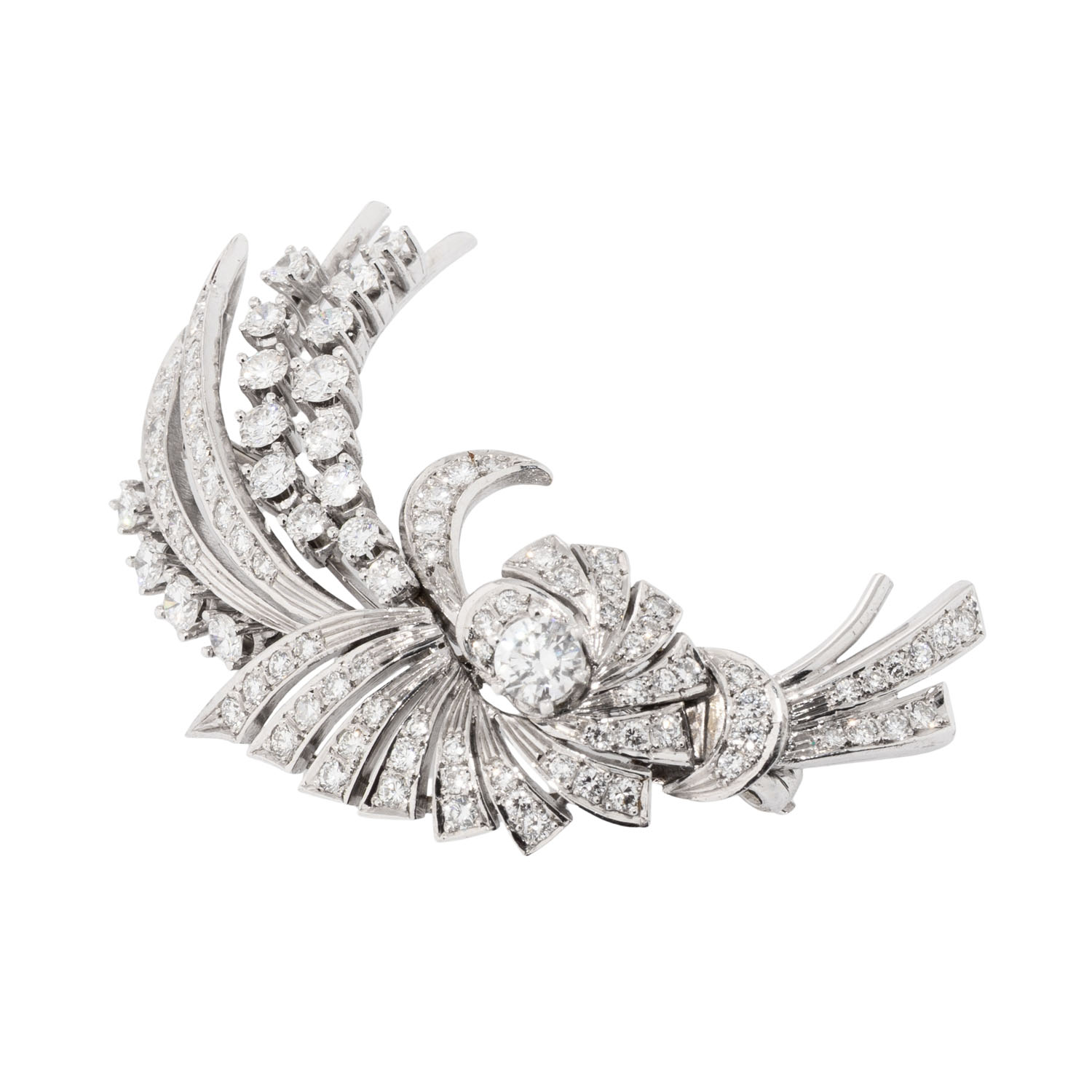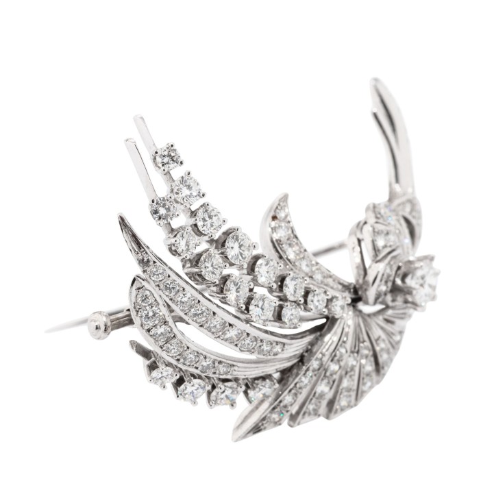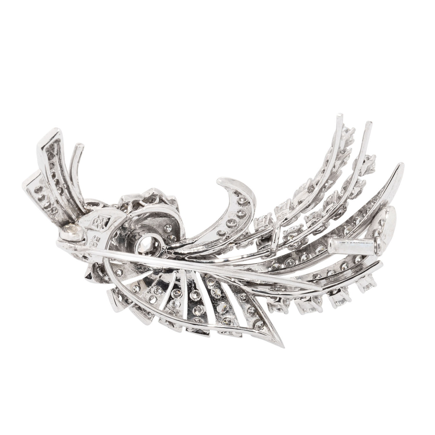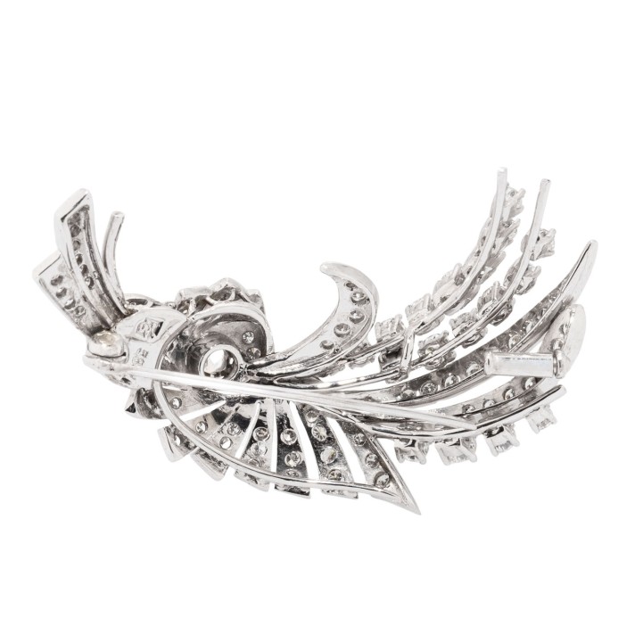 Brooch 'Bouquet'' with brilliant-cut diamonds totalling ca. 3 ct, of which 1x ca. 0.35 ct, good colour and clarity, 14K white gold, 13.2 g, 5x3 cm, 2nd half of 20th century, good condition, handcrafted.