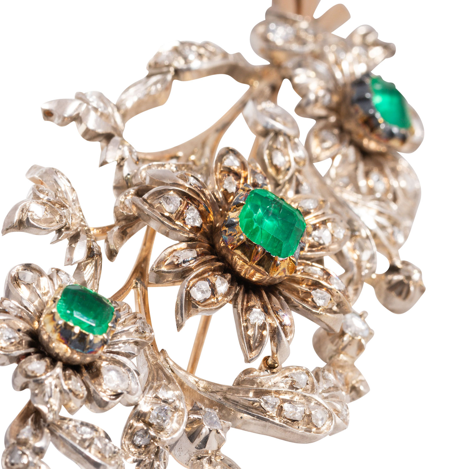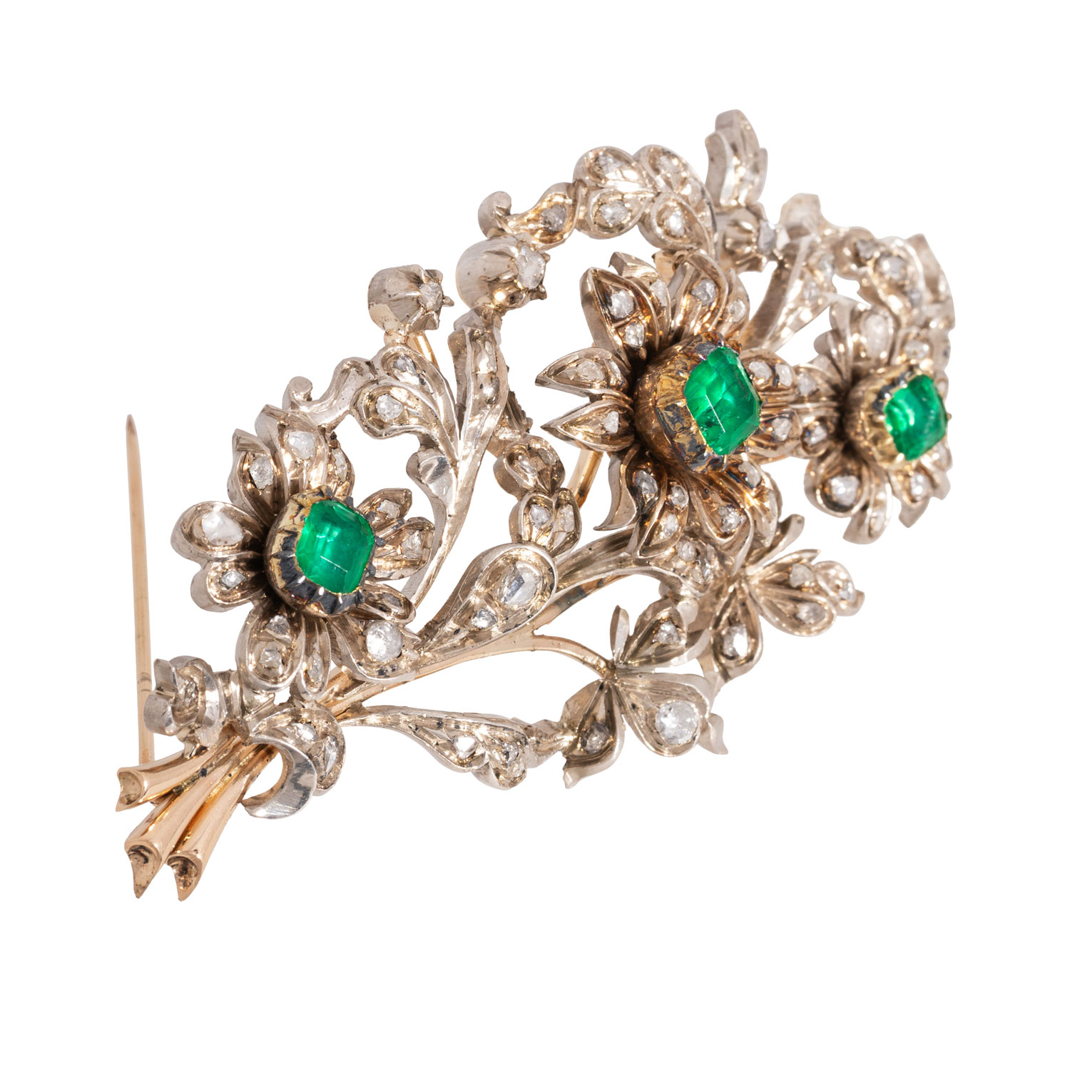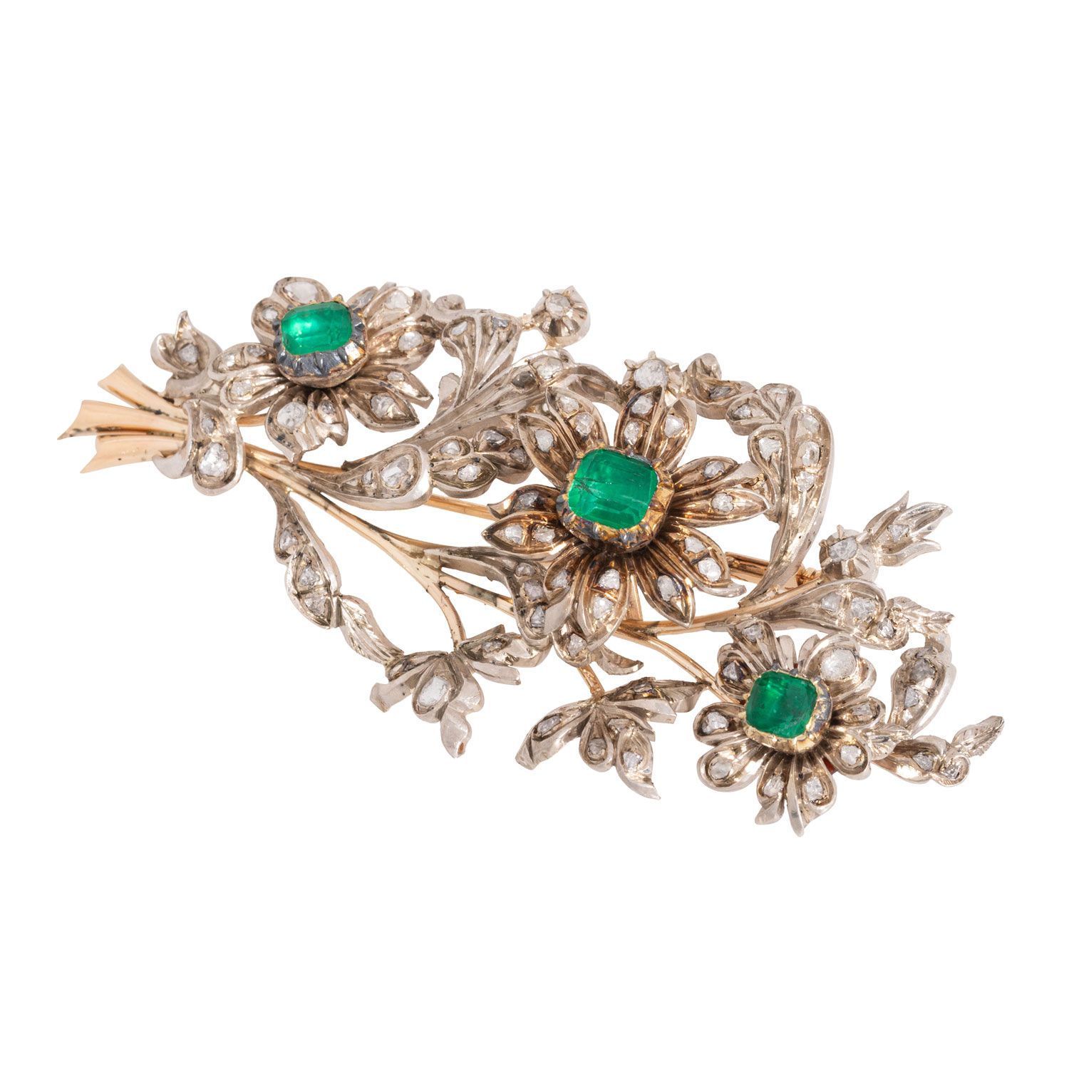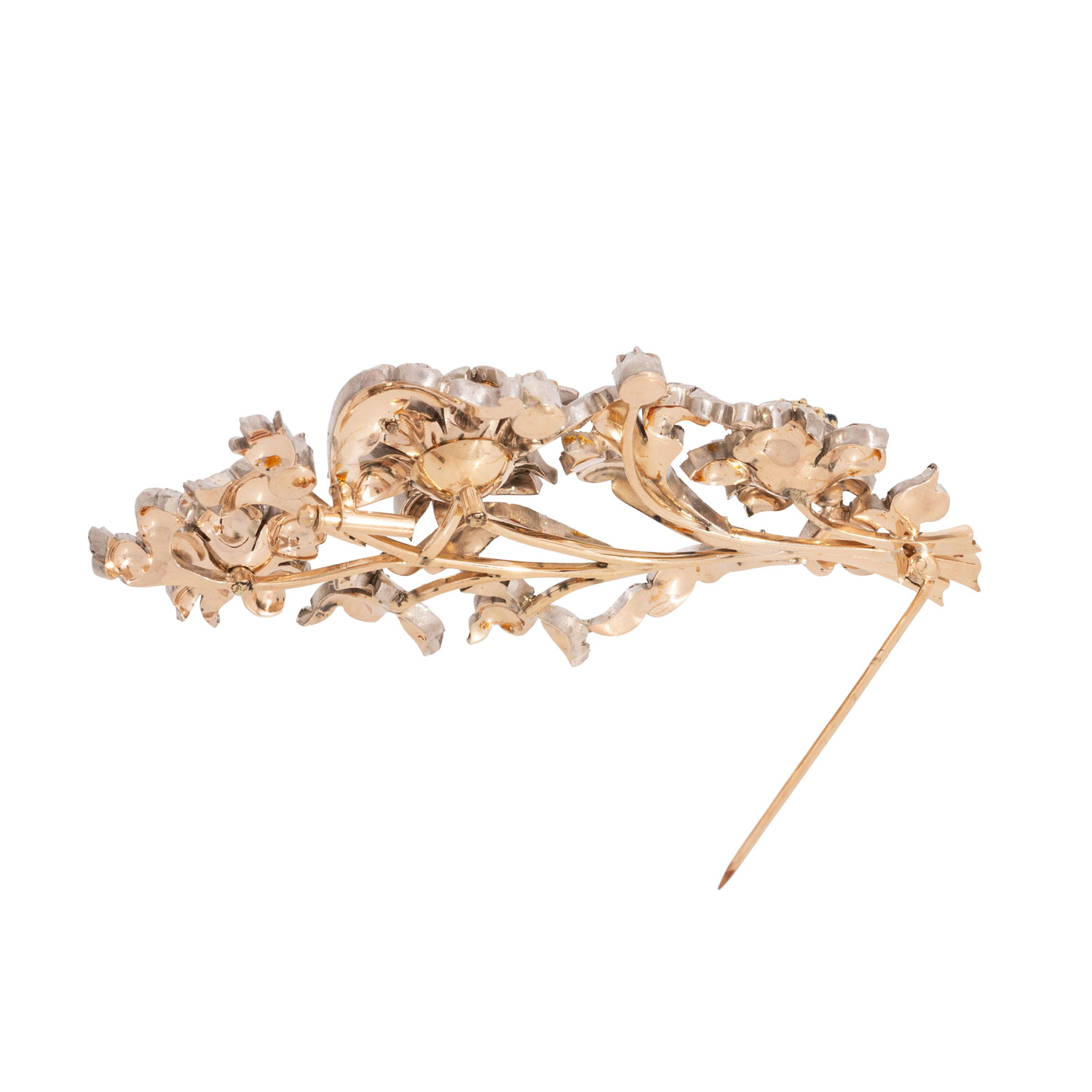 Brooch 'Flower bouquet' with 3 colourless, perhaps synthetic, beryls, green foiled, and rose-cut diamonds totalling ca. 1.5 ct, low colour and clarity, 14K yellow gold, face side silver, 41.2 g, 8.5x4 cm, nice workmanship in the style of baroque, 20th century, good condition.