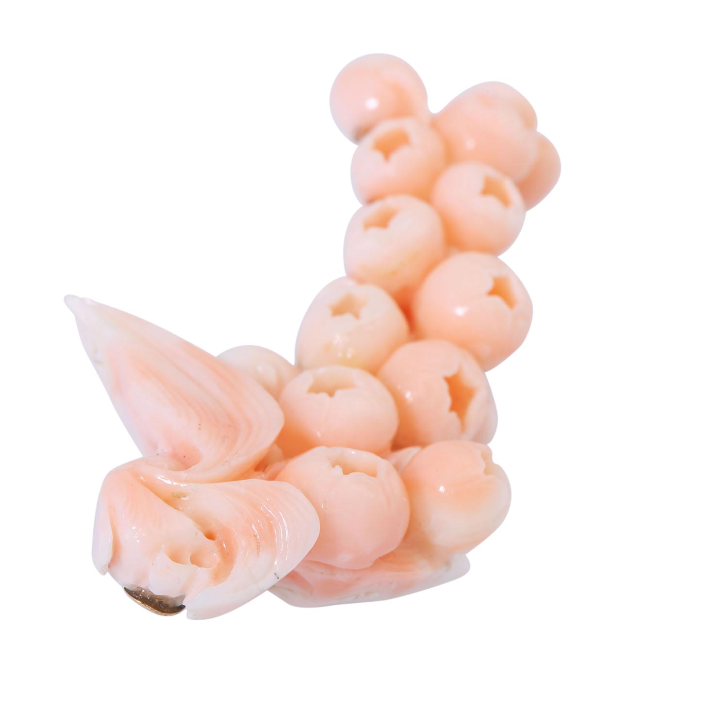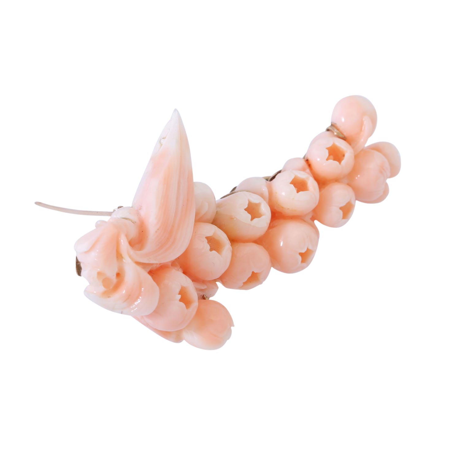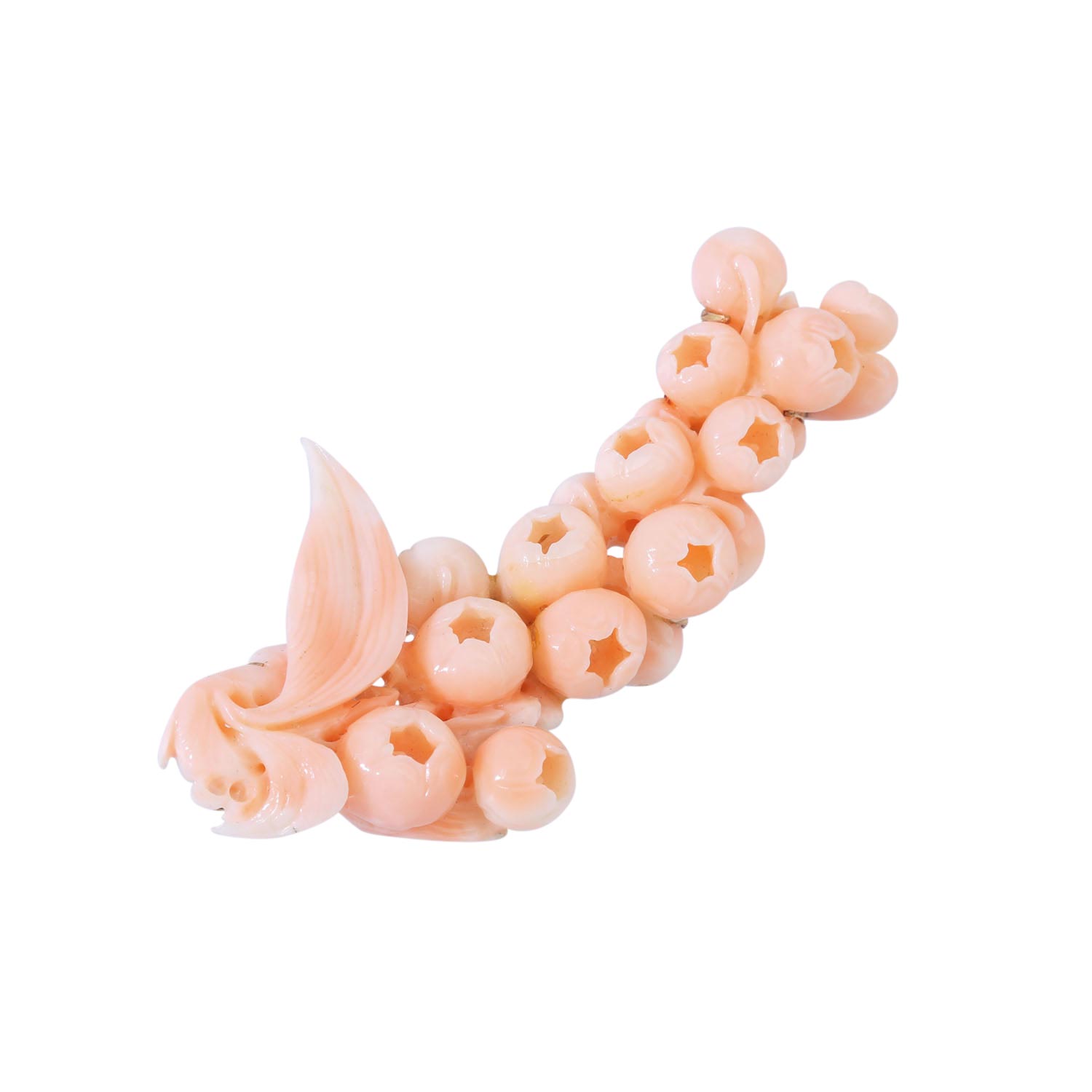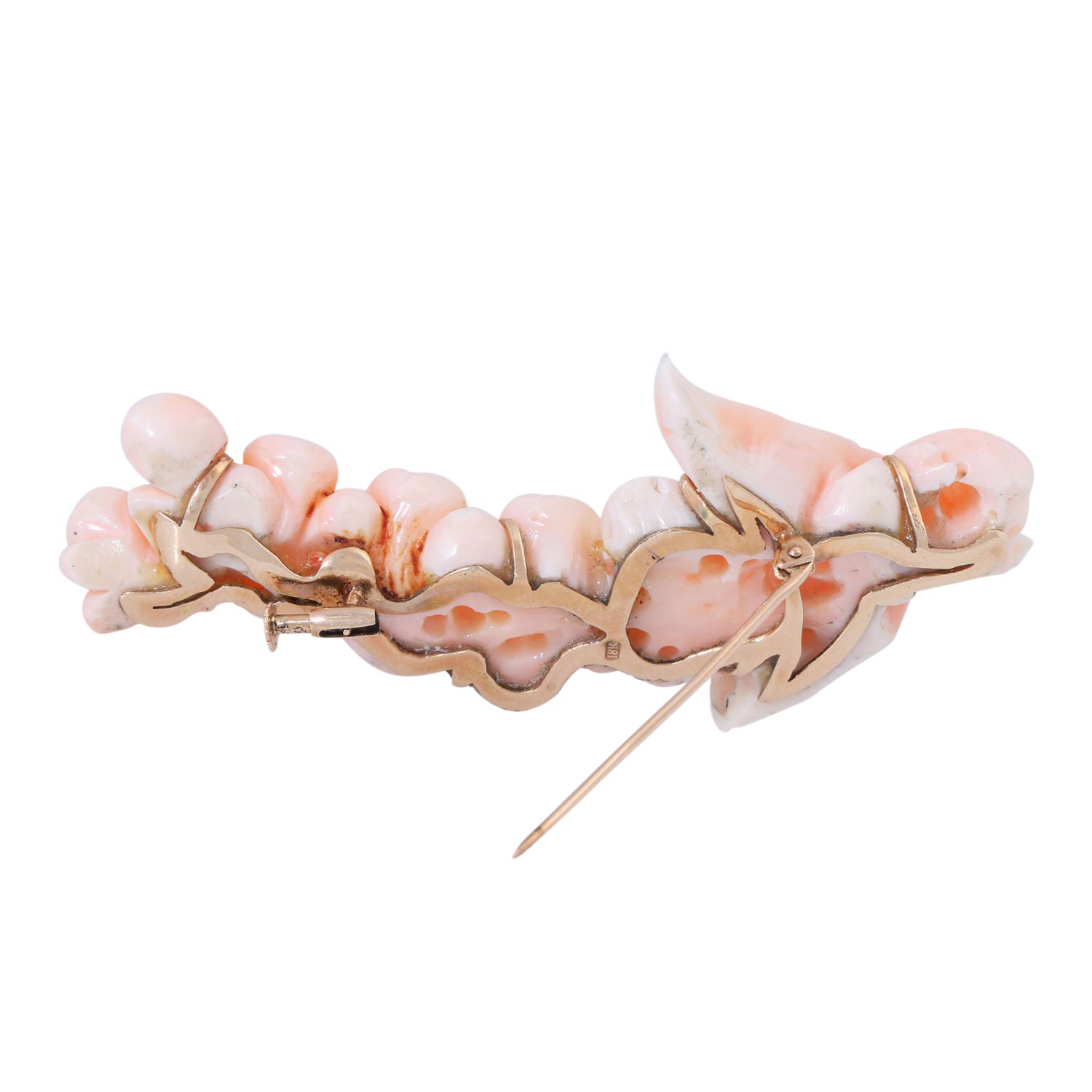 Brooch made of carved angel skin coral in shape of a flower branch, mounted on 18K RSG, L: ca. 8 cm, 31.3 gr, 1st half 20th century, signs of wear, some spots with smaller cracks. IMPORT/EXPORT RESTRICTIONS OUTSIDE THE EU!