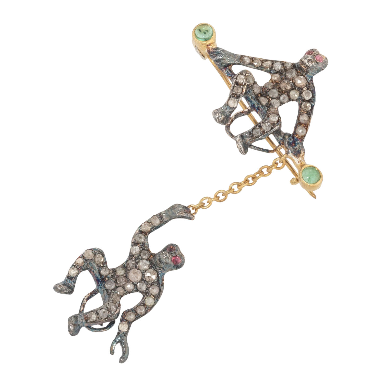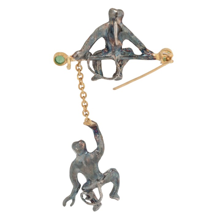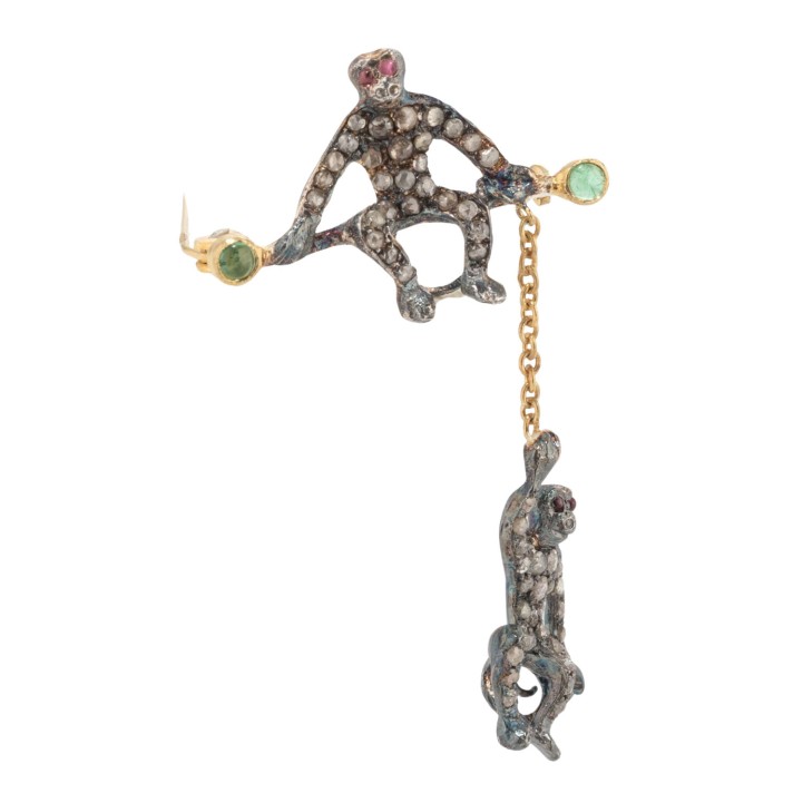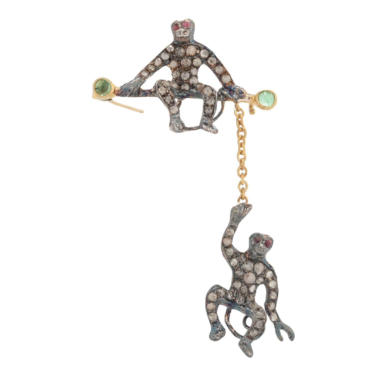 Brooch/pendant '2 Monkeys' with diamonds, emeralds and rubies, silver blackened with details of 9K yellow gold, 3.6 g, 2.5x5 cm, 21st century, minor signs of wear.