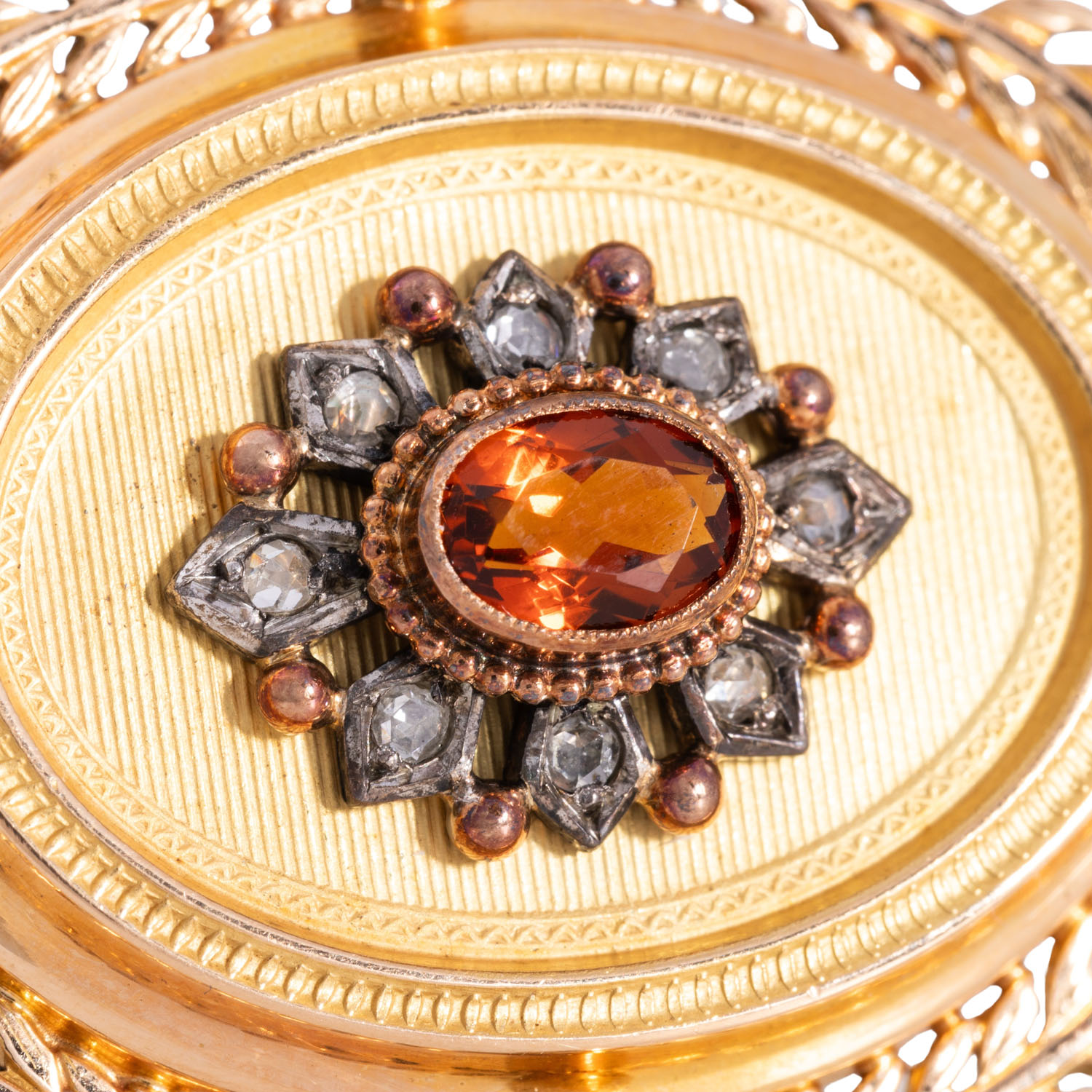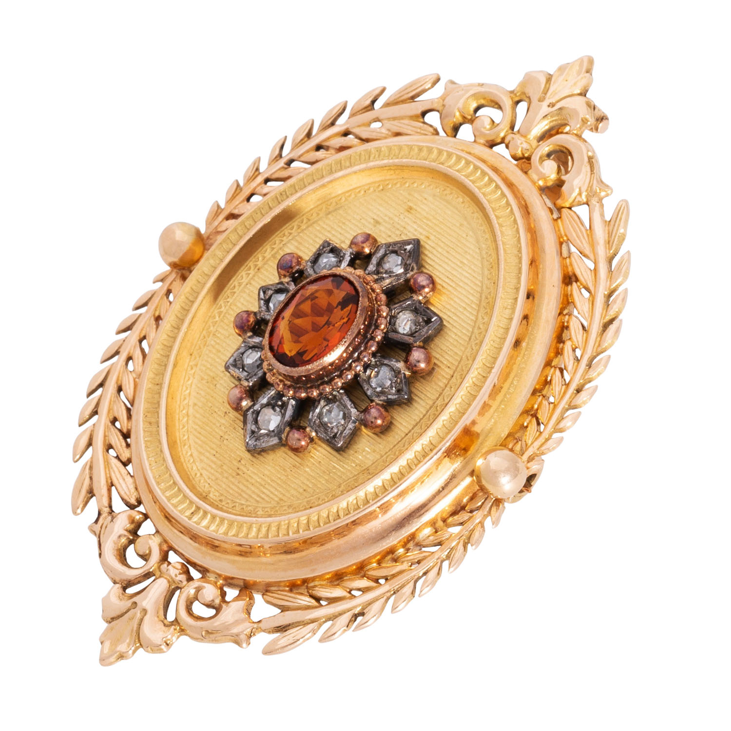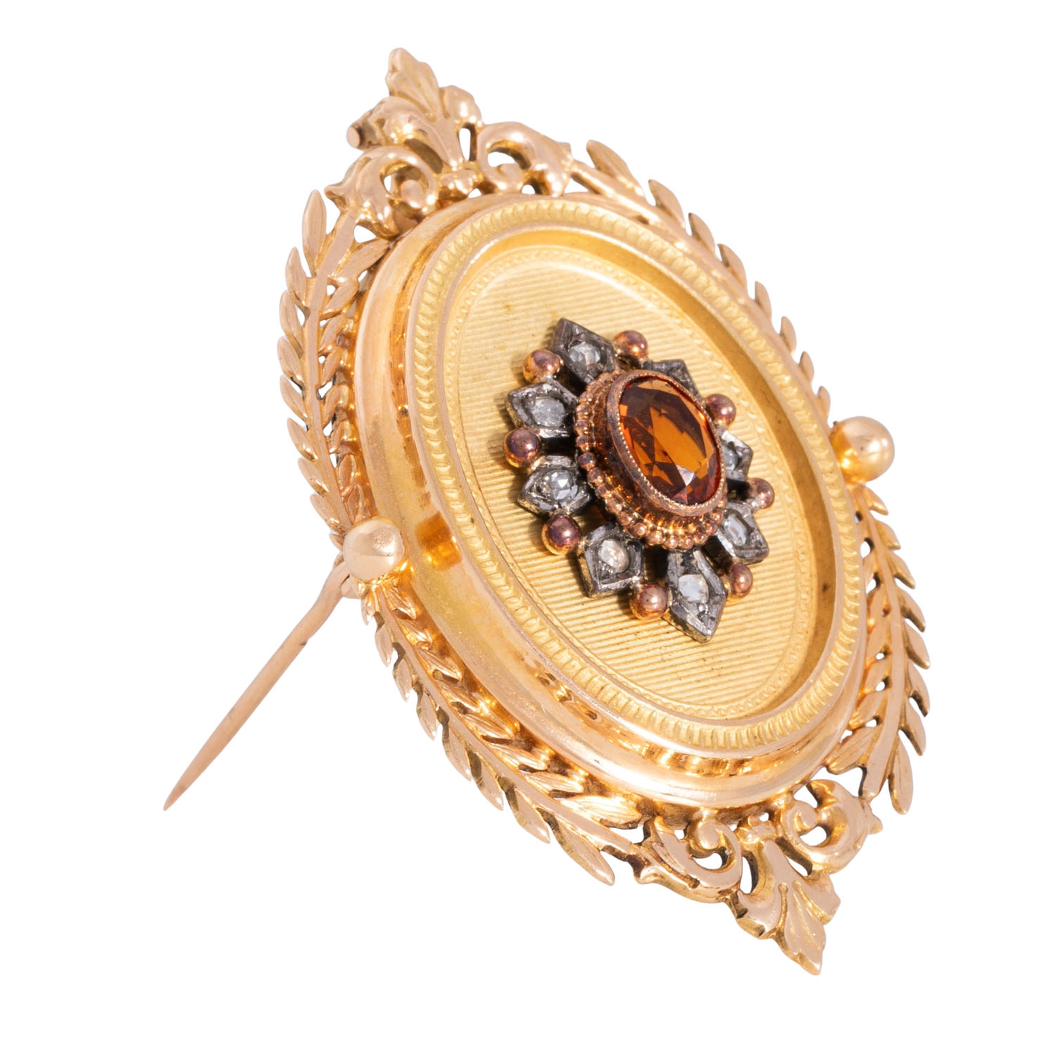 Brooch pendant with citrine and rose-cut diamonds, 18K YG, silver, 11.4 gr, measurements approx 58 x 31mm, late 20th century, good condition.