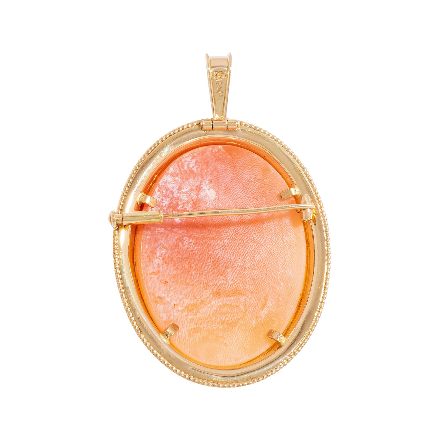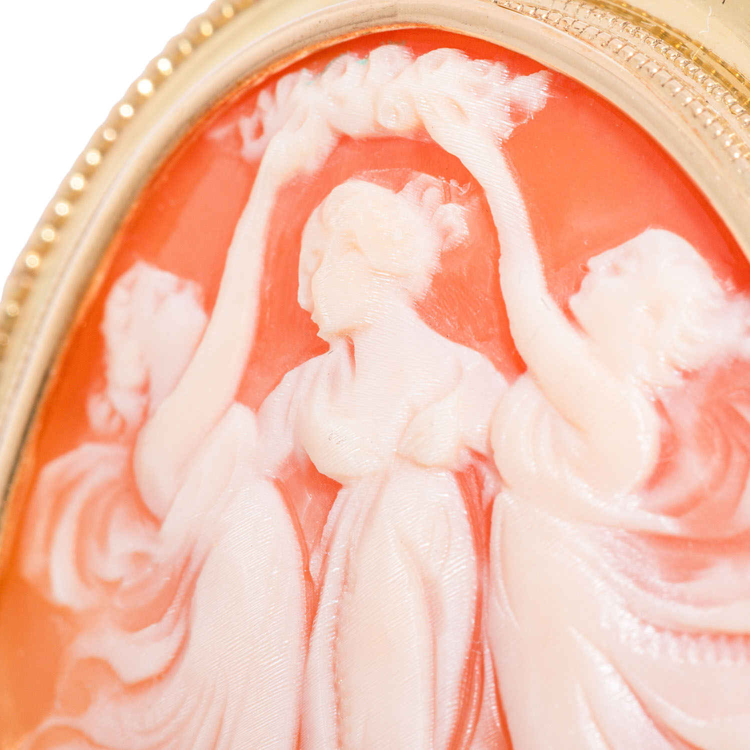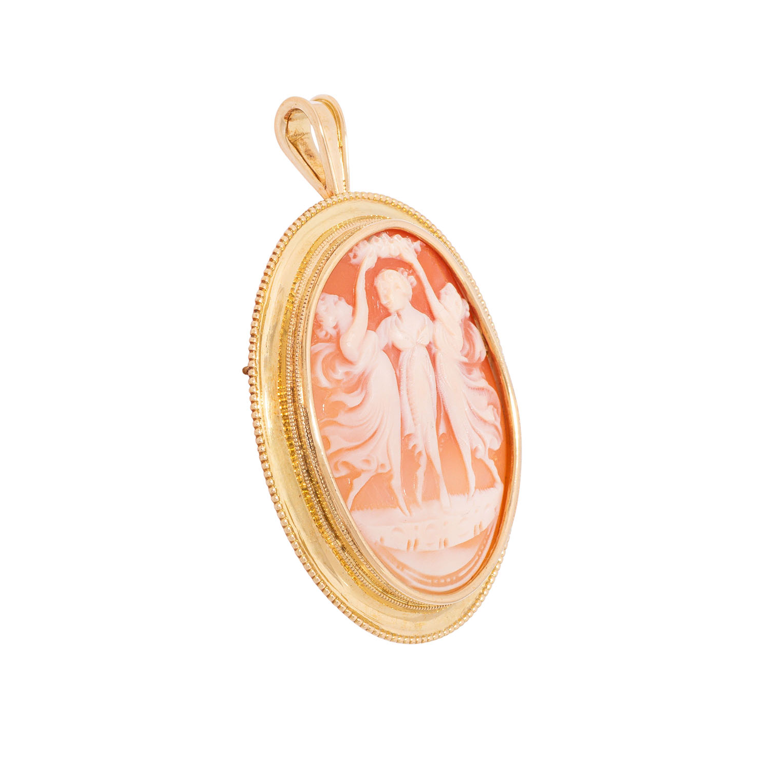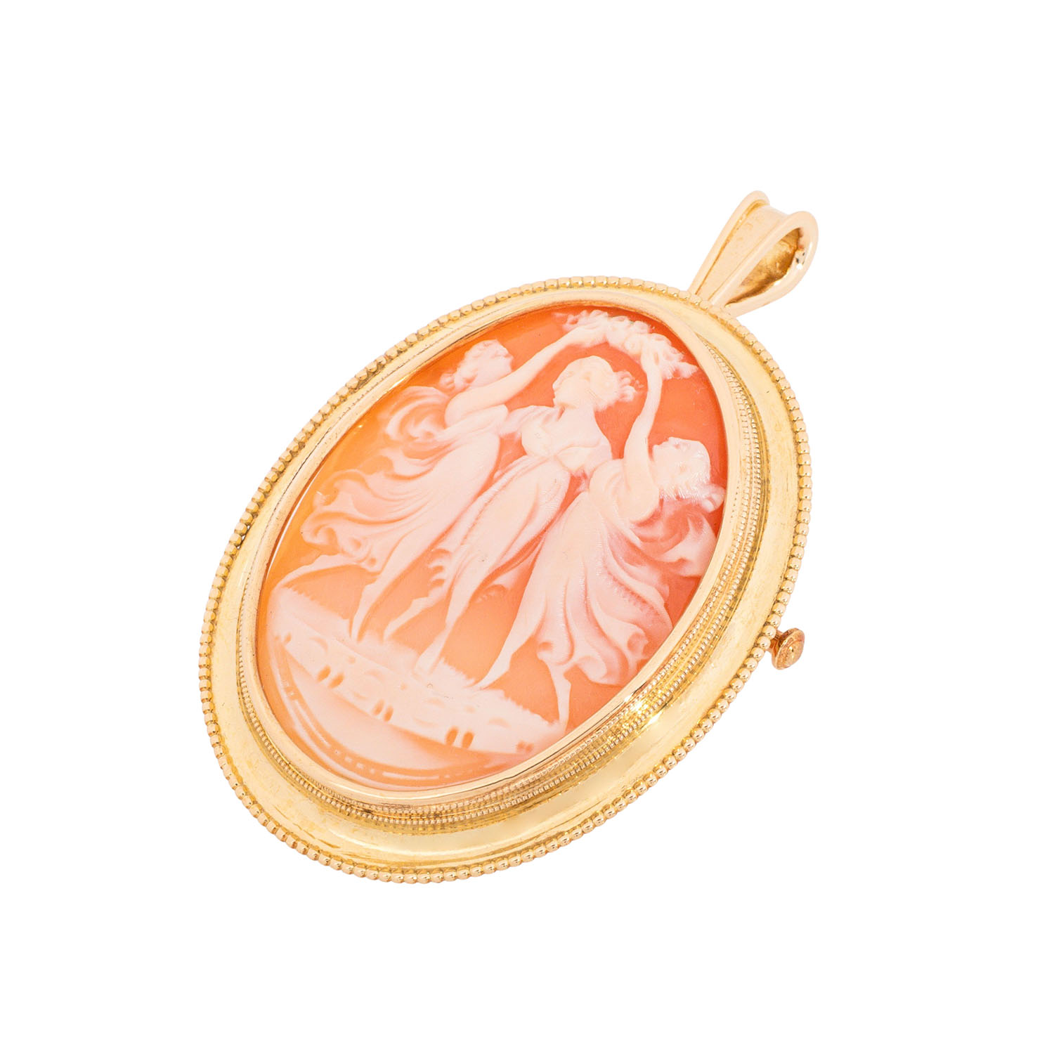 Brooch/Pendant with shell cameo 'Three graces', oval, ap. 35 x 27 mm, 18K yellow gold, 11.5 g, pendant loop can be folded down, L (pendant/brooch) x W: 53/42 x 33 mm, sliding safety catch, 2nd half of 20th century, minimal signs of wear.
