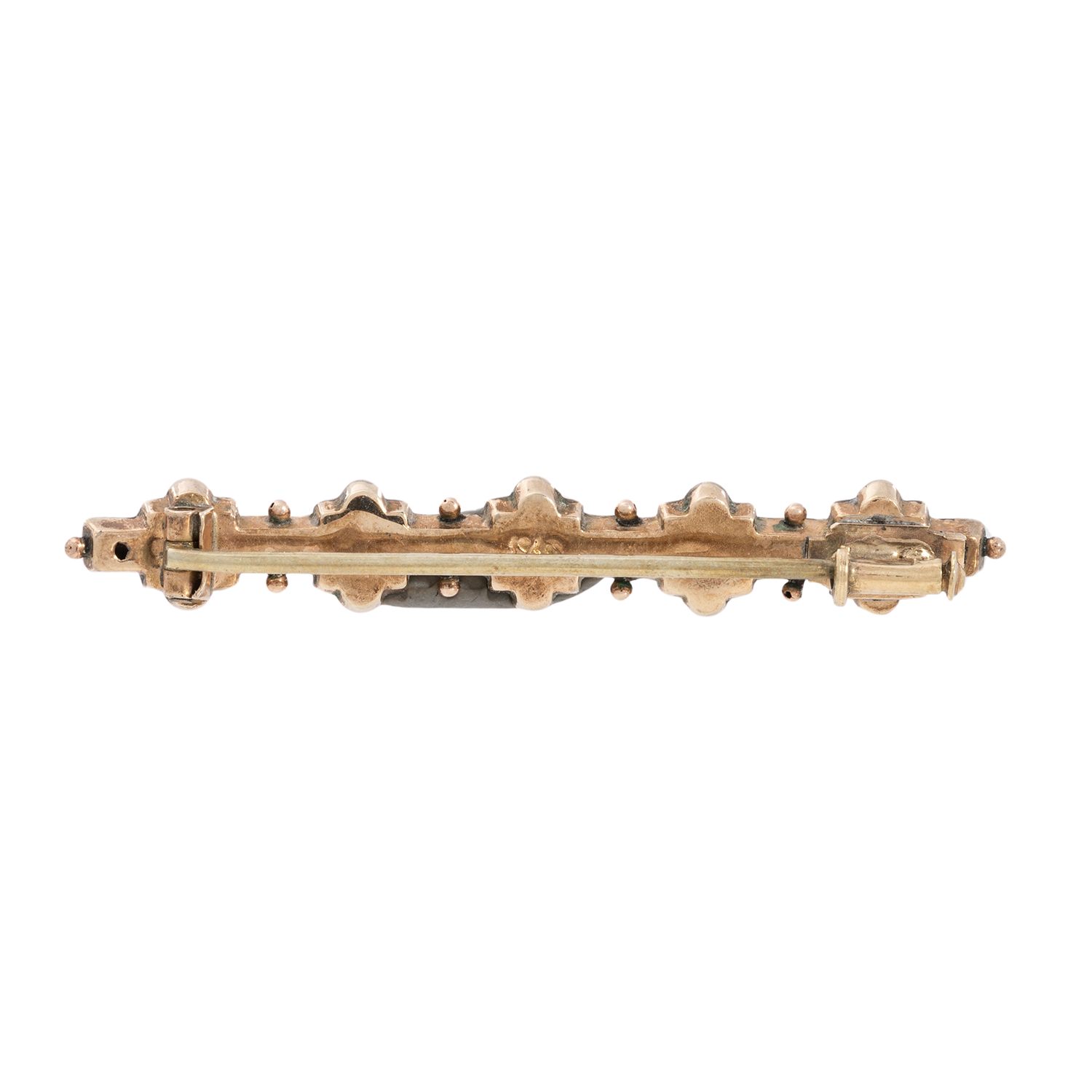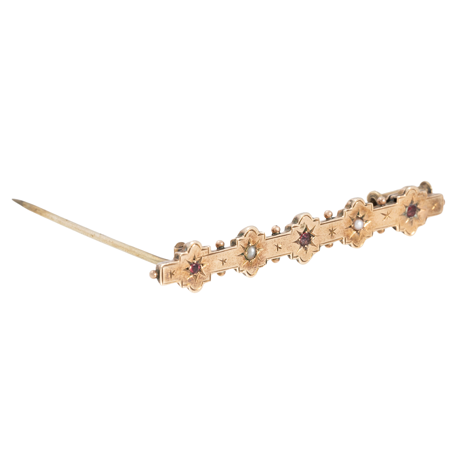 Brooch with 2 half pearls, 3 garnets, D: ap. 2 mm, 8K yellow gold, 1.7 g, L x W: ap. 46 x 7 mm, slide catch, 2nd half of 20th century, minor signs of wear.