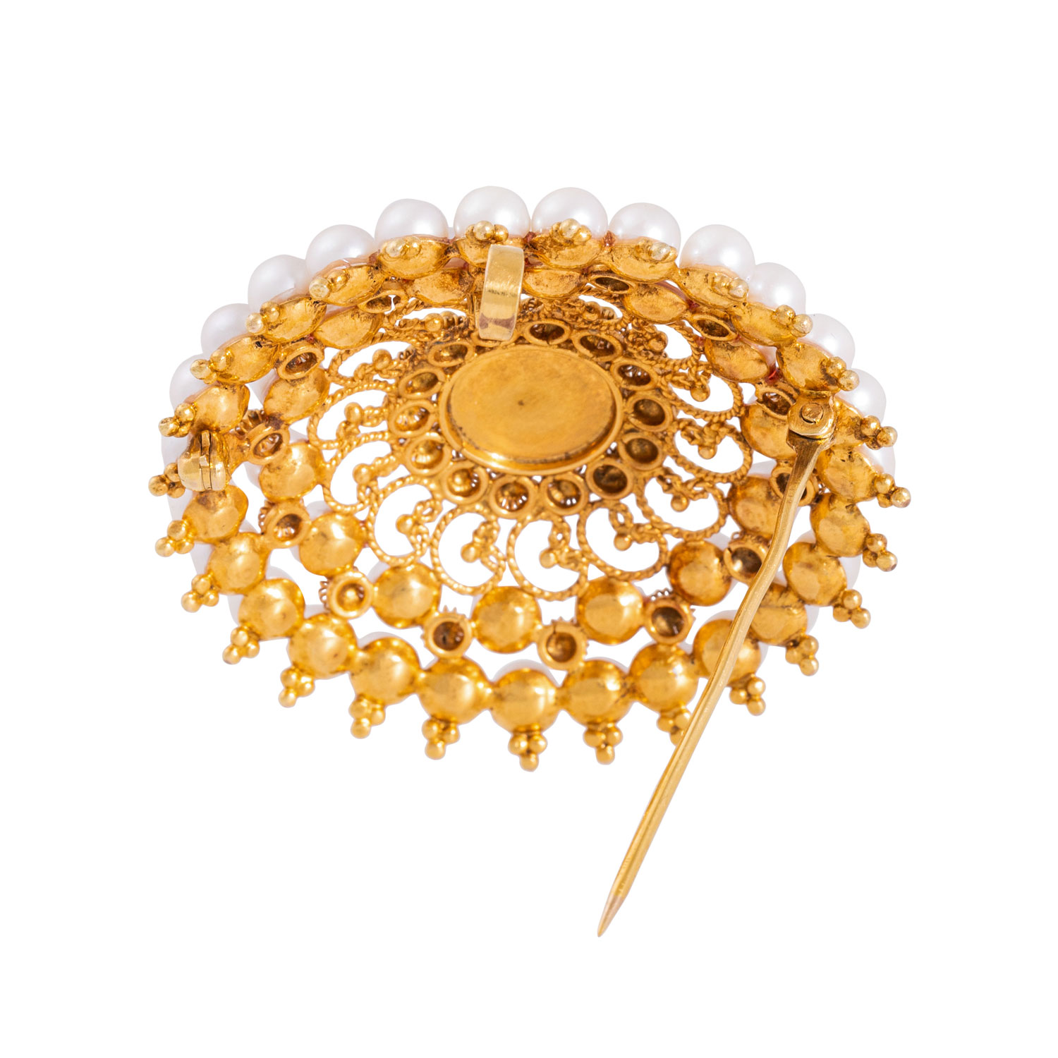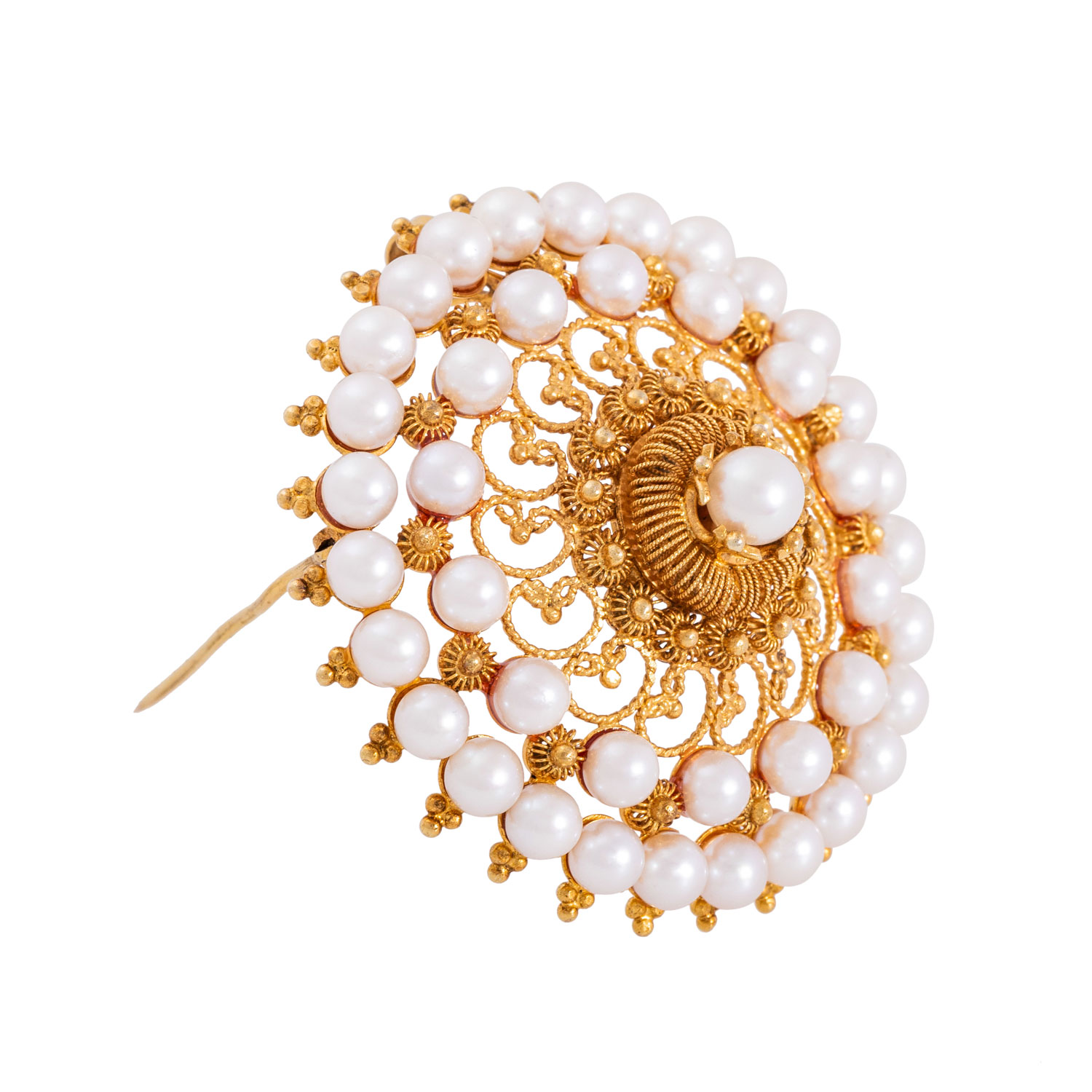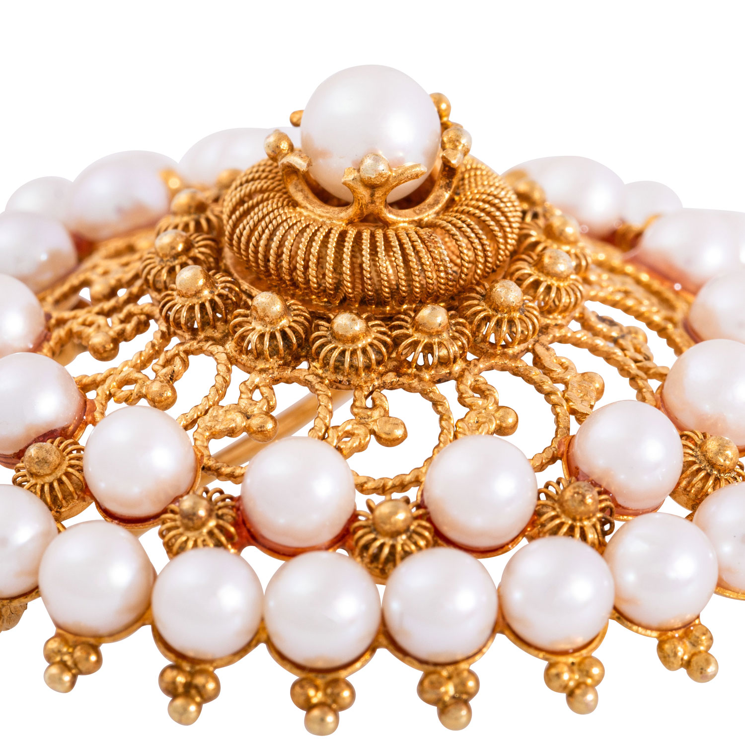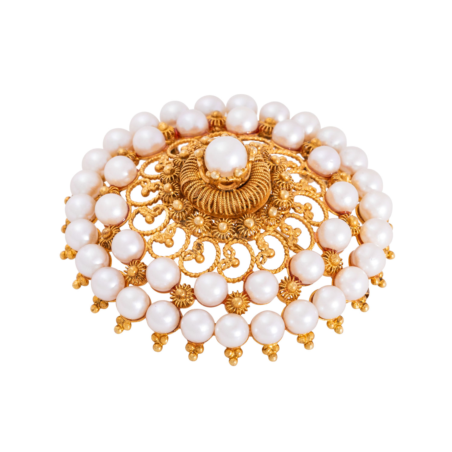 Brooch with 42 white cultured pearls, D: ap. 4.6 mm, filigree work, 14K yellow gold, 17.6 g, D: 48 mm, 2nd half of 20th century, minimal signs of wear.