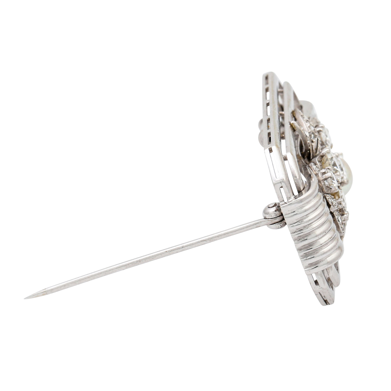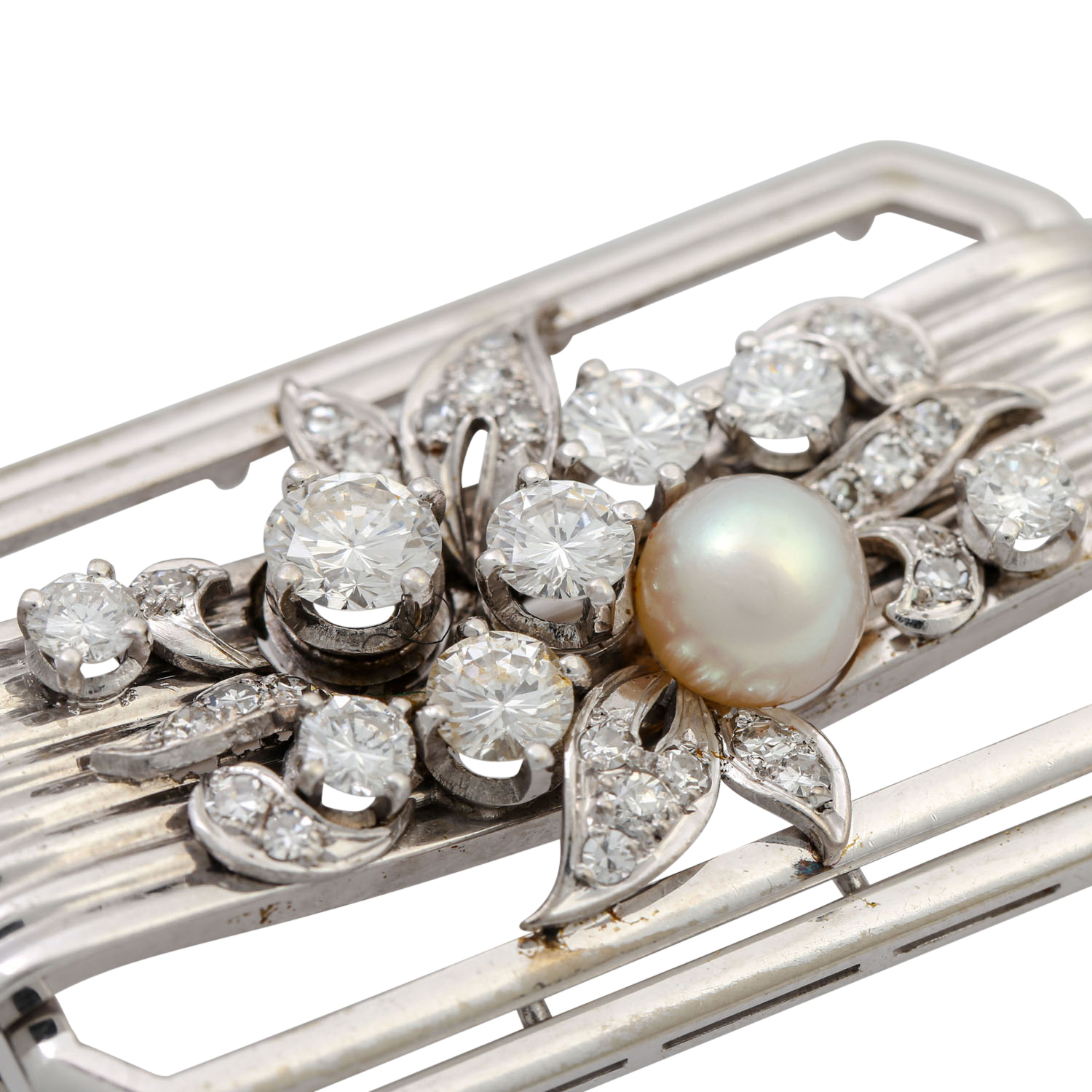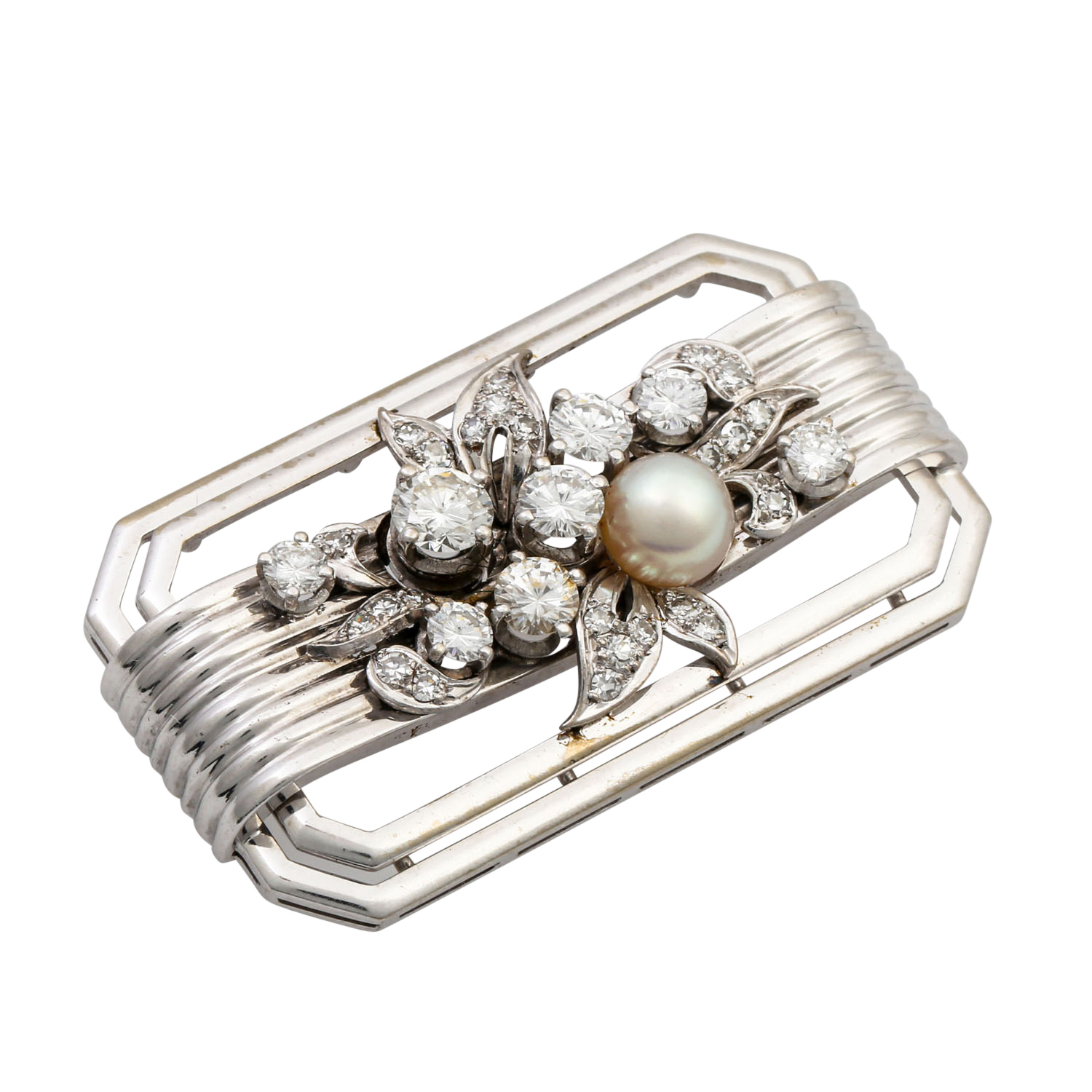 Brooch with 8 brilliant-cut diamonds totalling ca. 1.5 ct, further single-cut diamonds totalling ca. 0.5 ct, ca. RW (G)/VVS and 1 cultured pearl, 14K white gold, 12.4 g, 4.2x2.4 cm, 1st half of 20th century, minor signs of wear, handcrafted.