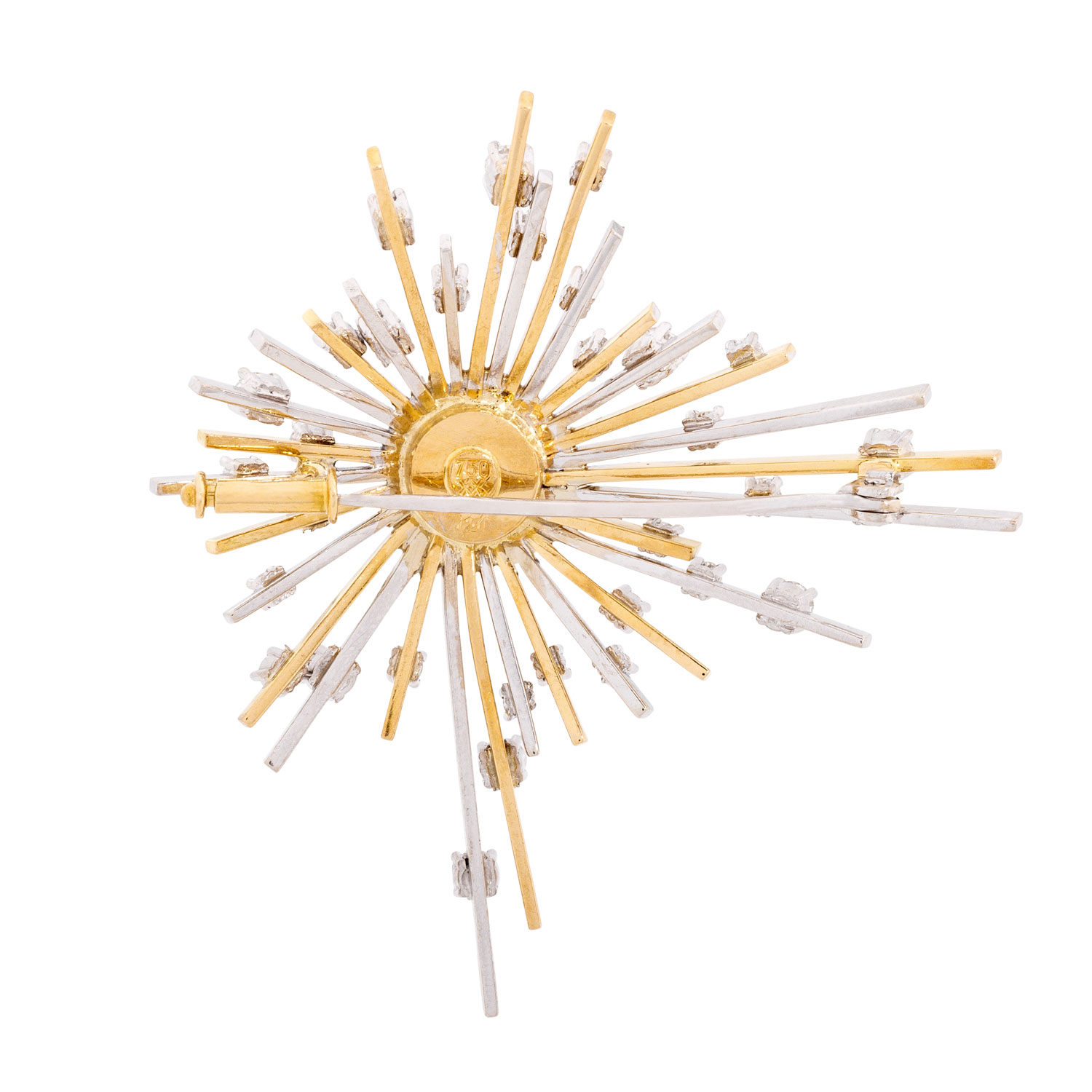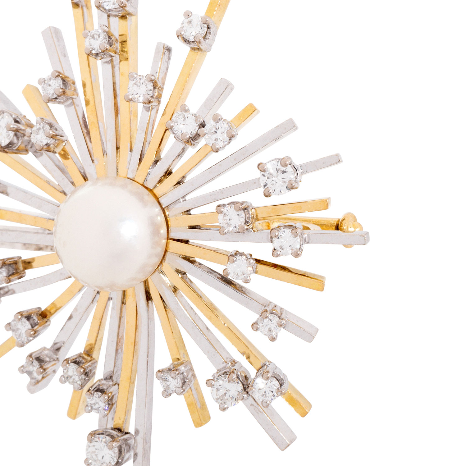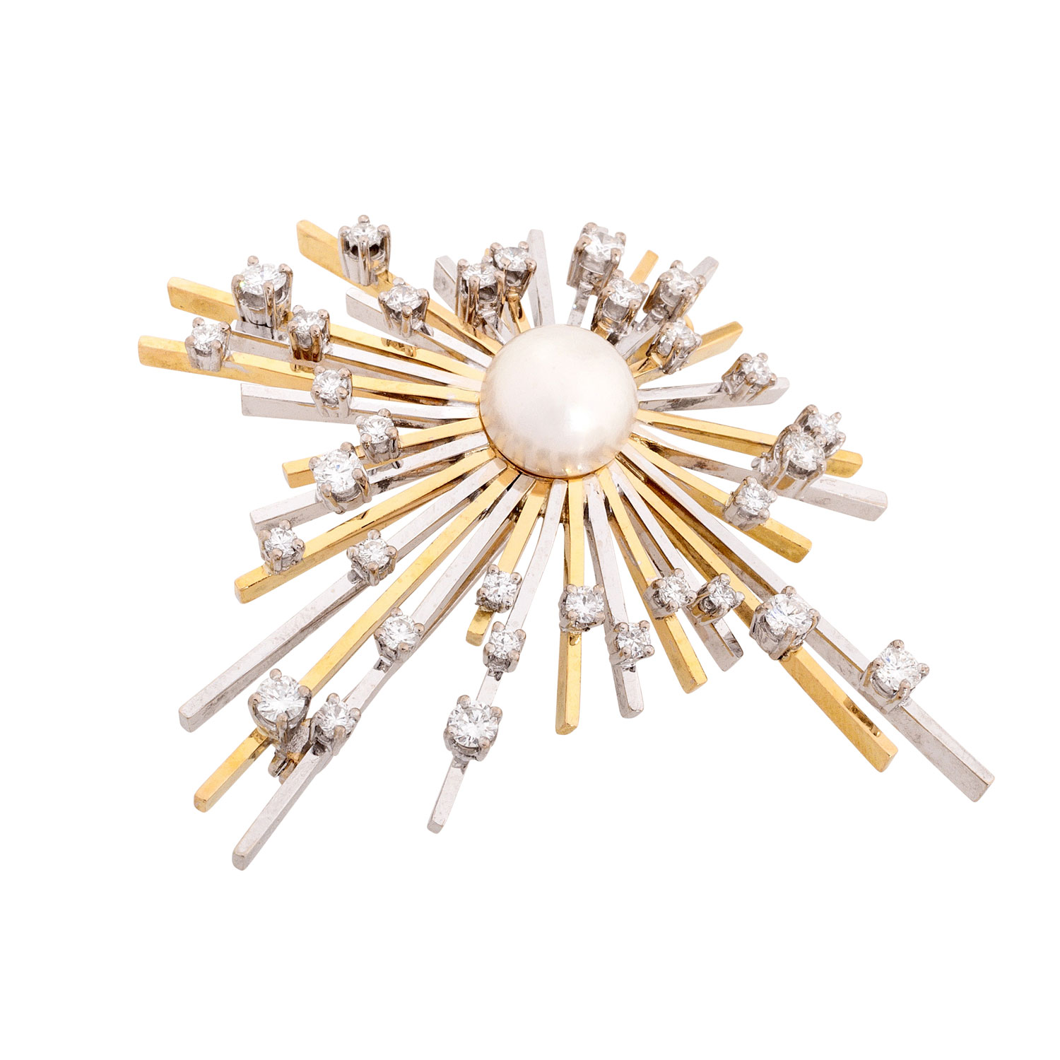 Brooch with cultured Akoya pearl ca. 8.6 mm, good lustre, brilliant-cut diamonds, totalling 1.21 ct (marked), good colour and clarity,18K yellow and white gold, 16 g, D: ca. 5 cm, mid 20th century, minor signs of wear.