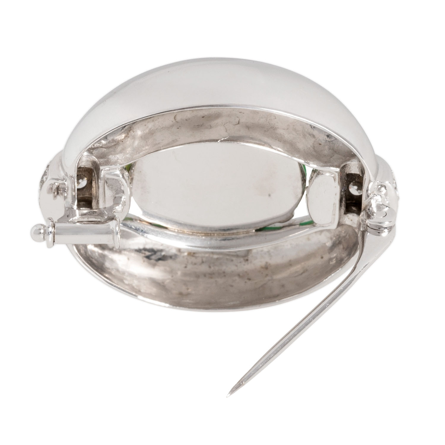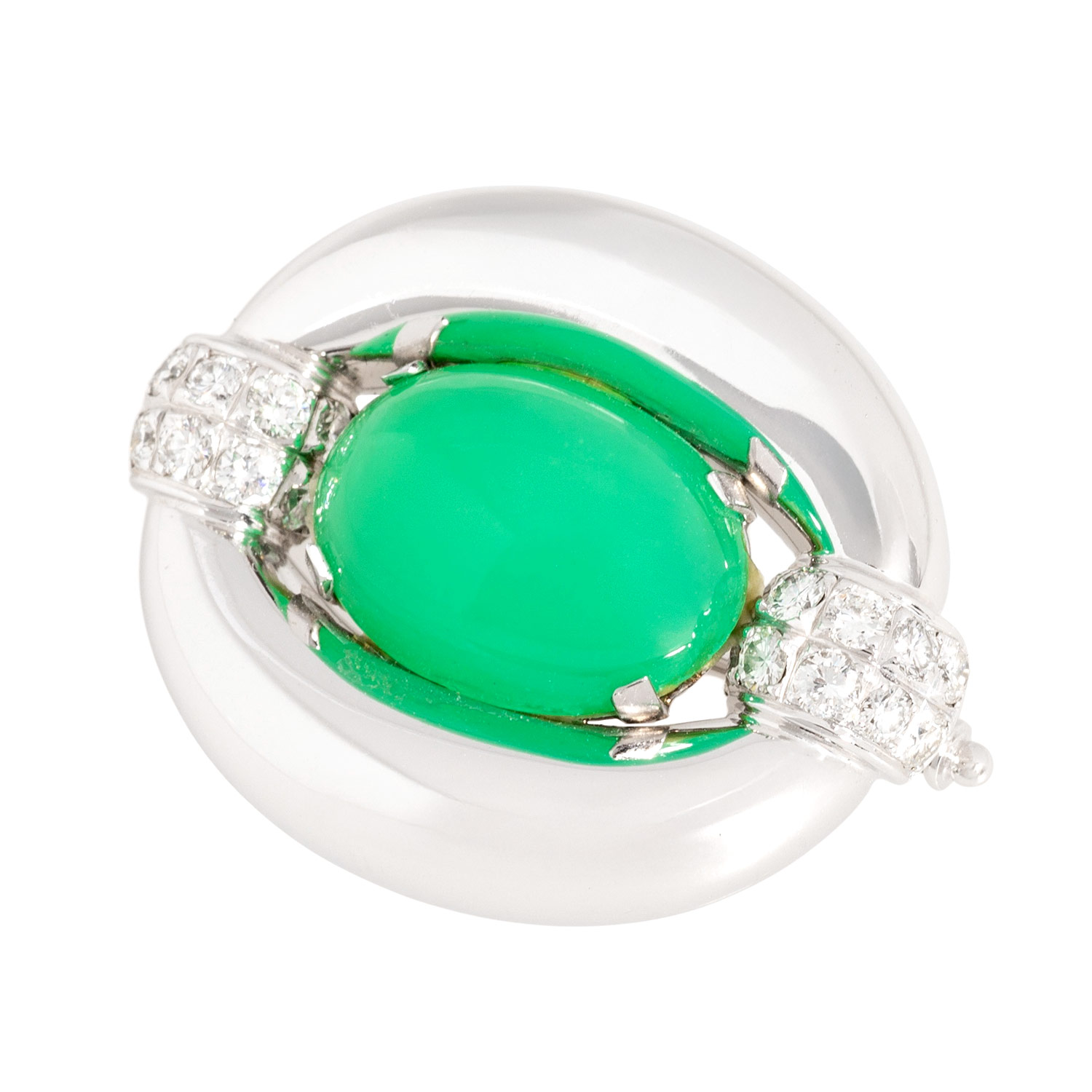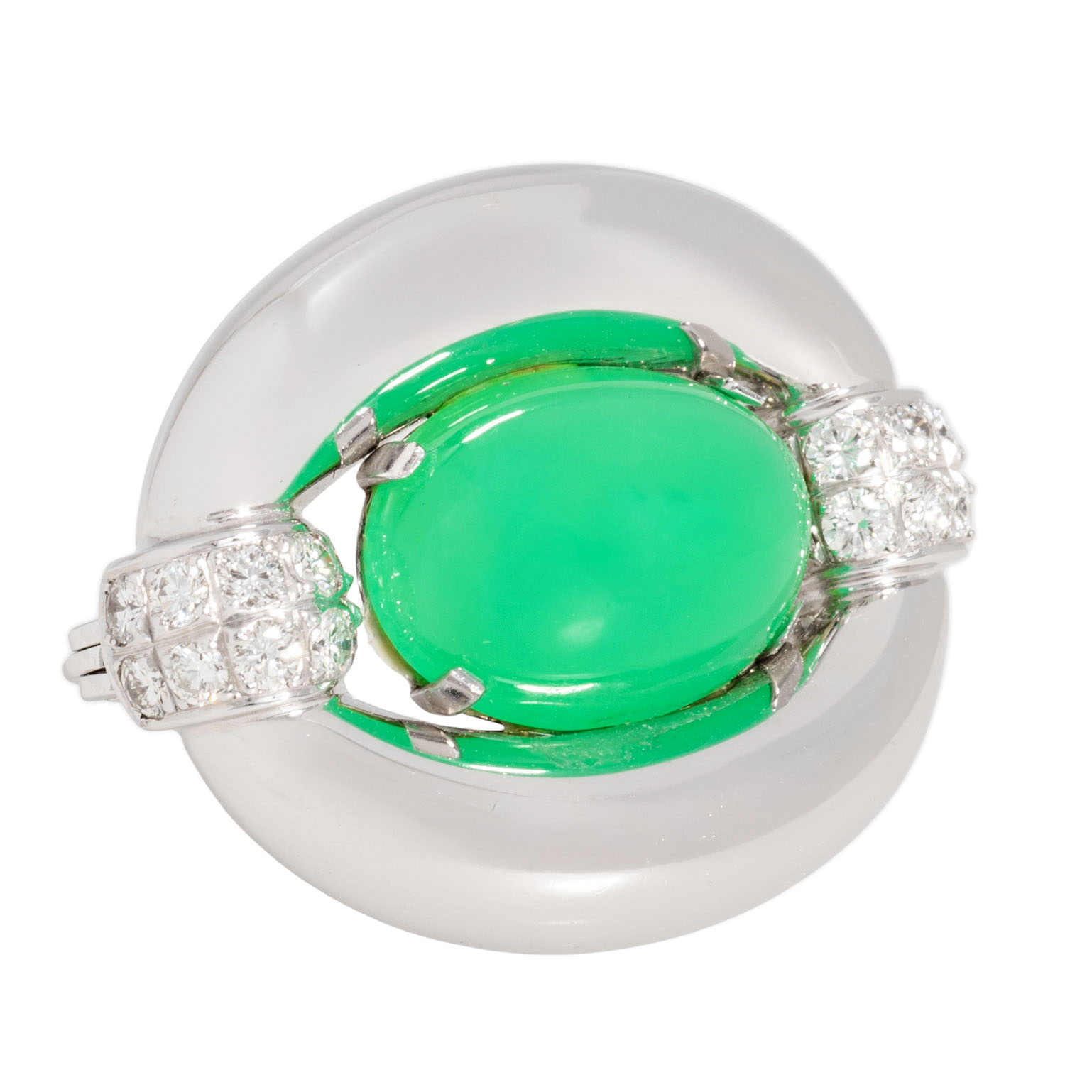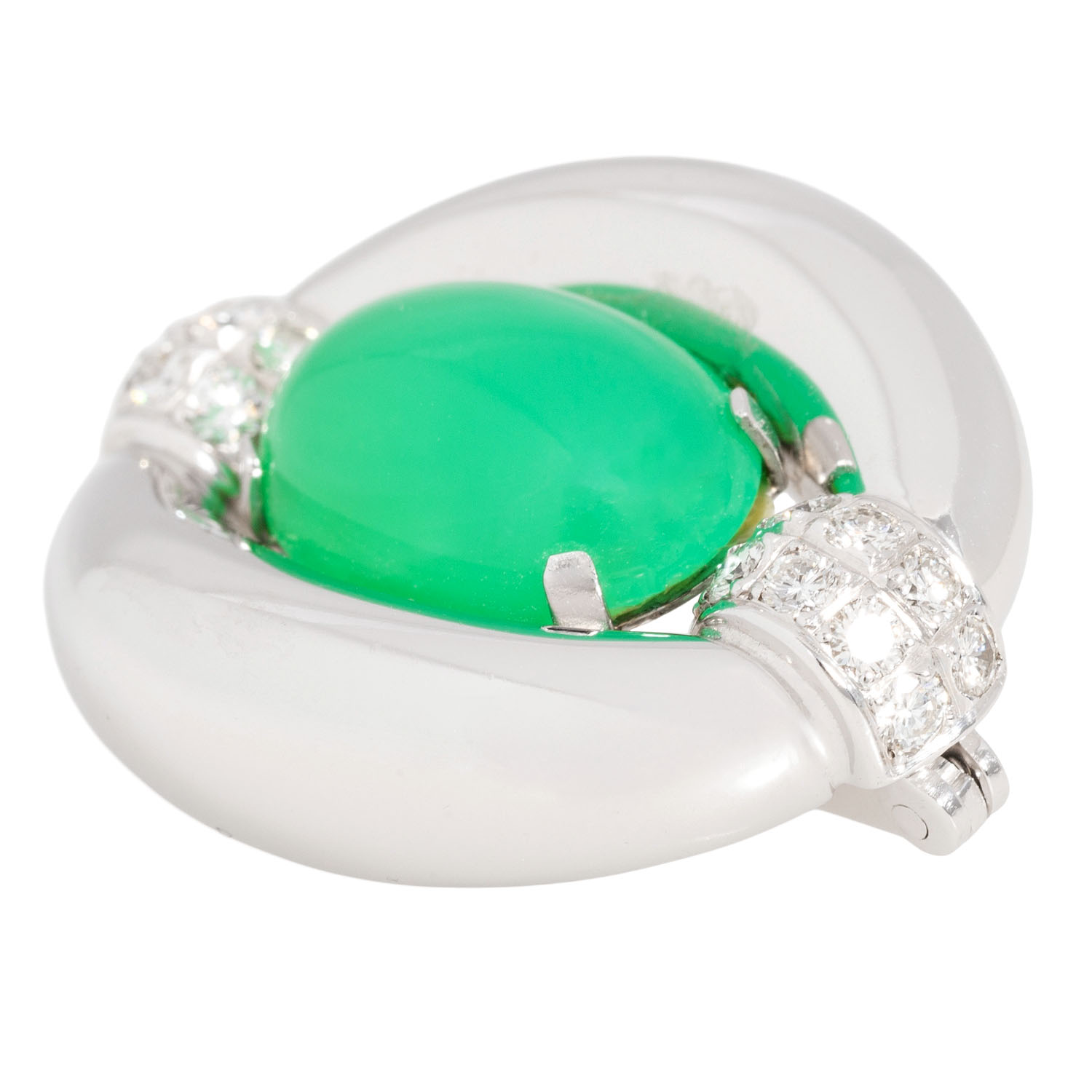 Brooch with chrysoprase, oval cabochon, ap. 16. x 12 mm, 16 brilliant cut diamonds, totalling ap. 0.78 ct, good colour and clarity, 18K white gold, 15.4 g, L x W: 26 x 32 mm, late 20th century, minimal signs of wear.