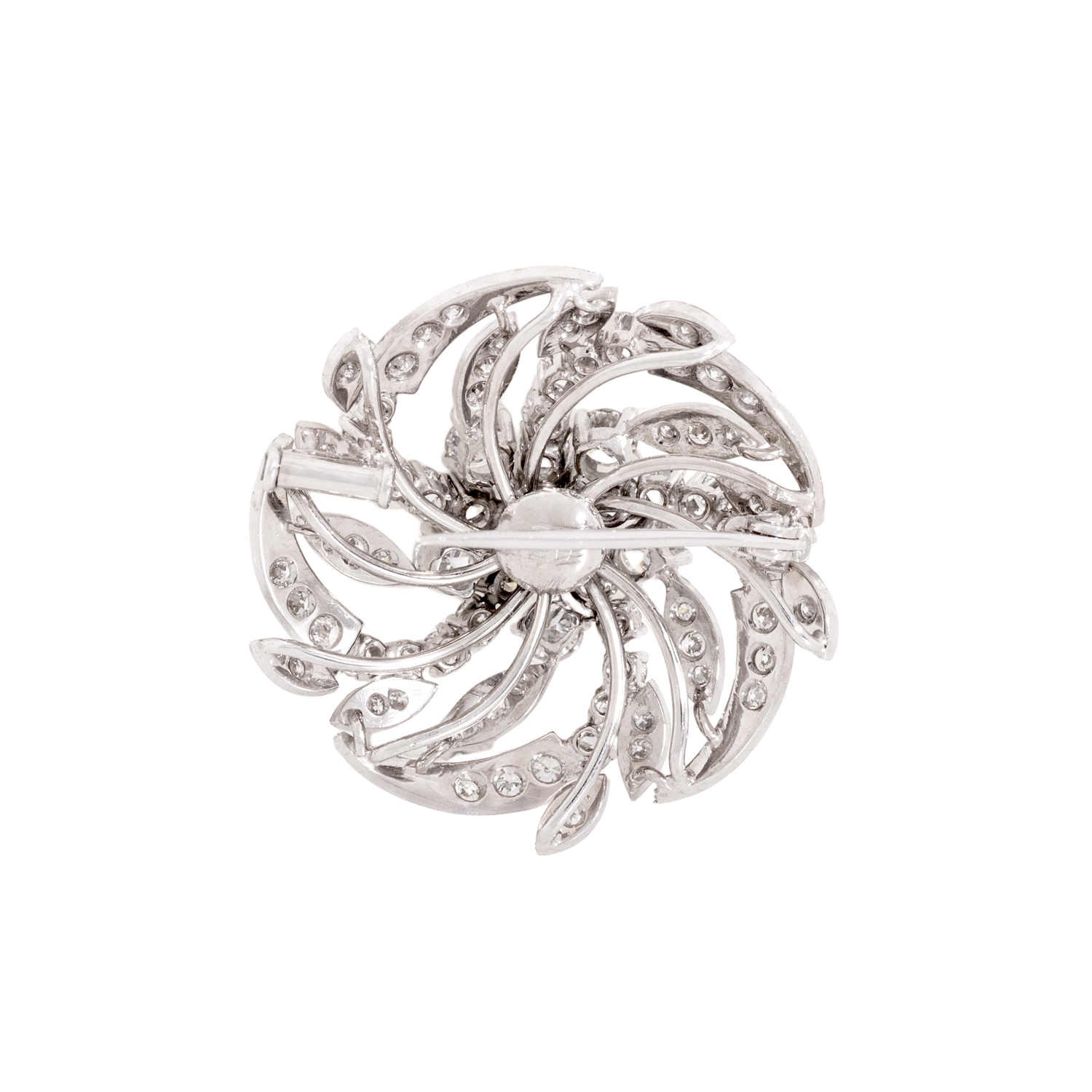 Brooch with brilliant cut diamond, ca. 1.0 ct, RW (G)/P, fluorescence medium blue, 28 brilliant cut and 2 single cut diamonds, totalling ca. 2,4 ct, RW-WHITE (G-H)/VVS-SI, 18K white gold, 10.3 g, D: ca. 30 mm, mid 20th century, minimal signs of wear.