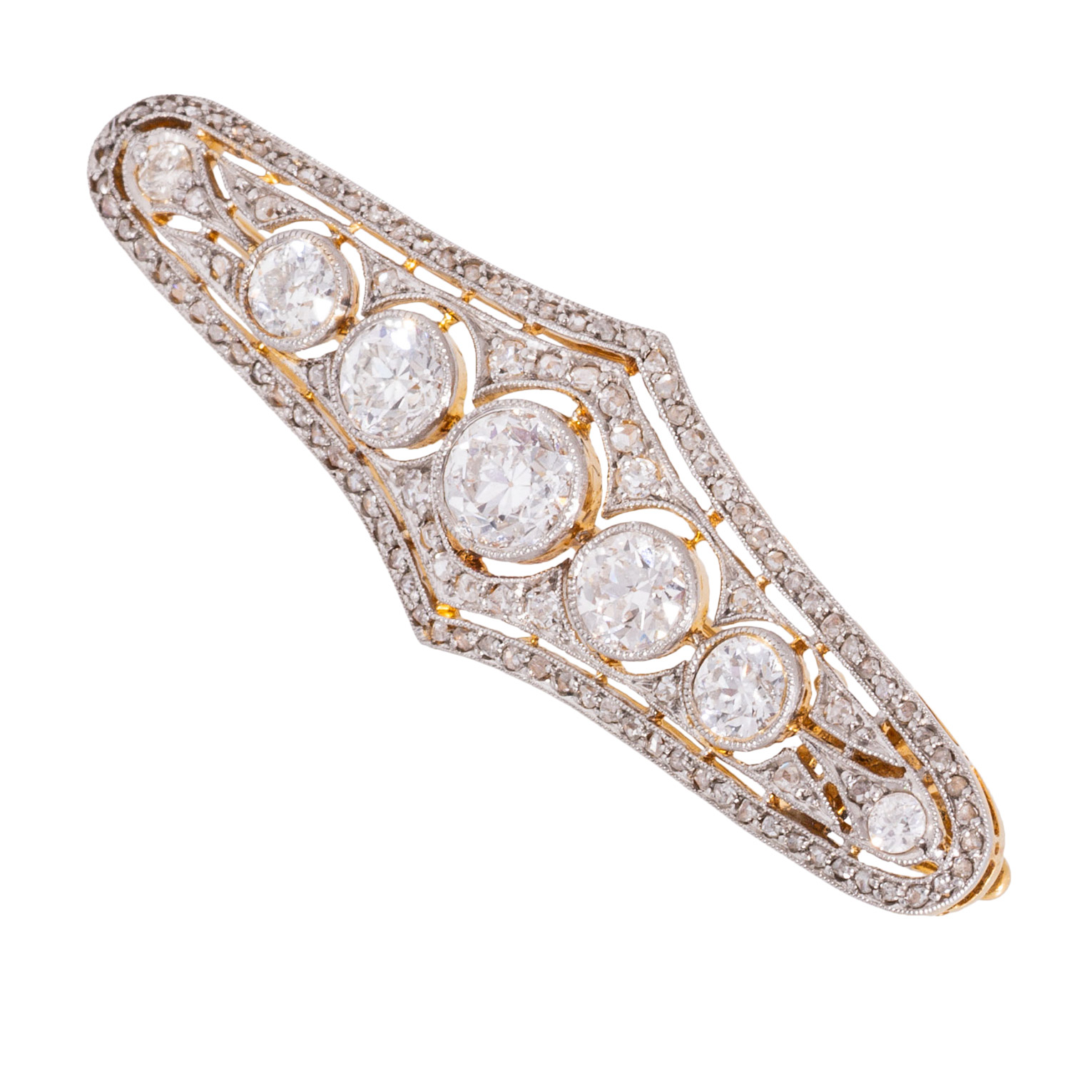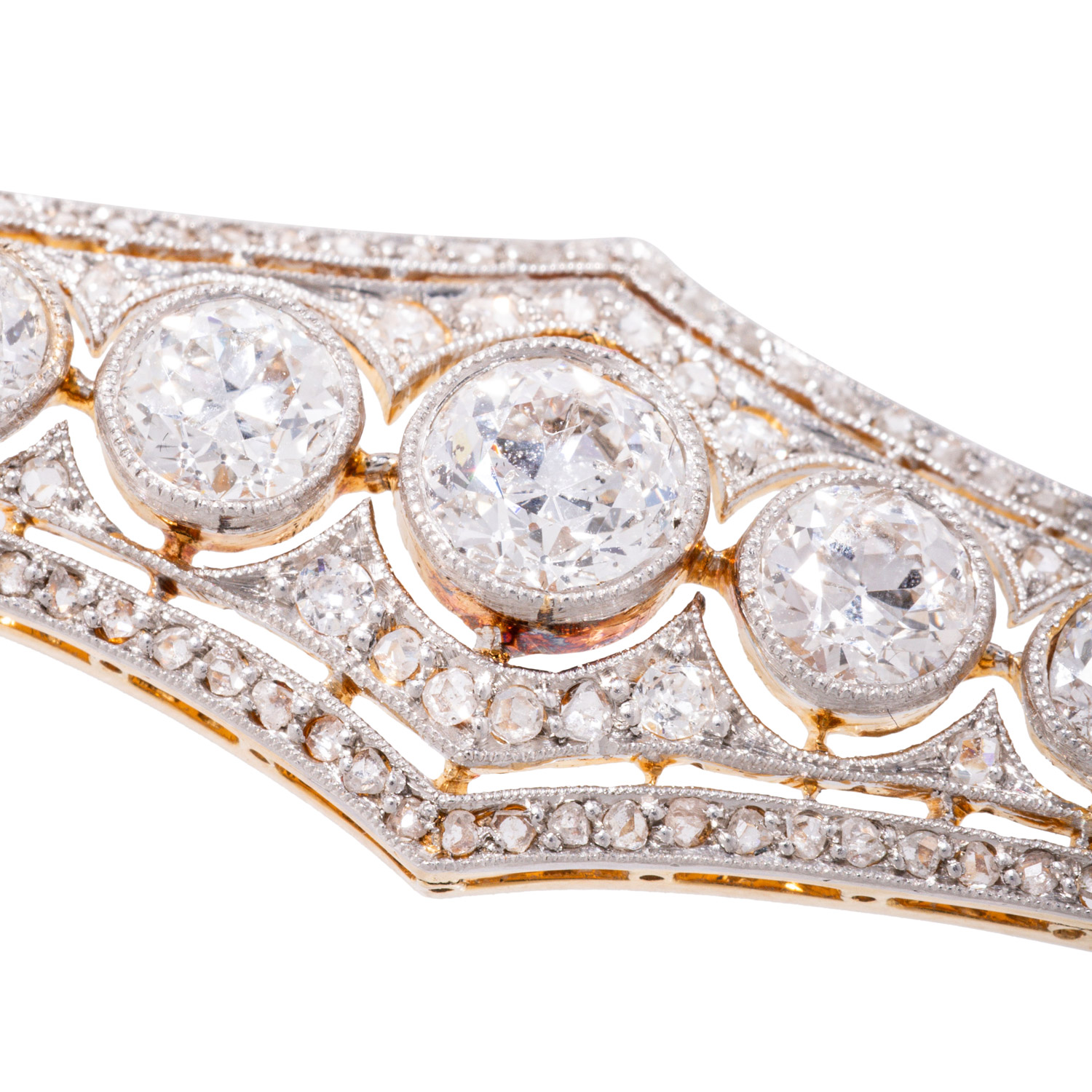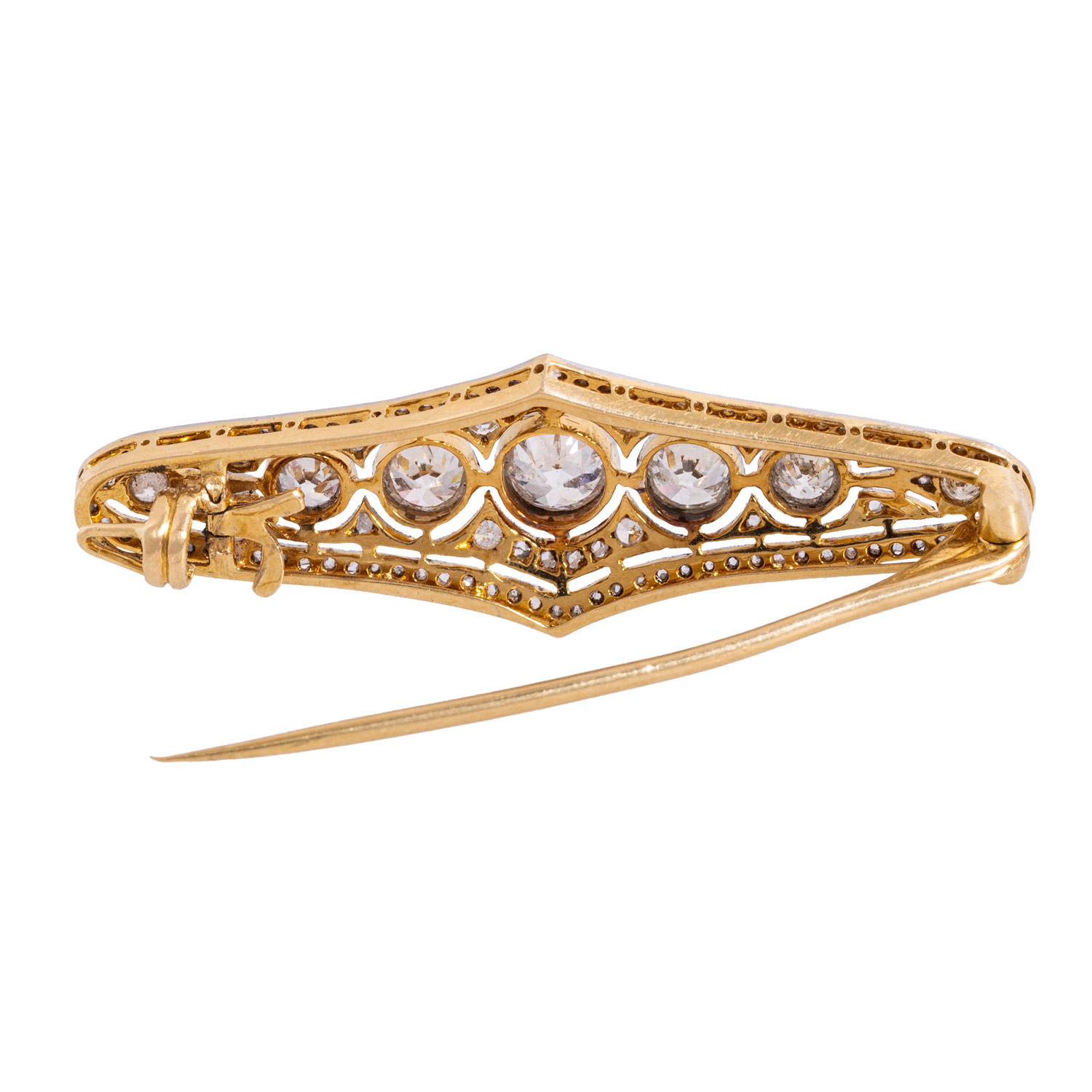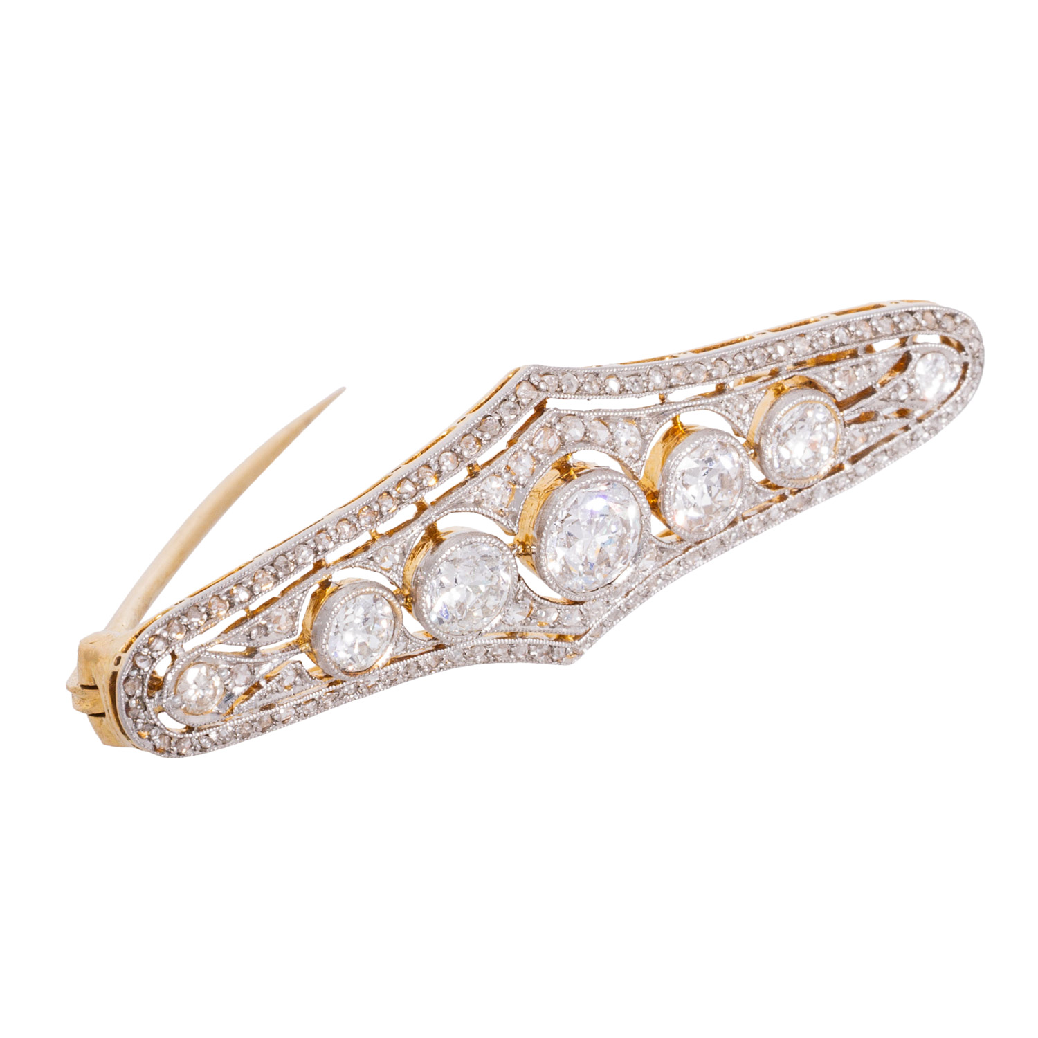 Brooch with old- european-and rose-cut diamonds totalling ca. 1,8 ct, RW- TIN (G-M)/SI-P, YG 18K, platinum, 5,6g, L x W 43 x 13 mm, 20th century, good condition. Handcrafted.