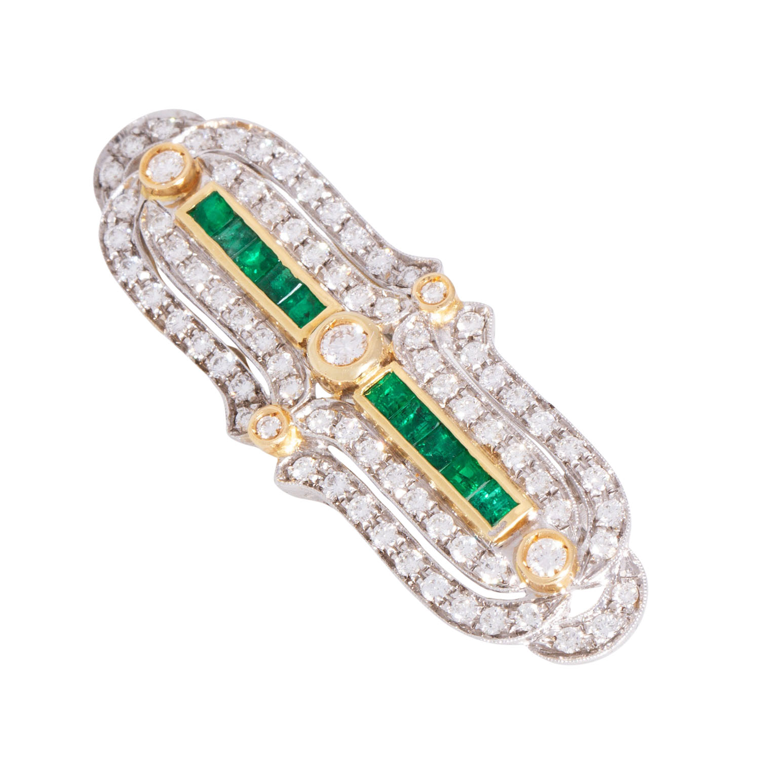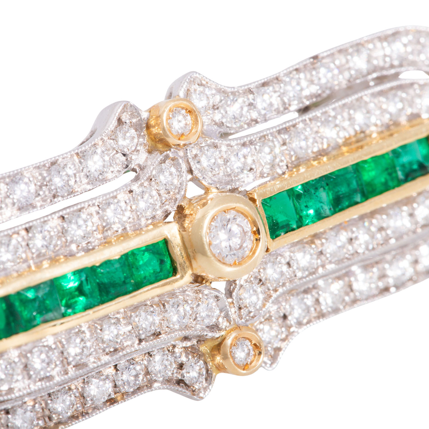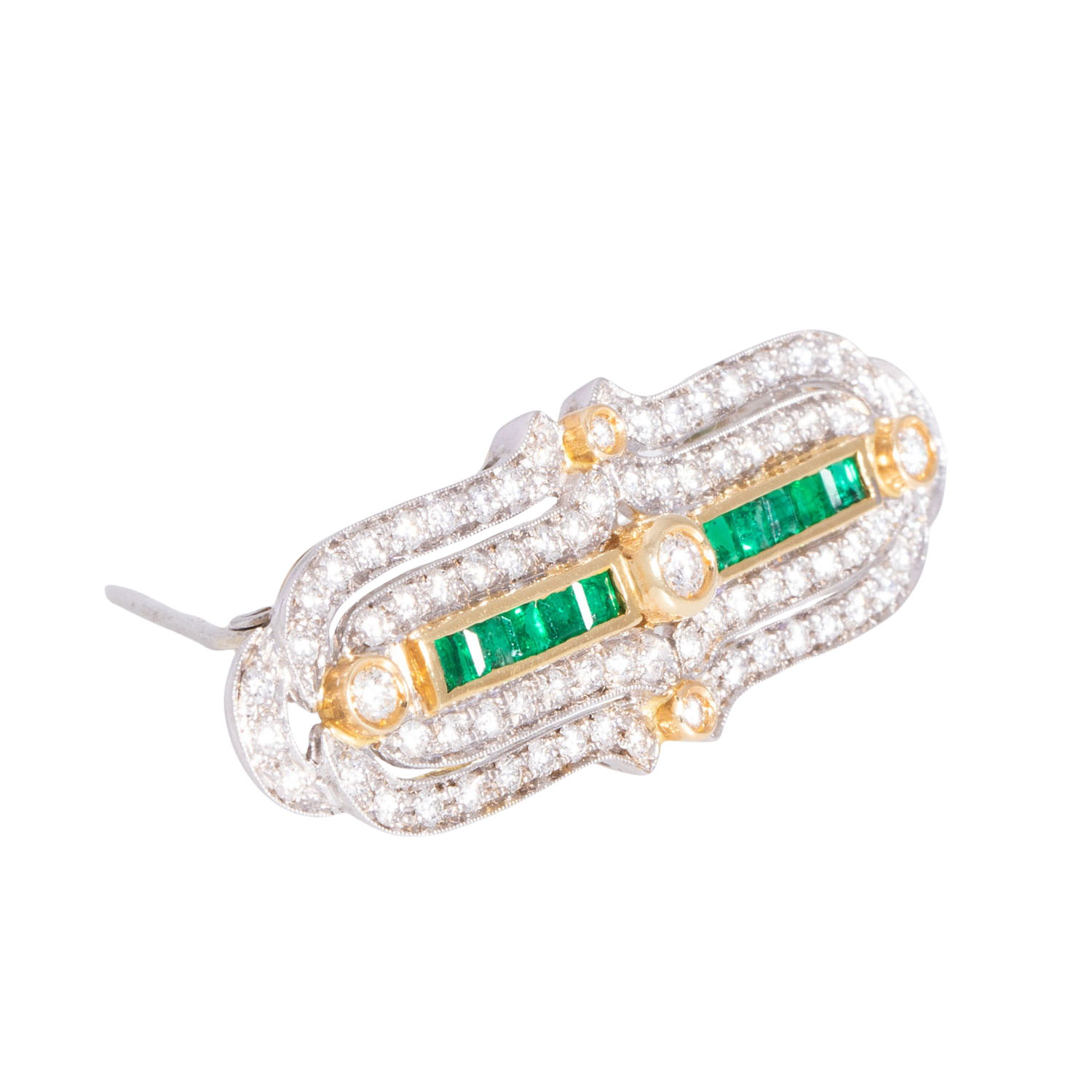 Brooch with carré-cut emeralds and brilliant-cut diamonds totalling ca. 1.8 ct, good colour and clarity, 18K yellow gold, partly rhodium plated, 10.2 g, 5x1.5 cm, Italy 2nd half of 20th century, very good condition.
