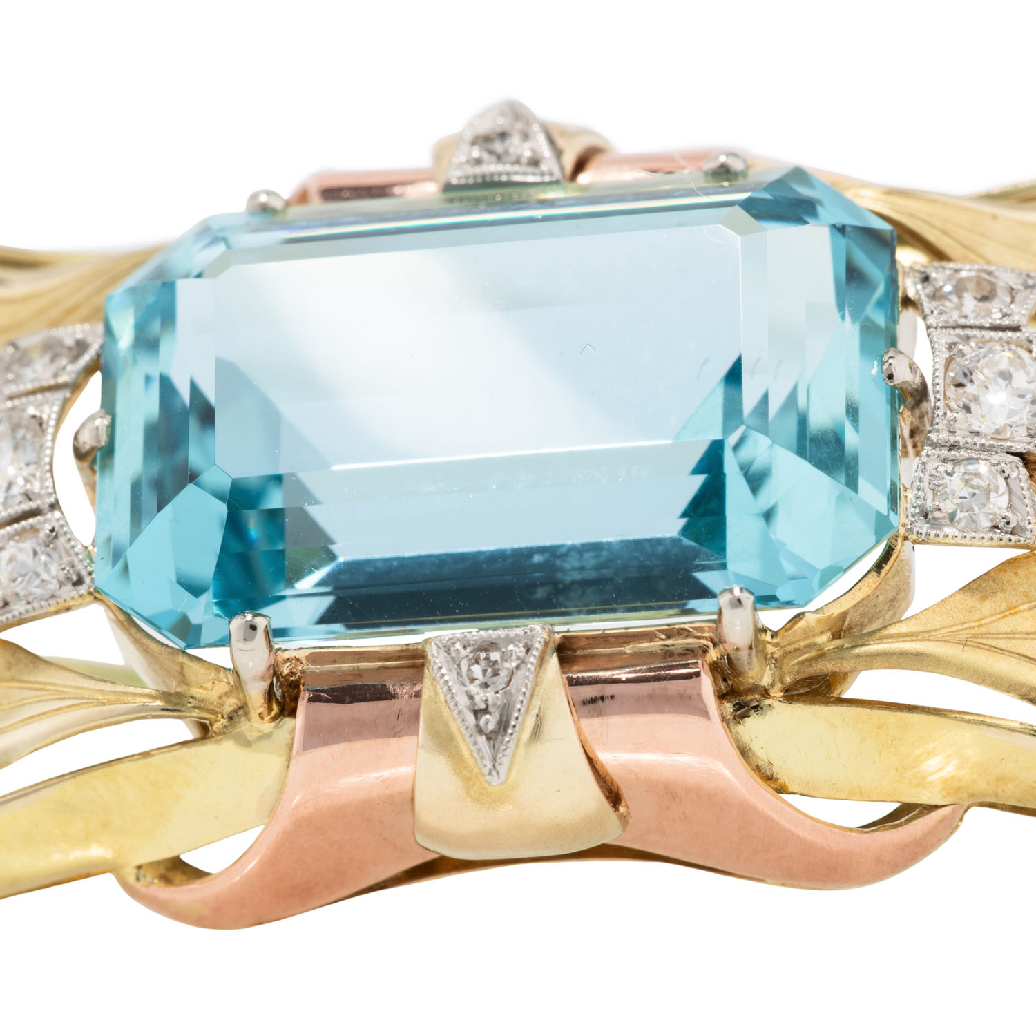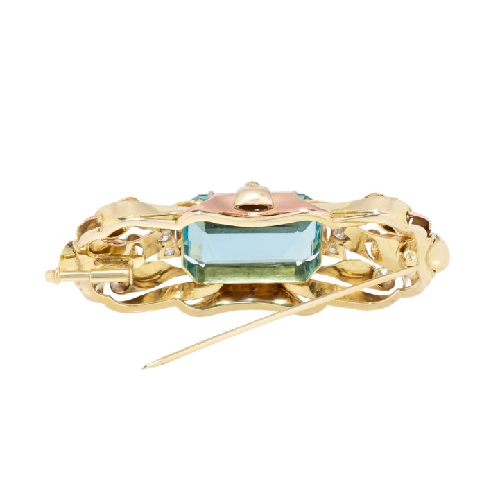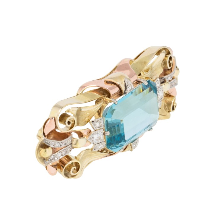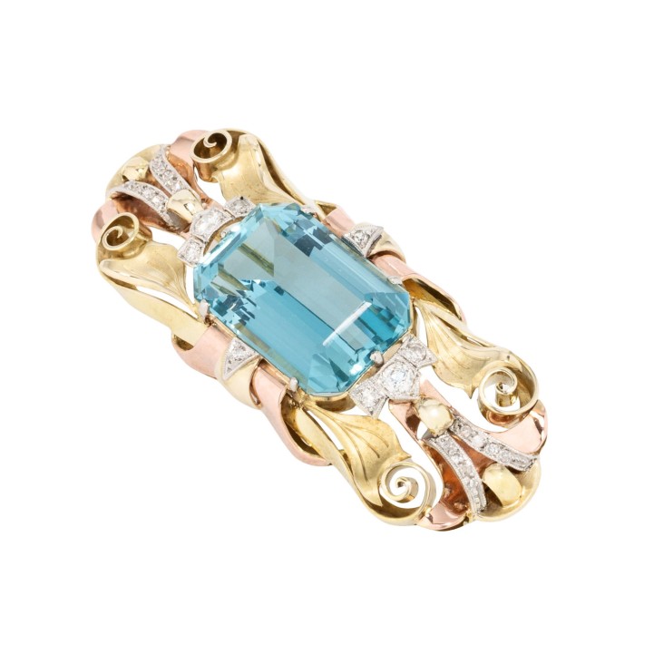 Brooch with fine aquamarine ca. 14 ct and small diamonds, 14K yellow, white and red gold, 13.6 g, 5.2x2 cm, mid of 20th century, very good condition, marked 'E GRUN', nice solid craftsmanship, very beautiful aquamarine! // Amendment 19.12.2025: The prices displayed before this date were incorrect.