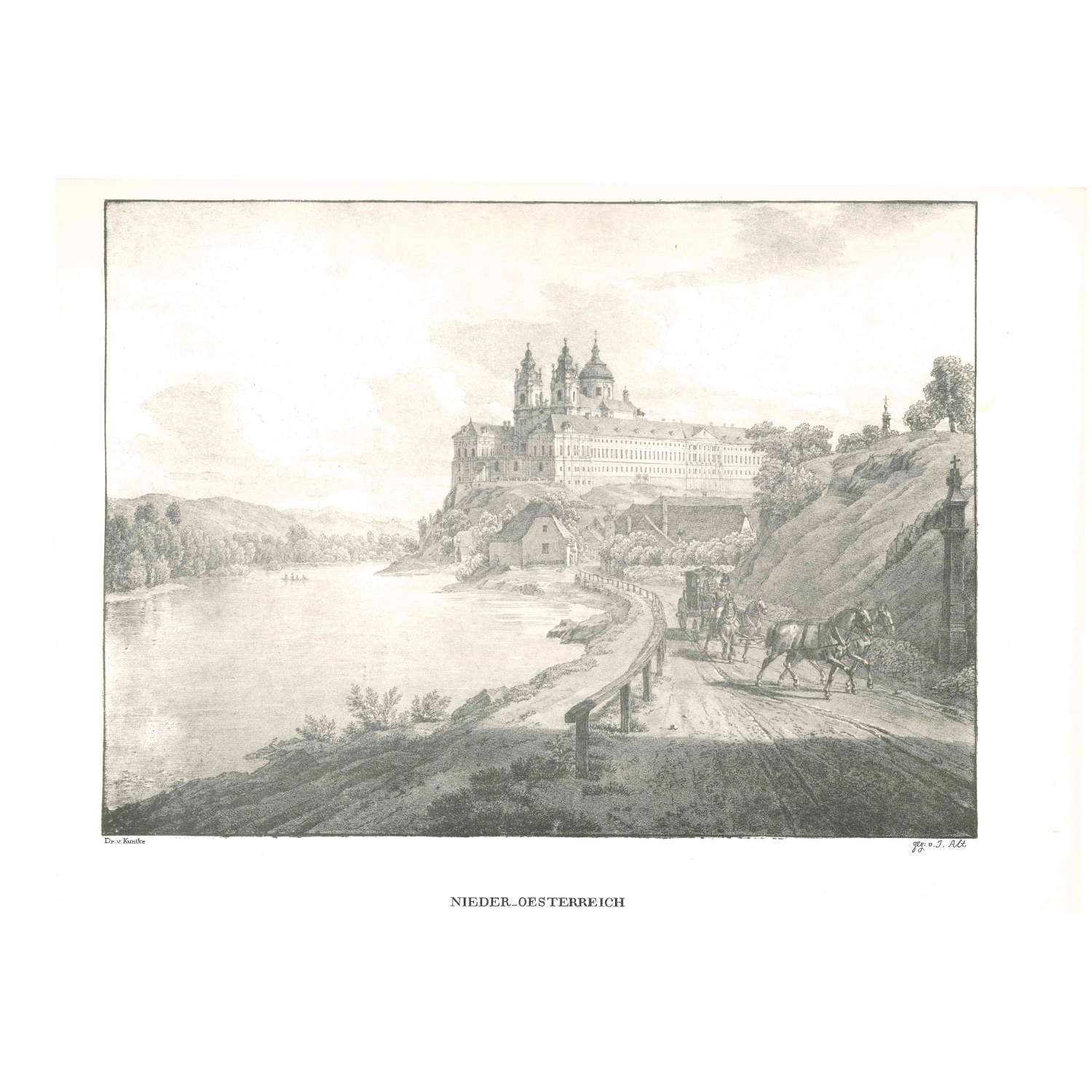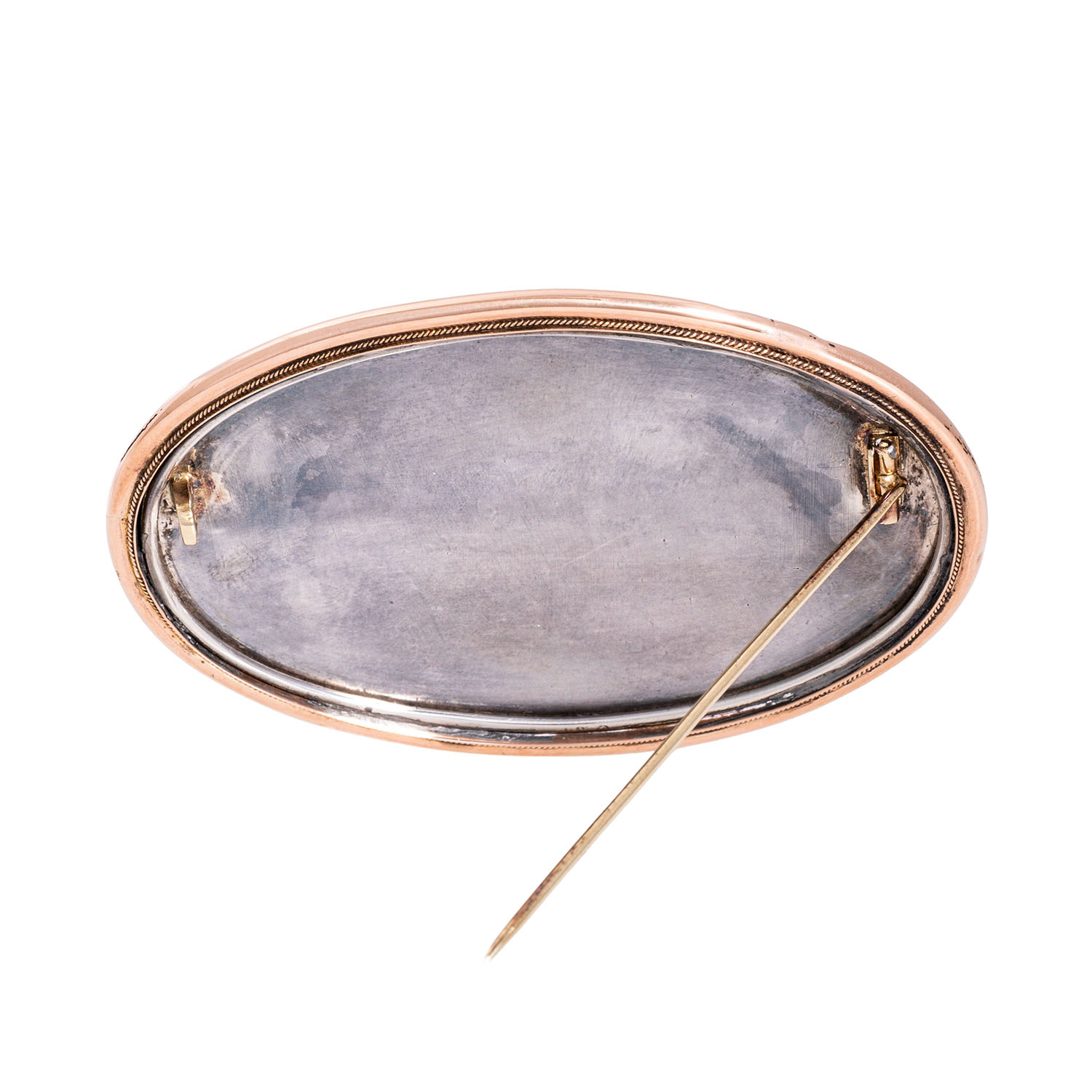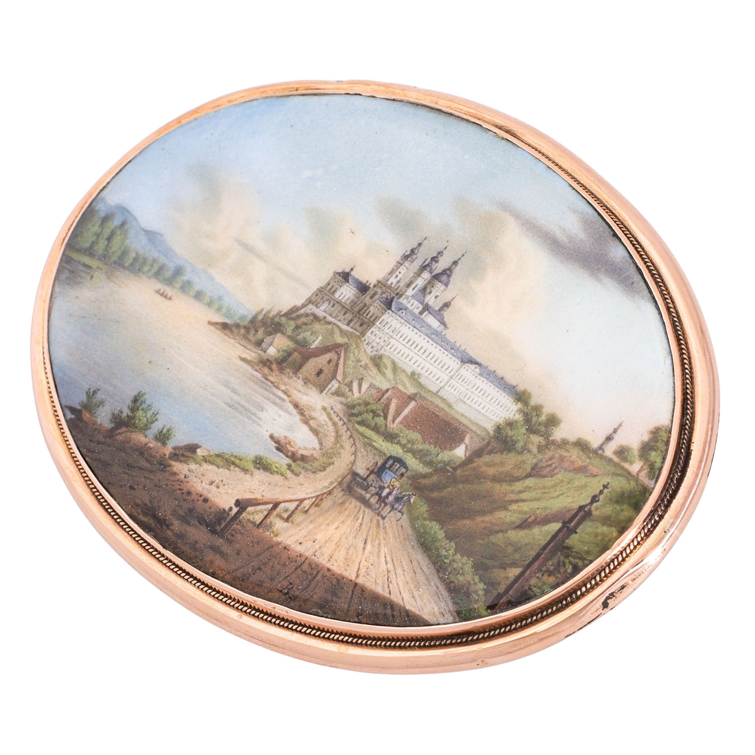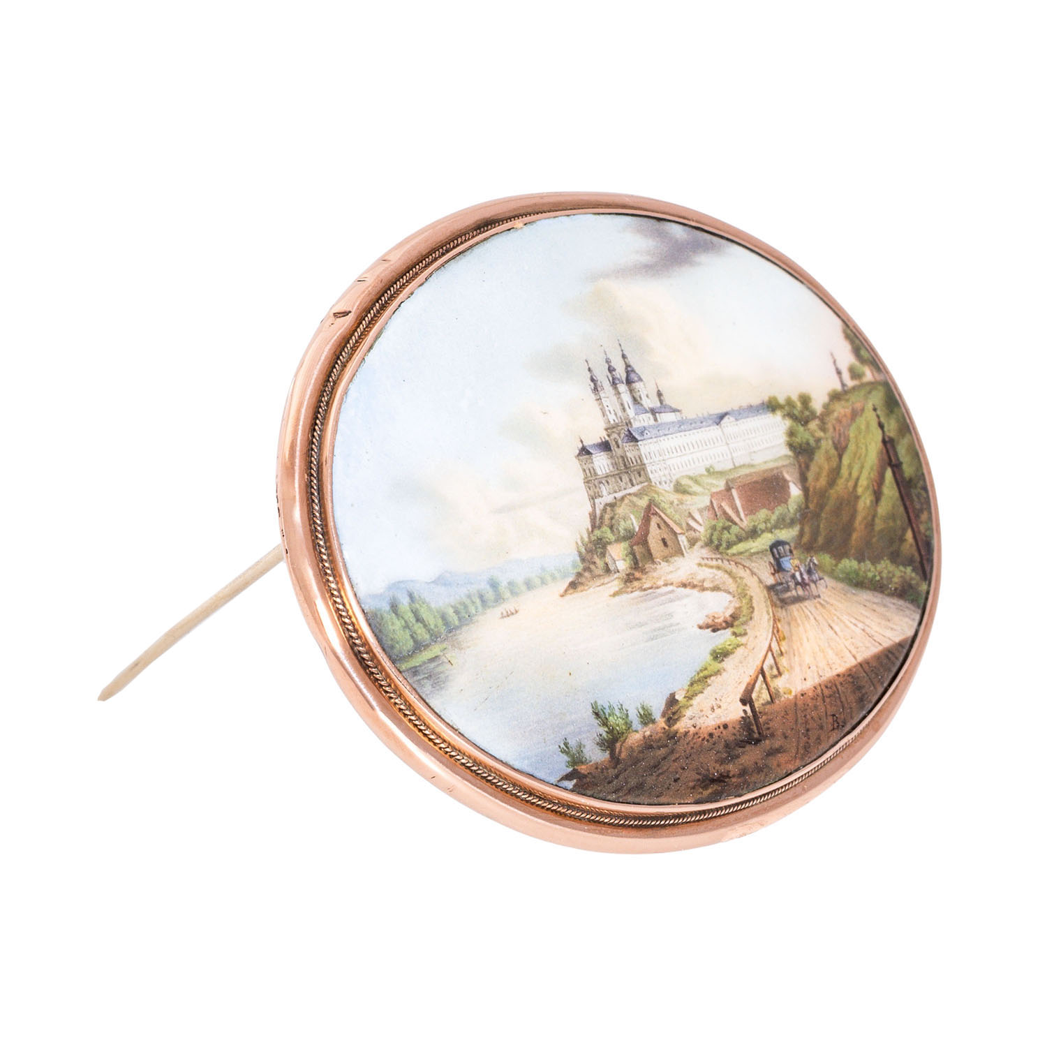 Brooch with fine miniature painting 'Monastery Melk' prob. from or after Jacob Alt around 1824, on porcellaine, frame of 8K red gold, needle 14K yellow gold and plate backwards of silver, fixed with tin solder, 32.1 g, 6.5x4.5 cm, 19th/20th century, age-relating good condition, including reproduction of the original tamplate printing and notes according the provenance.
