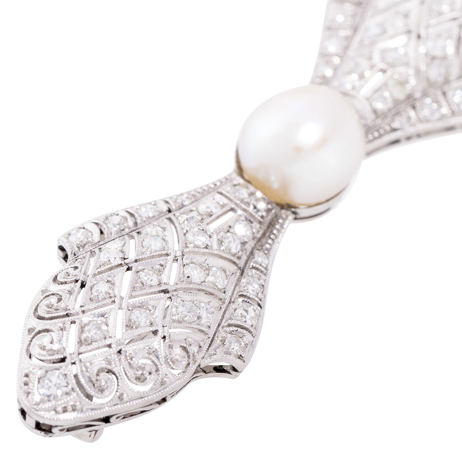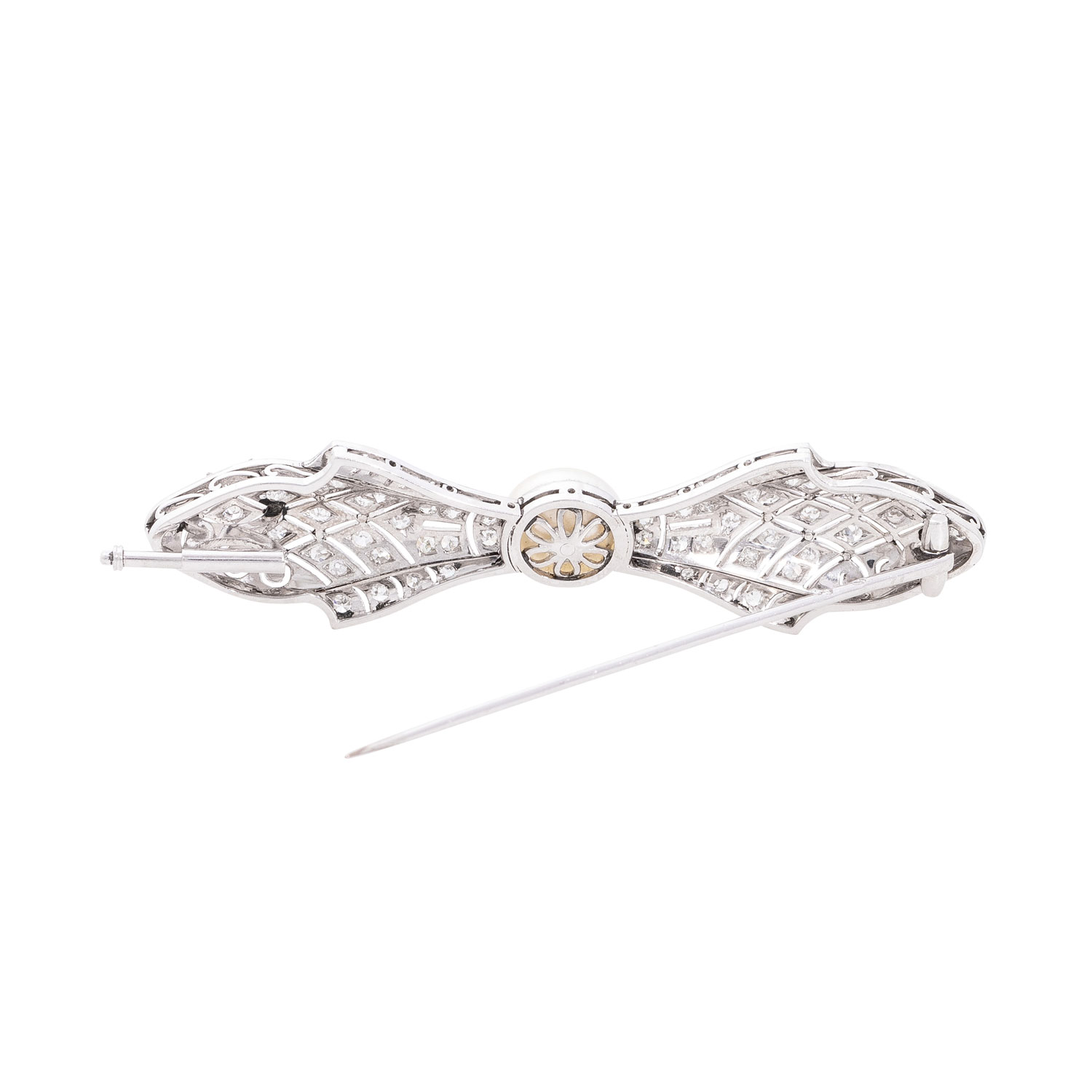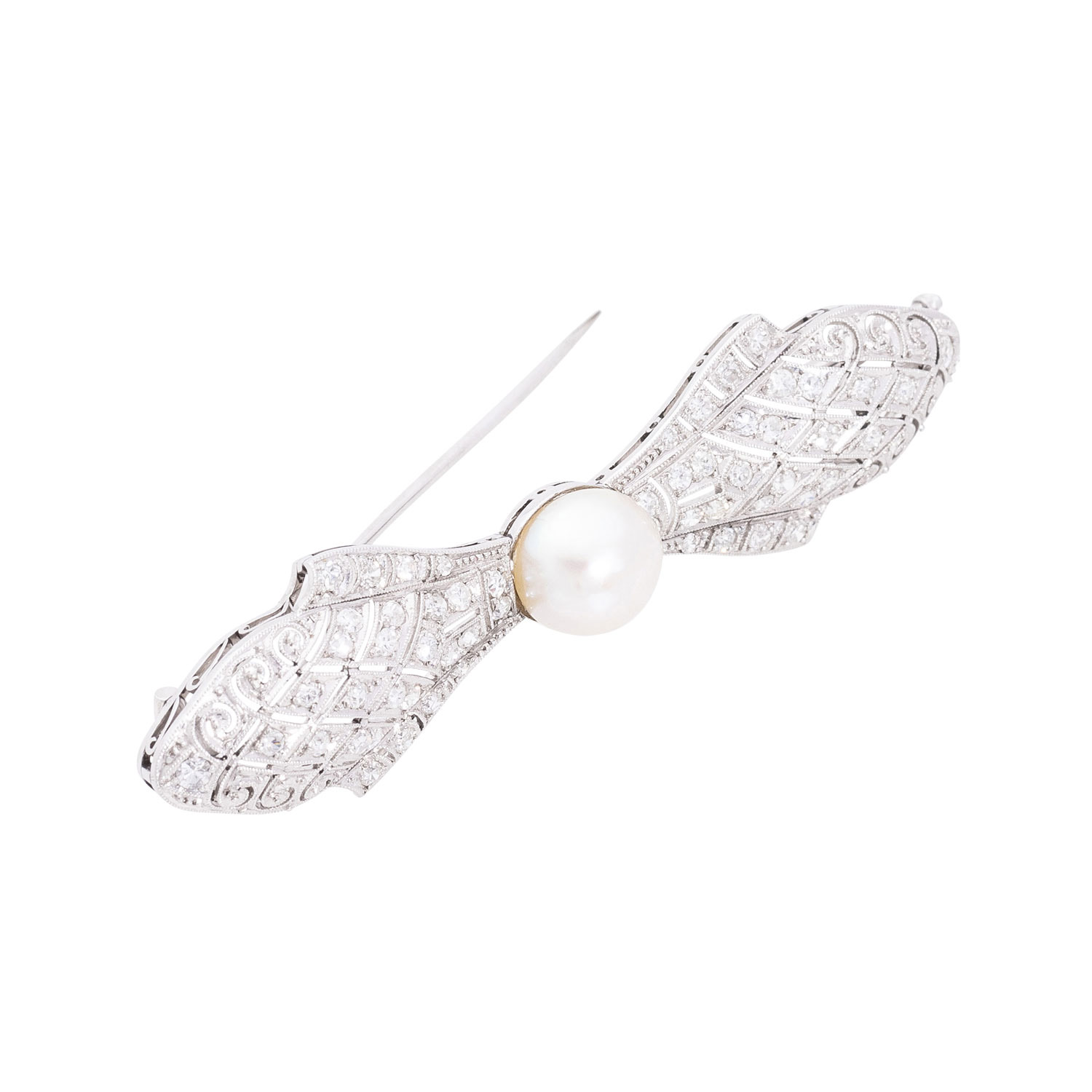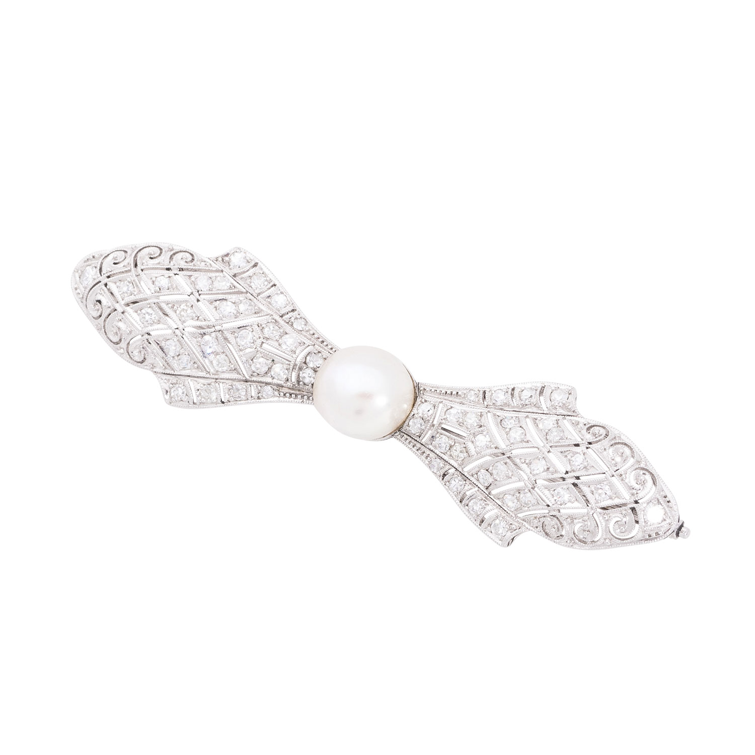 Brooch with pearl and single-cut diamonds totalling ca. 0.5 ct, good colour and good to medium clarity, platinum 9.6 g, 6x1.5 cm, 1st half of 20th century, minor signs of wear.