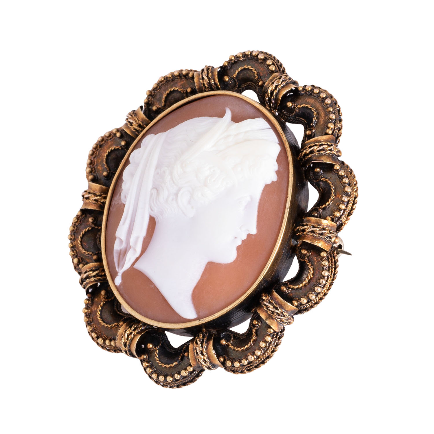 Brooch with shell cameo 'Portrait of a godness' in a decorative frame, 14K yellow gold, 12.9 g, 5.2x4.7 cm, brooch accessoires later replaced, silver, late 19th century, some patina, otherwise age-relating good condition.