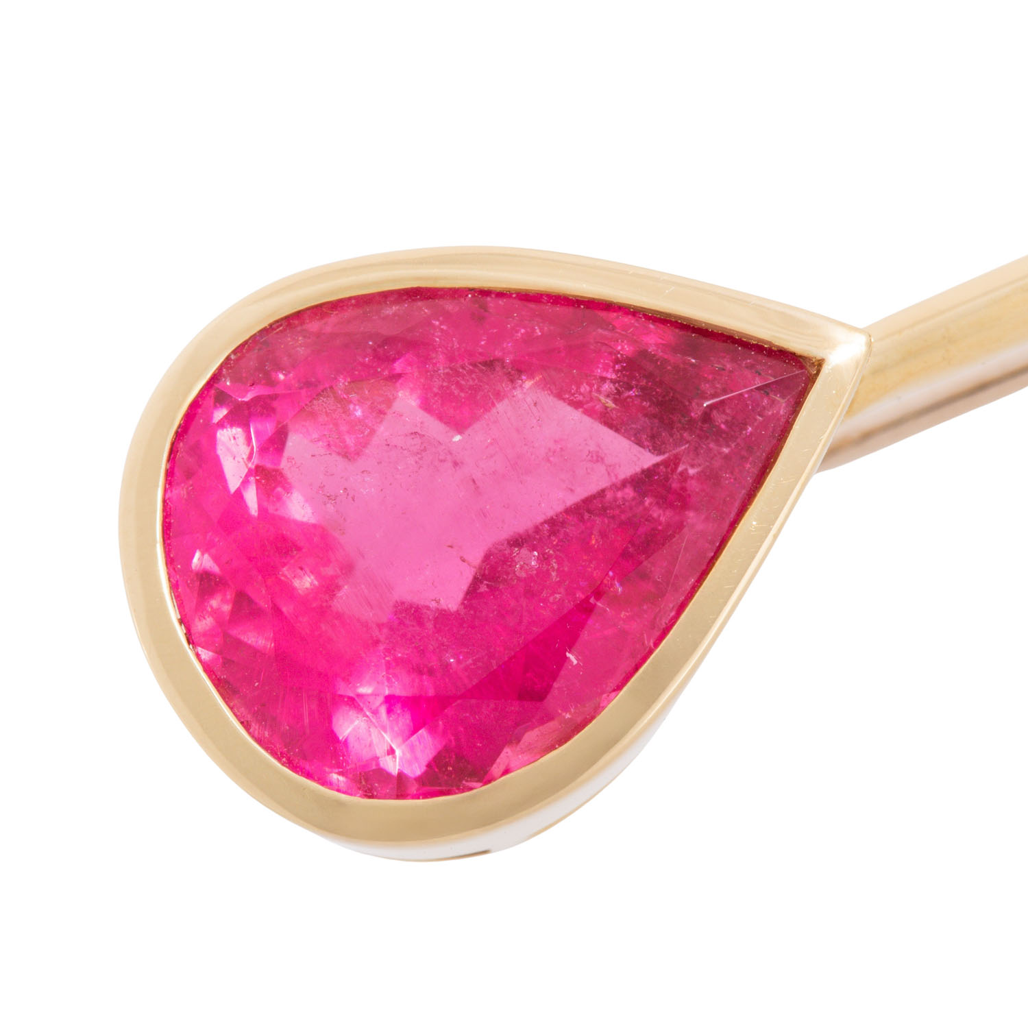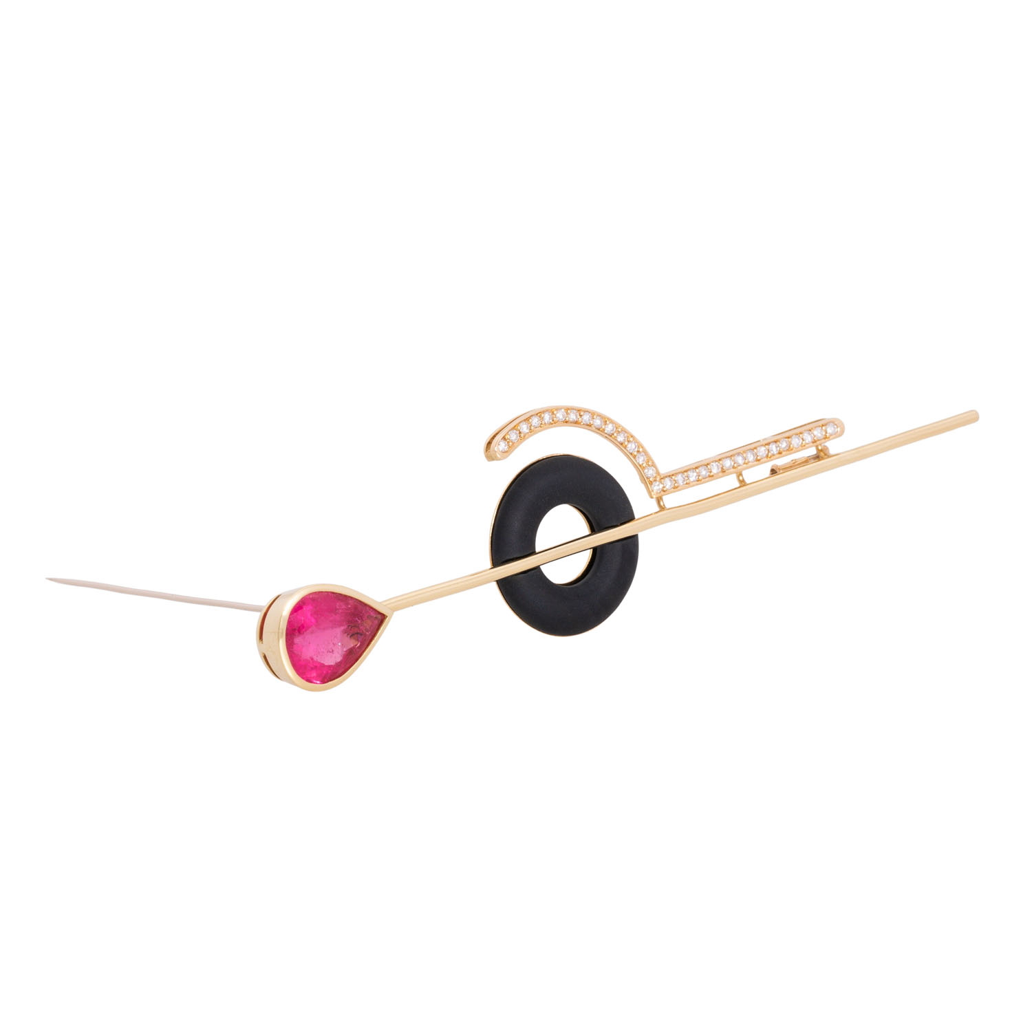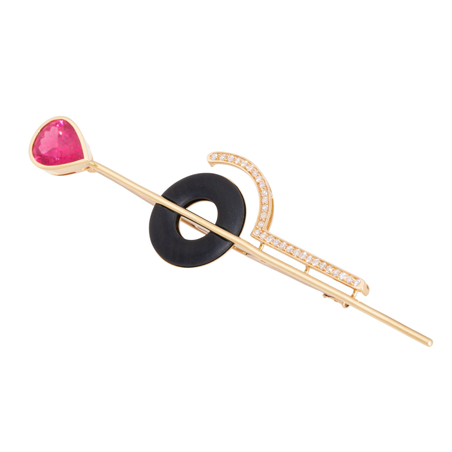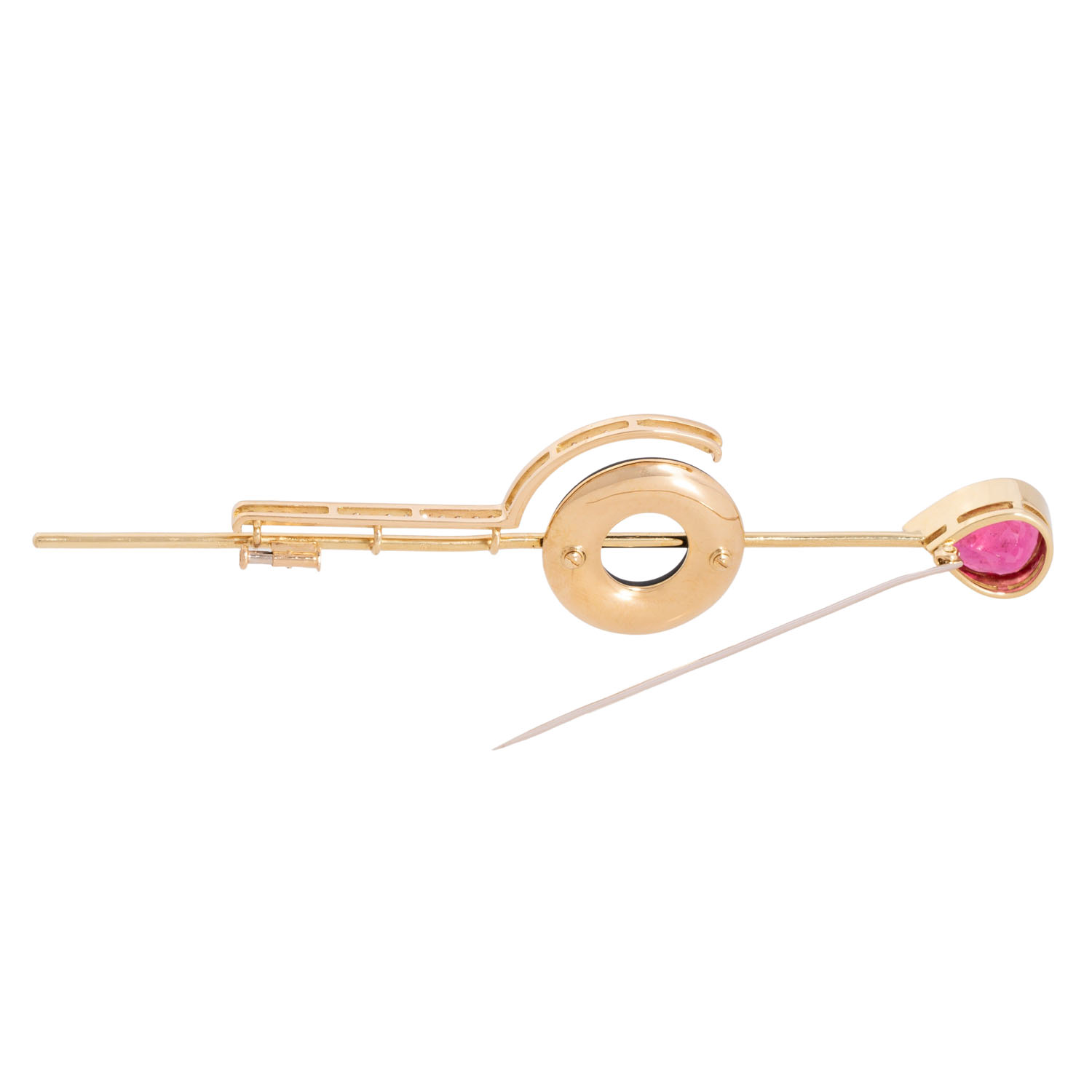 Brooch with finest pear-cut faceted tourmaline (rubellit) ca. 7 ct 'hot pink', brilliant-cut diamonds totalling ca. 0.3 ct, good colour and clarity and 2 onyx segments, 18K yellow gold, 17.9 g, L: 11.5 cm, 20th/21st century, slight signs of work, handcrafted.
