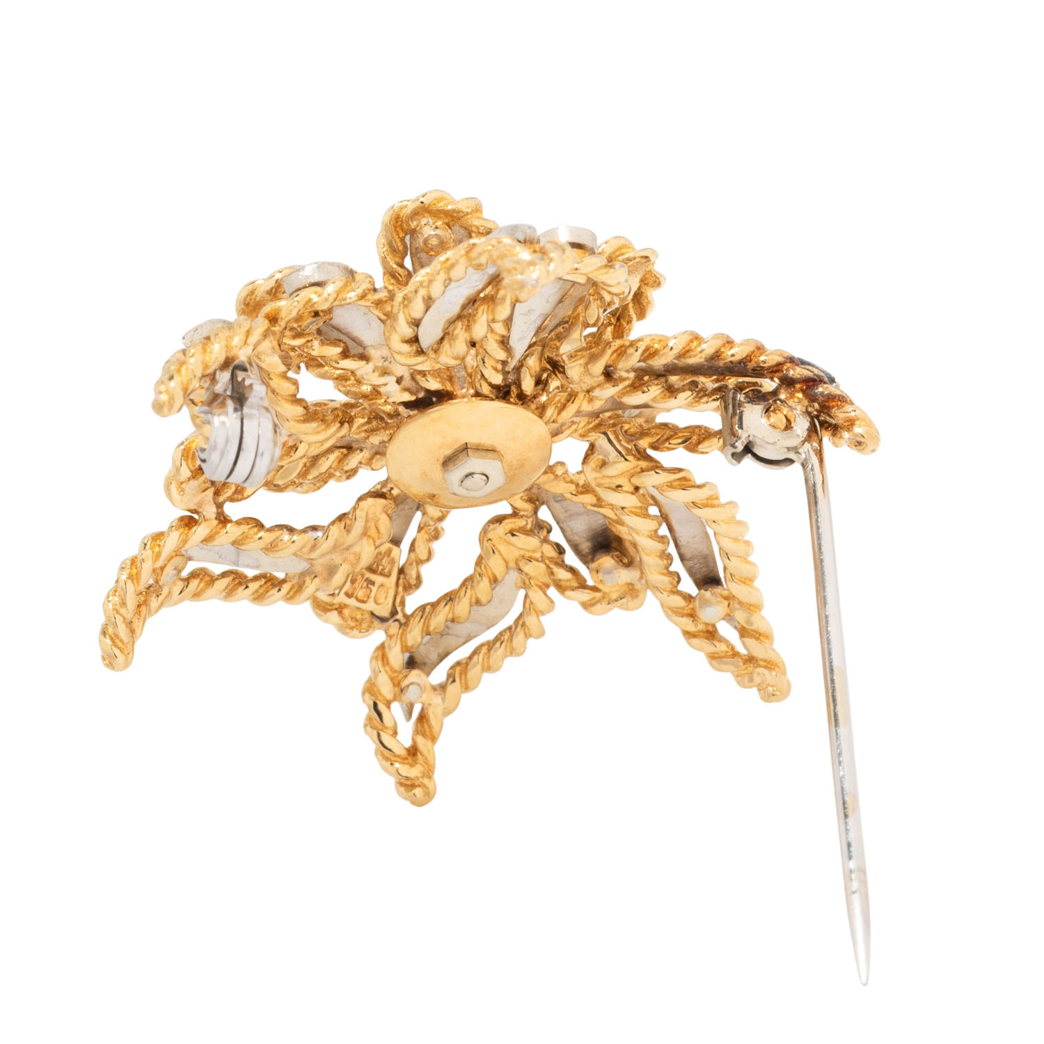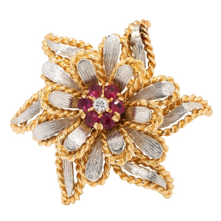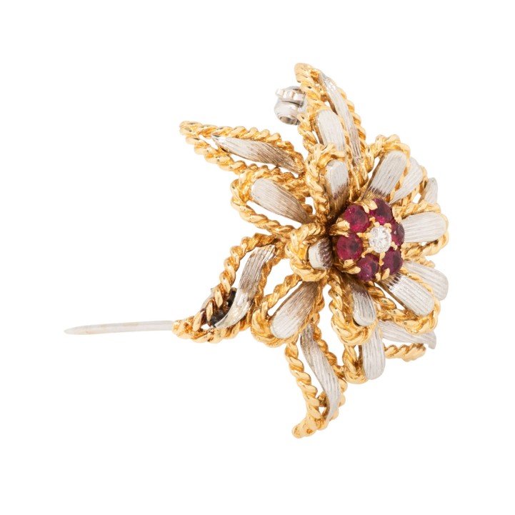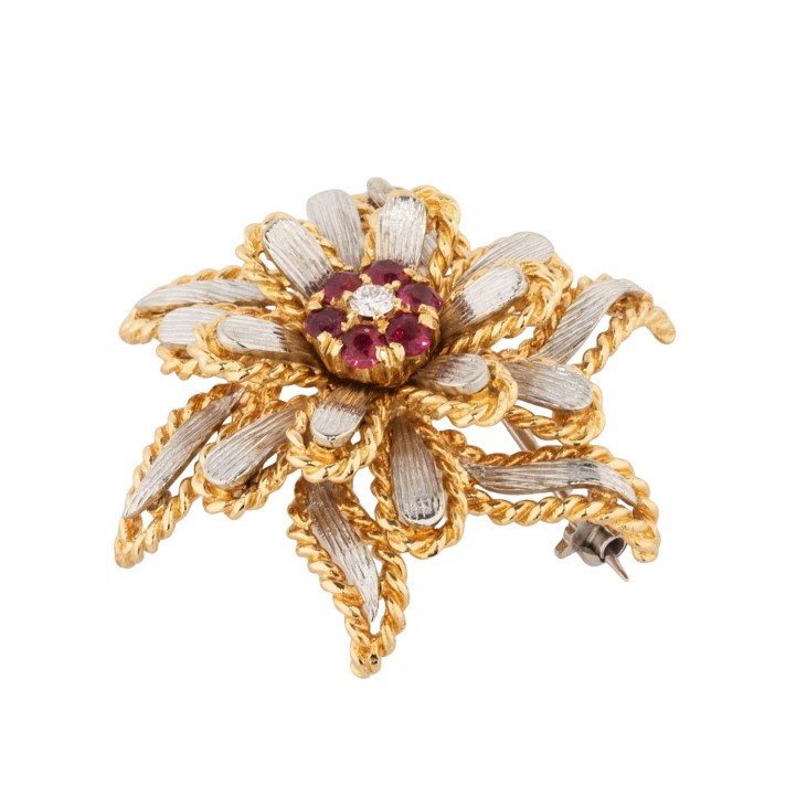 Brooch ‘Blossom’, centre brilliant-cut diamond ca. 0.05 ct, medium colour and clarity, surrounded by 6 rubies totalling ca. 0.3 ct, YG/WG 18 K, 13.7 g, D: 35 mm, 1960s, solid workmanship. Good condition.