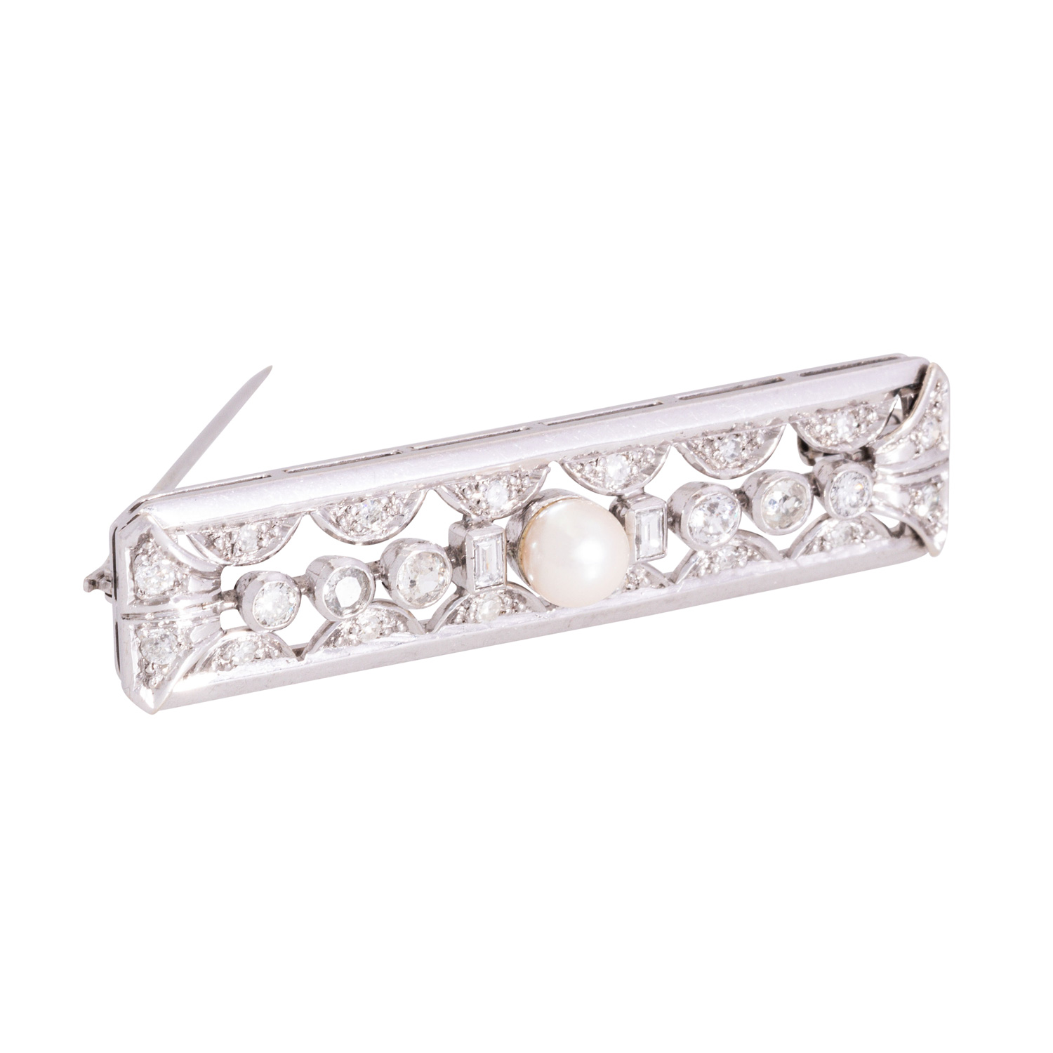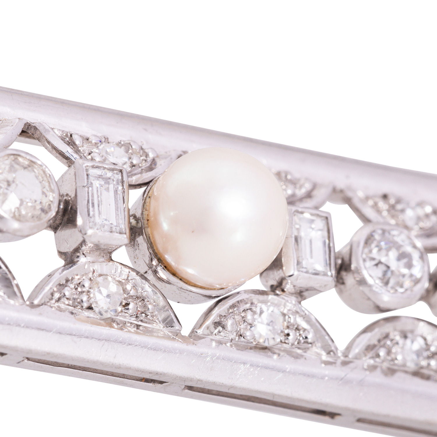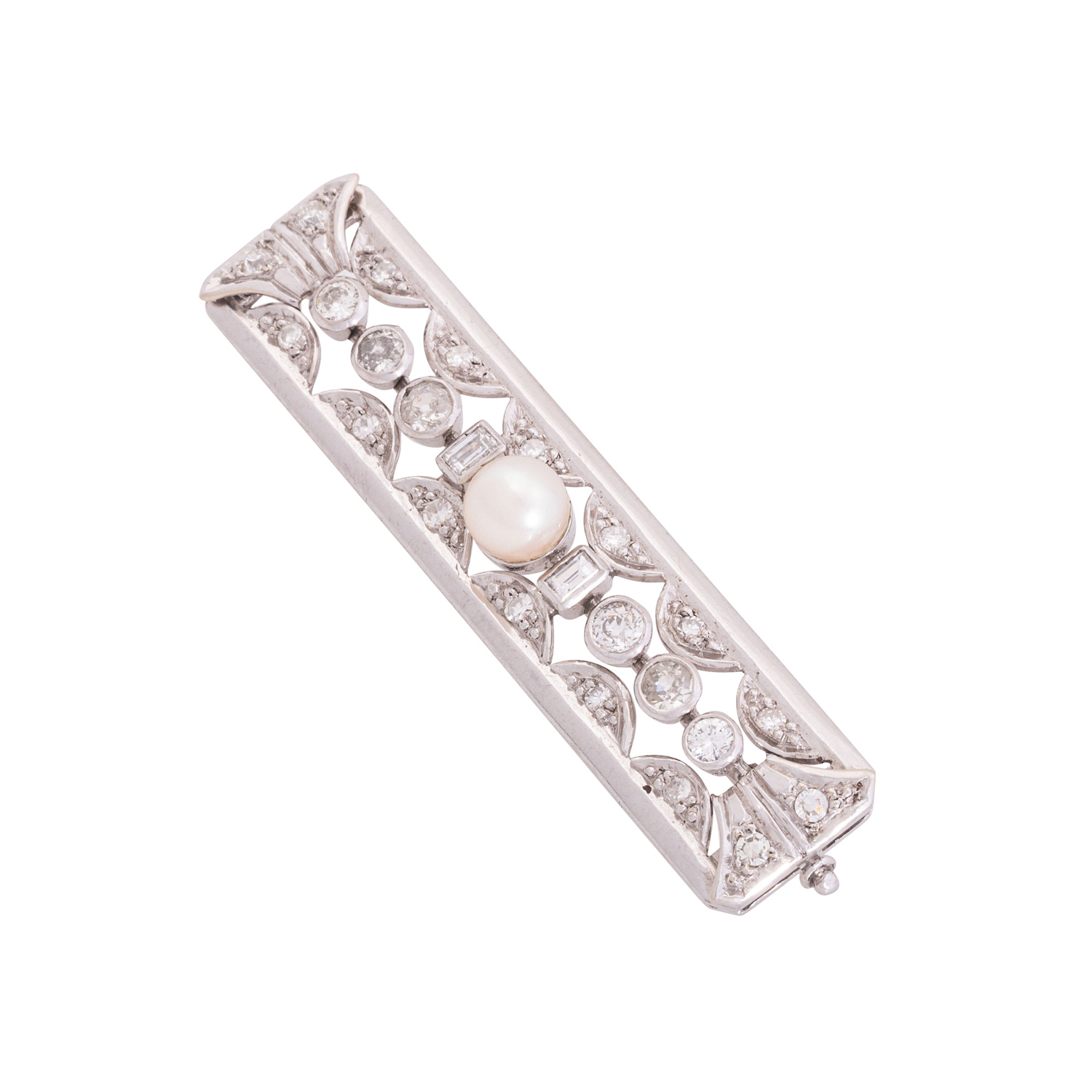 Brooch with Akoya pearl and 24 diamonds totalling approx. 1.18 ct, of which 2 brilliant-cut diamonds approx. 0.16 ct, 4 old-european-cut diamonds approx. 0.46 ct, 1 stone chipped, 2 baguette-cut diamonds approx. 0.20 ct, 16 single-cut diamonds approx. 0.36 ct, WHITE-TW (H-K)/VS-P, Akoya cultured pearl: white, fine luster, D: approx. 6.2 mm, 18K white gold, 10.2 g, L: approx. 55.1 mm, W: approx. 12.7 mm, Mid-20th century, minimal signs of wear.