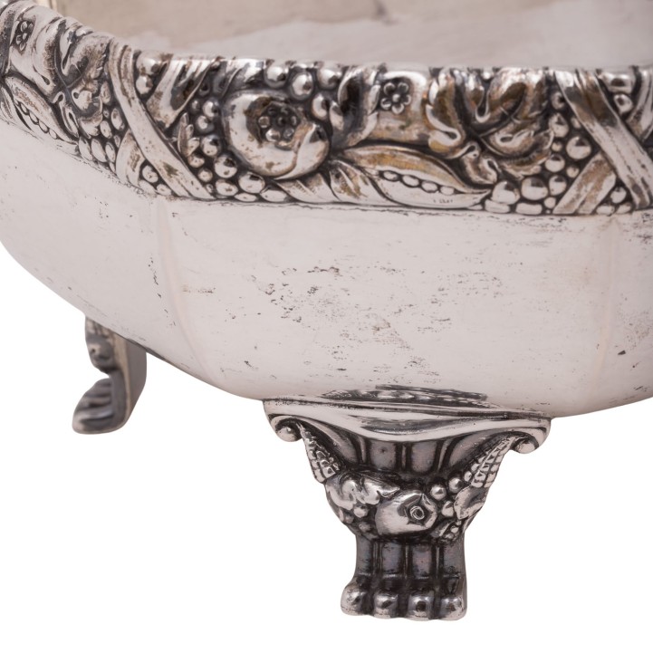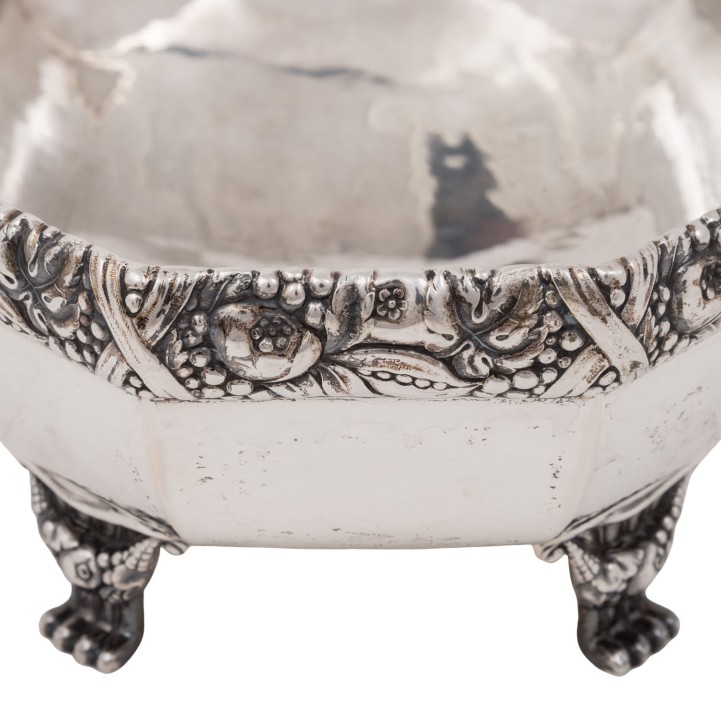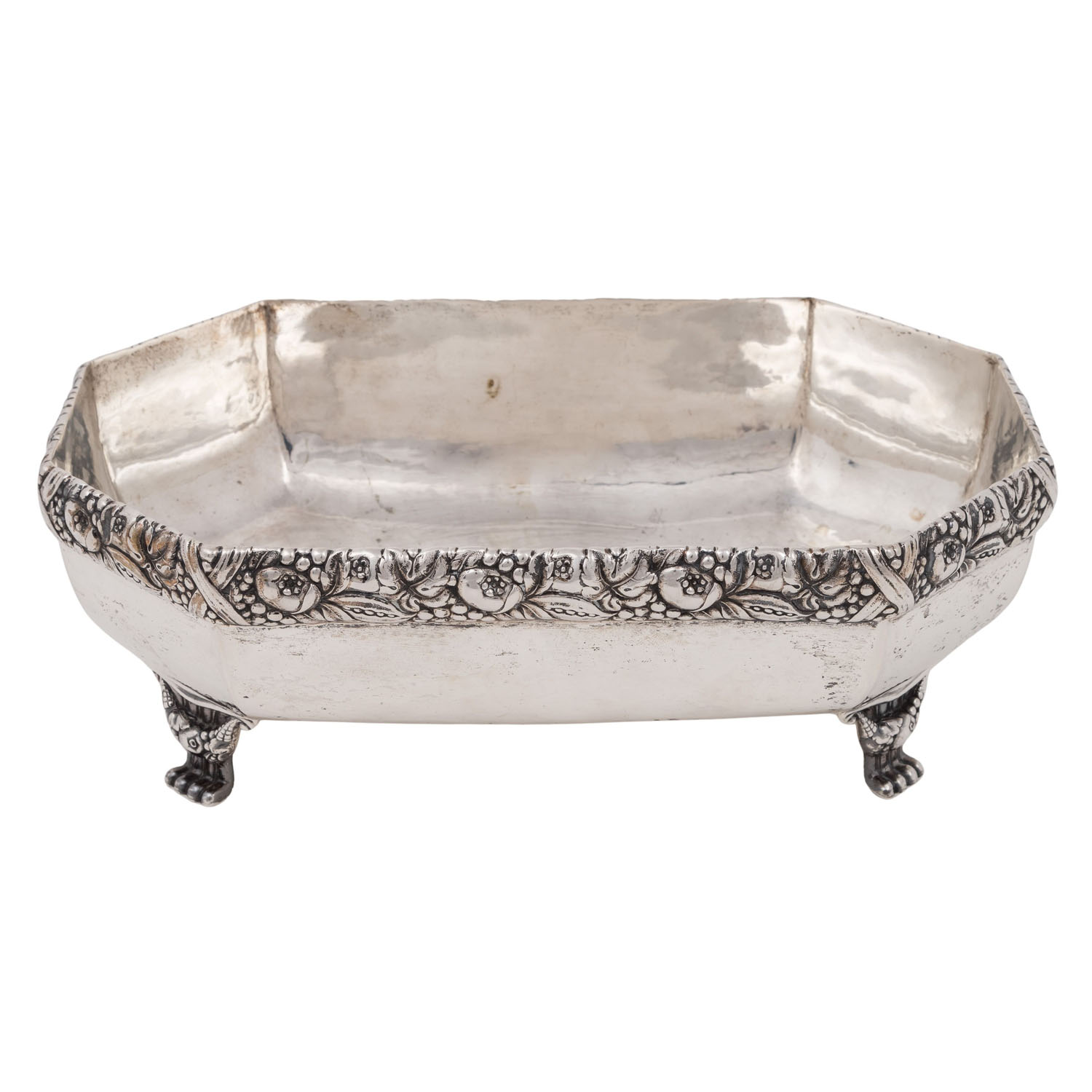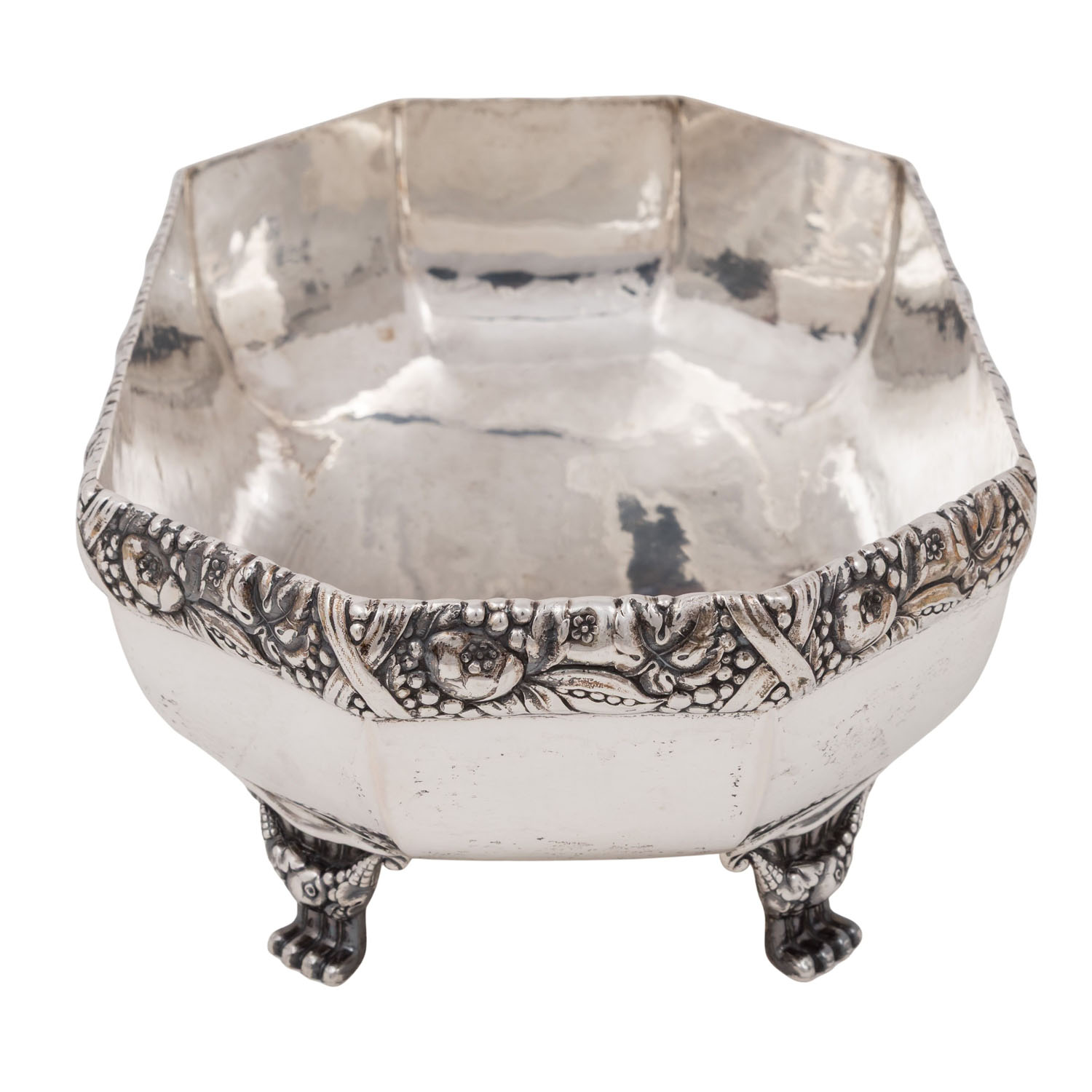 BRUCKMANN & SÖHNE Jardinière, 800 silver, 20th century, on four paw feet, basin-shaped, faceted walls, hammered finish, fruit border, designed by Helene Brandt, first manufactured in 1913, model number 11547, LxWxH: approx. 30x20x11 cm, marked with crescent moon, crown, 800, makers mark, weight approx. 885 g. Signs of age and use.