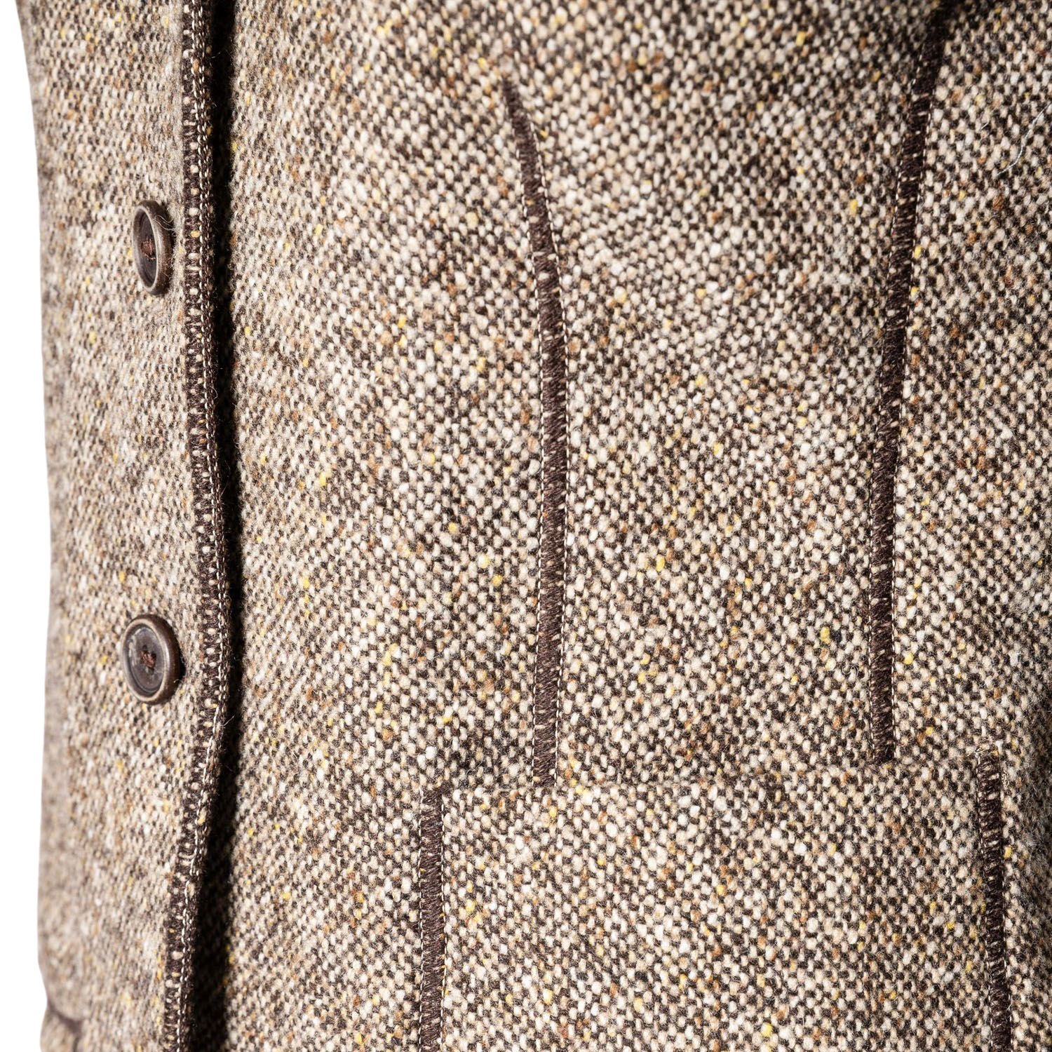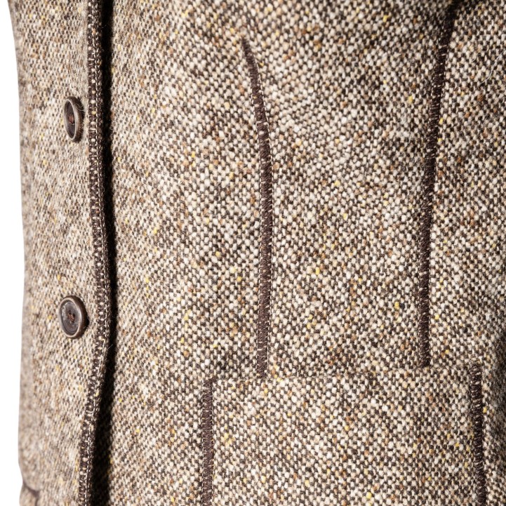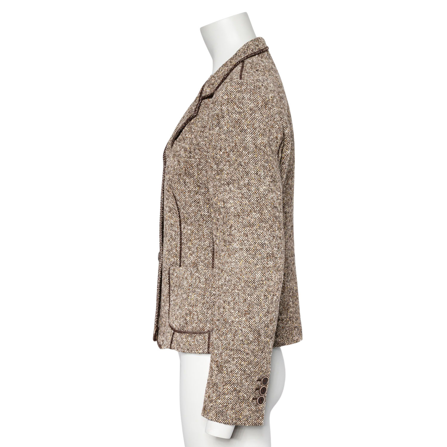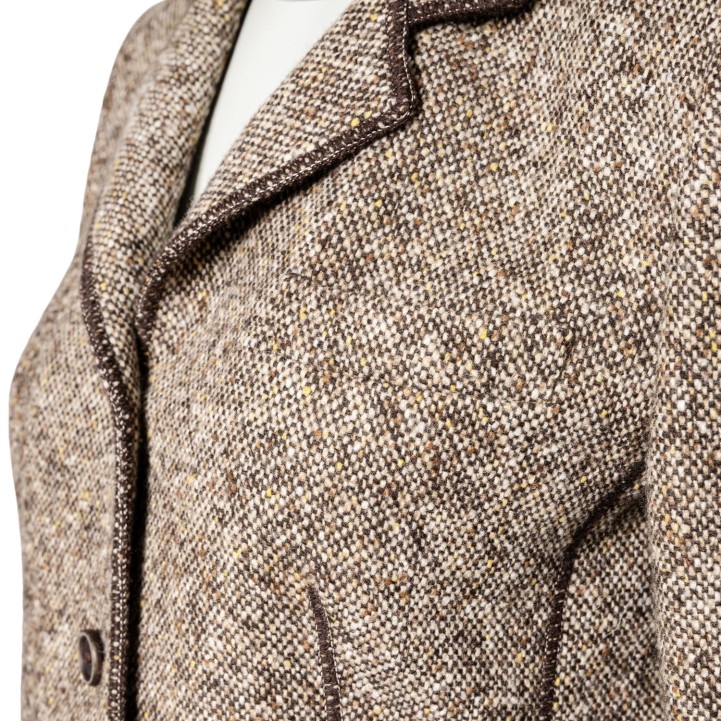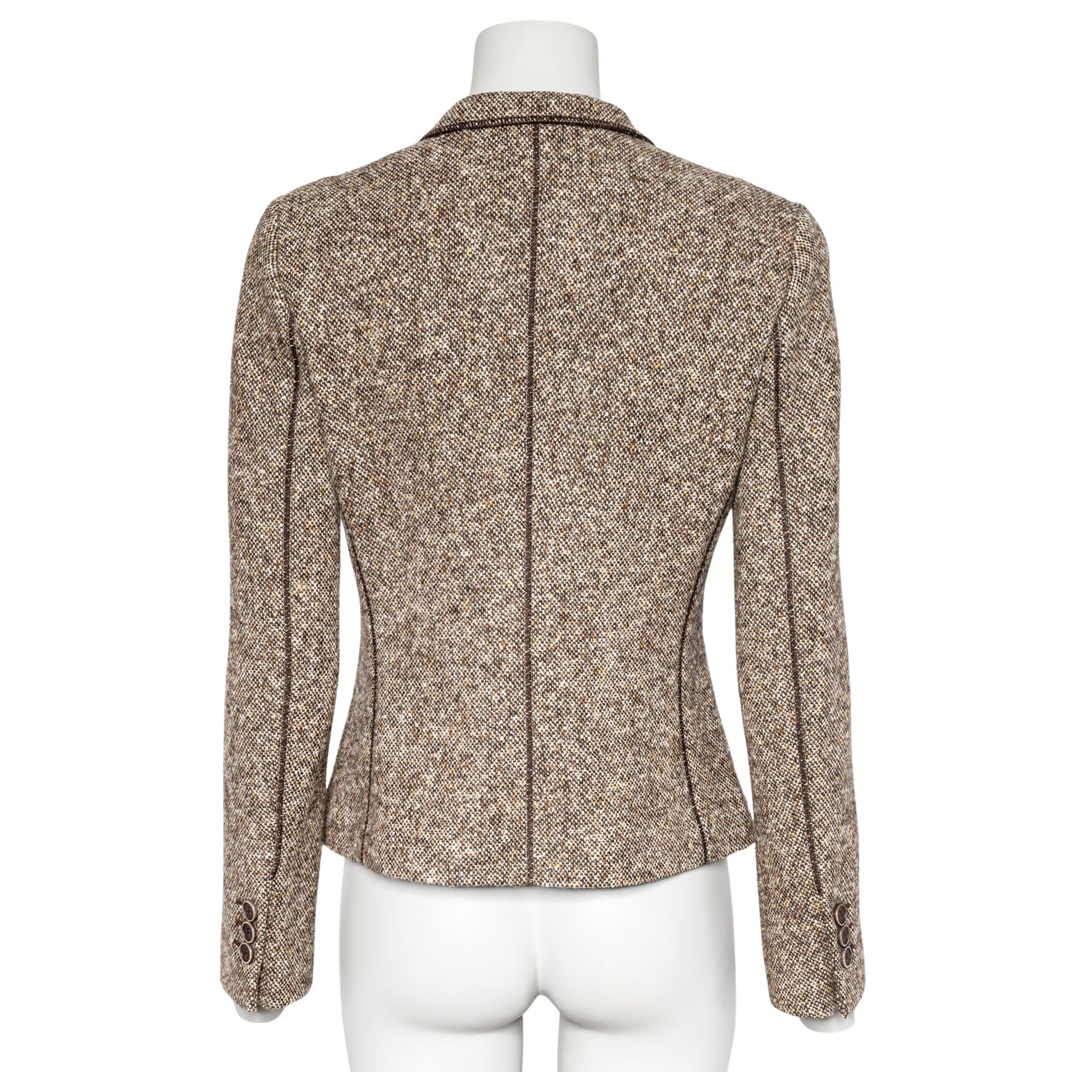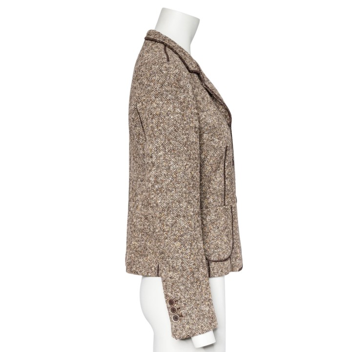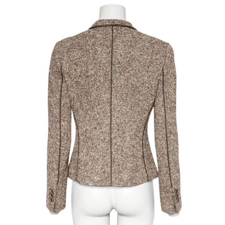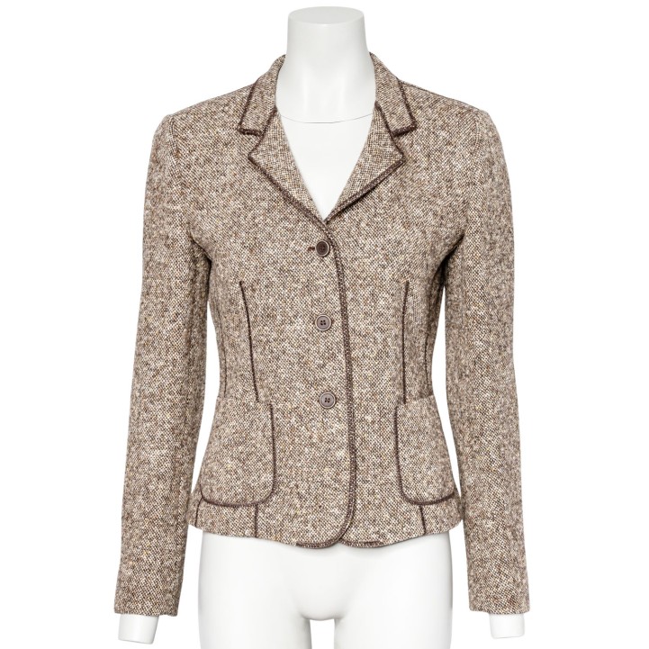 BRUNELLO CUCINELLI Blazer, size 38 (it. 44). Virgin wool. Tweed in various shades of brown with narrow lapel collar, button fastening and patch pockets. Signs of wear present.
