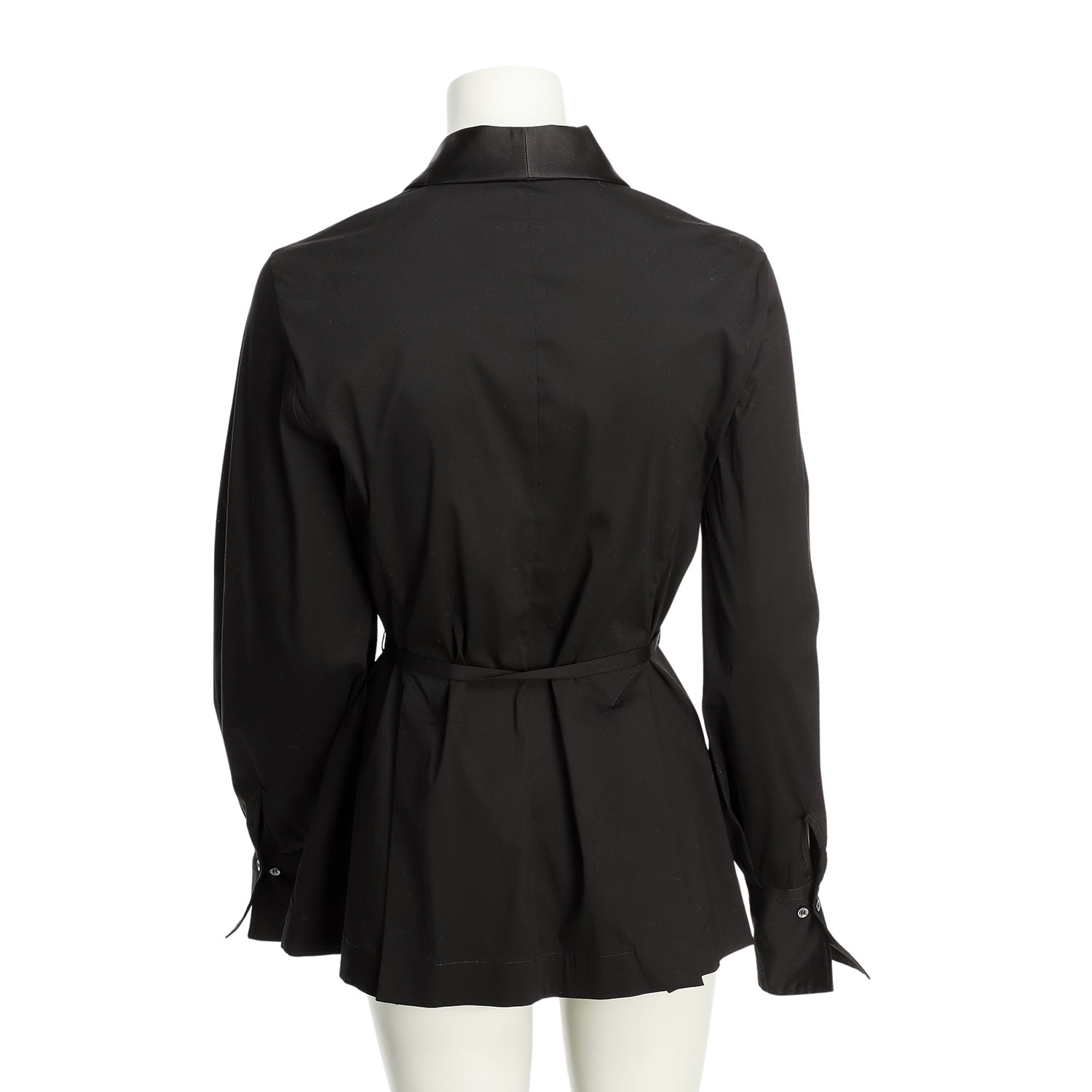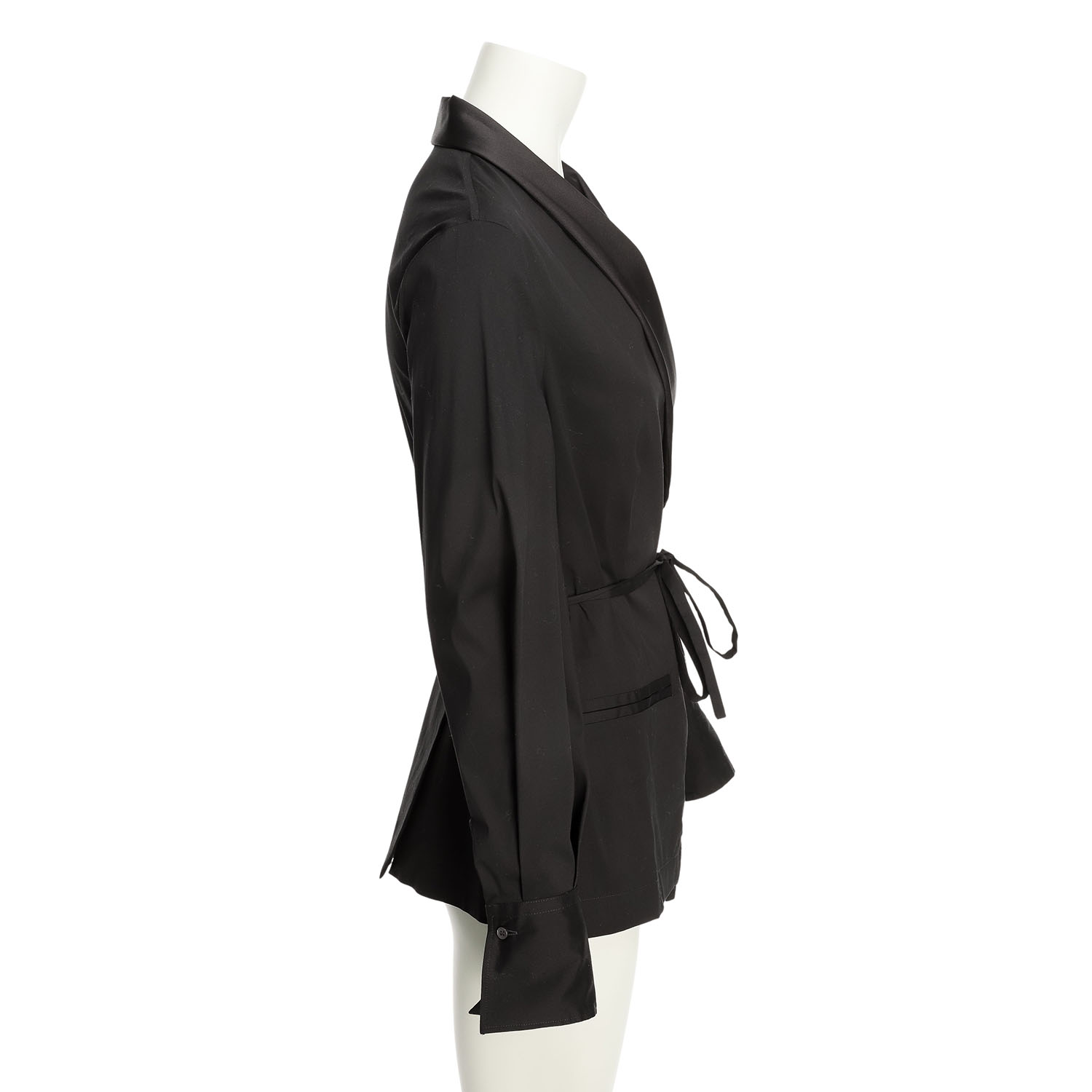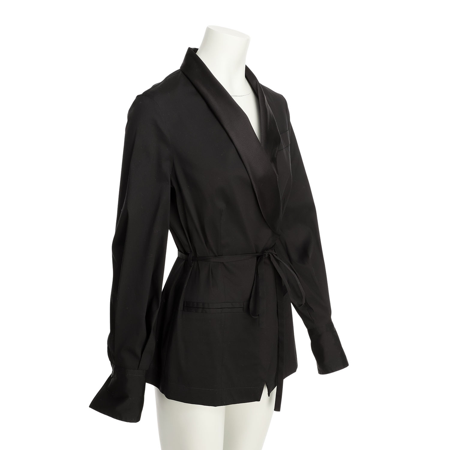 Cotton blend. Black wrap model with shawl collar, press stud fastening, satin details, piped pockets and belt. Signs of wear present.