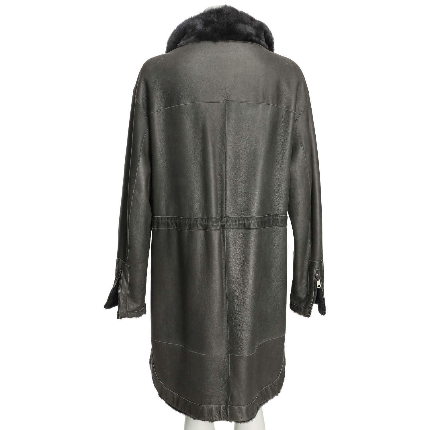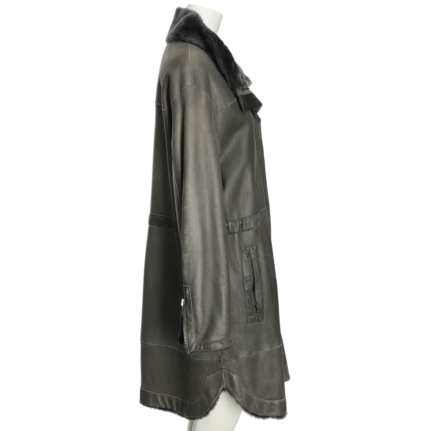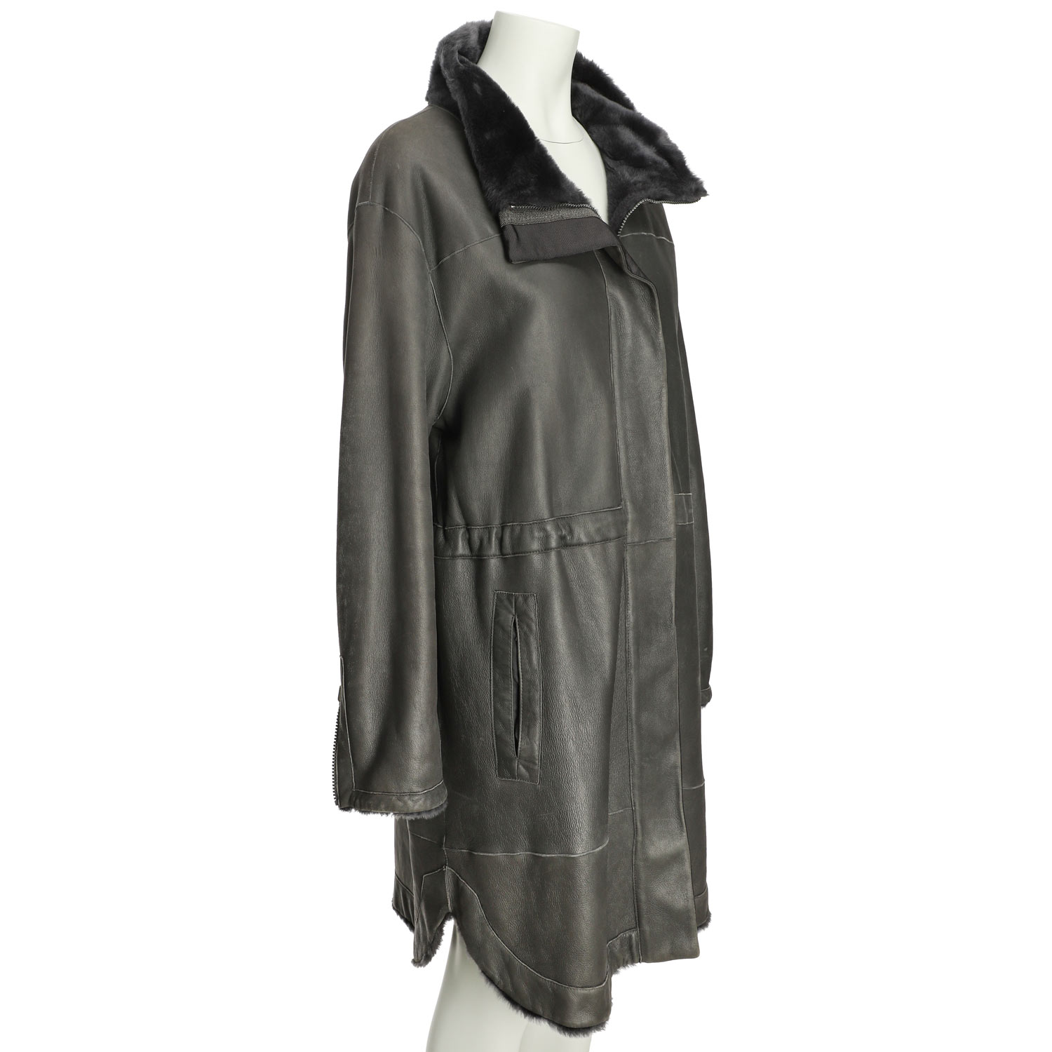 BRUNELLO CUCINELLI reversible coat, size 40. Manufacturer's size 46. lambskin, -leather in grey with zip, monili decor, turn-down collar and welt pockets. Traces of wear present.