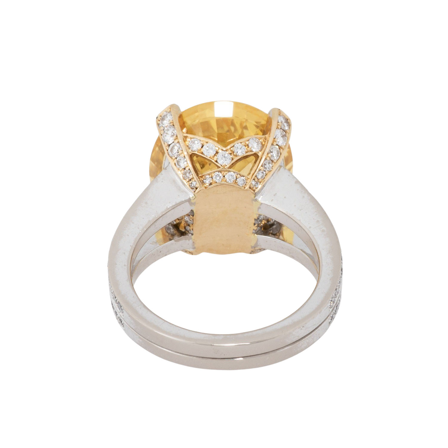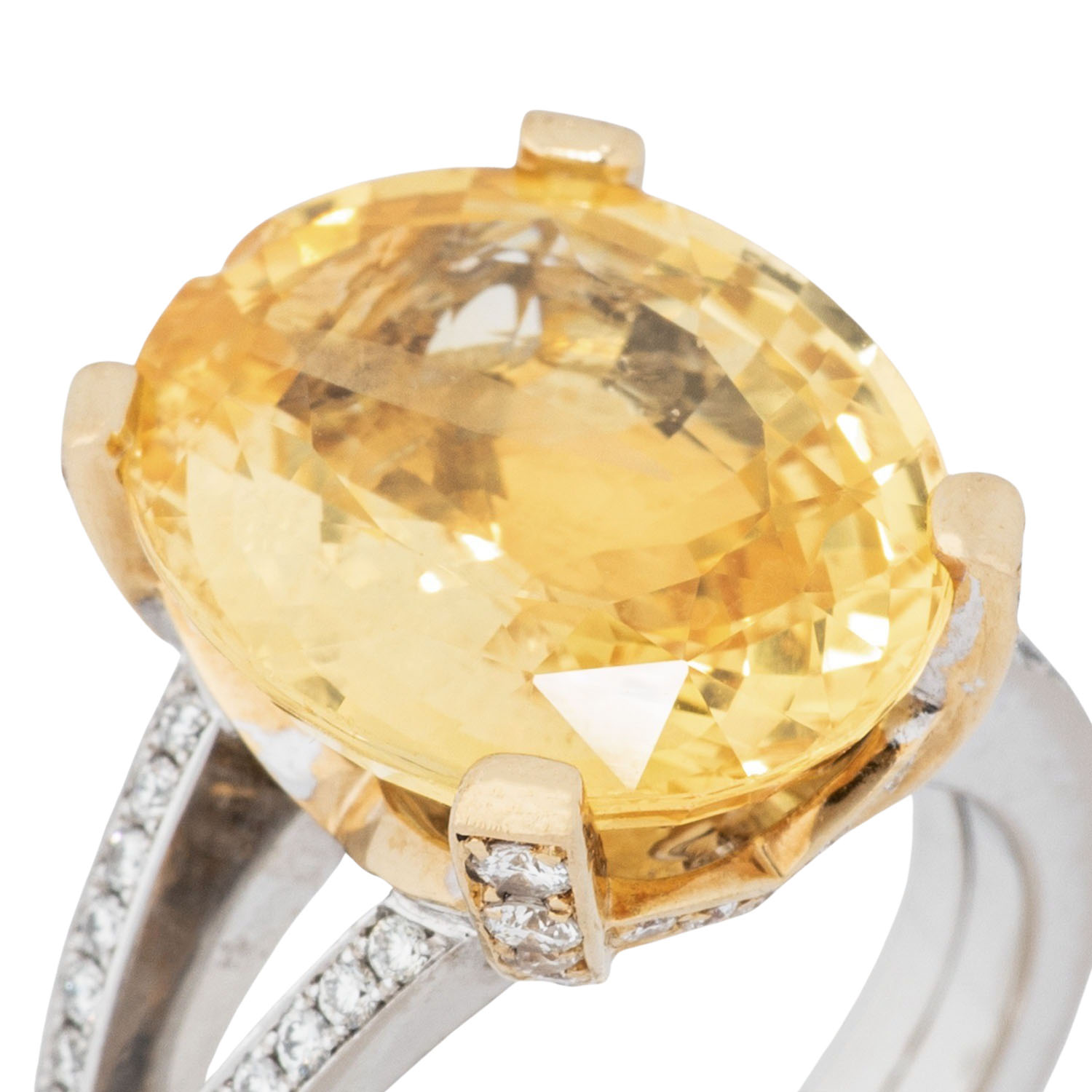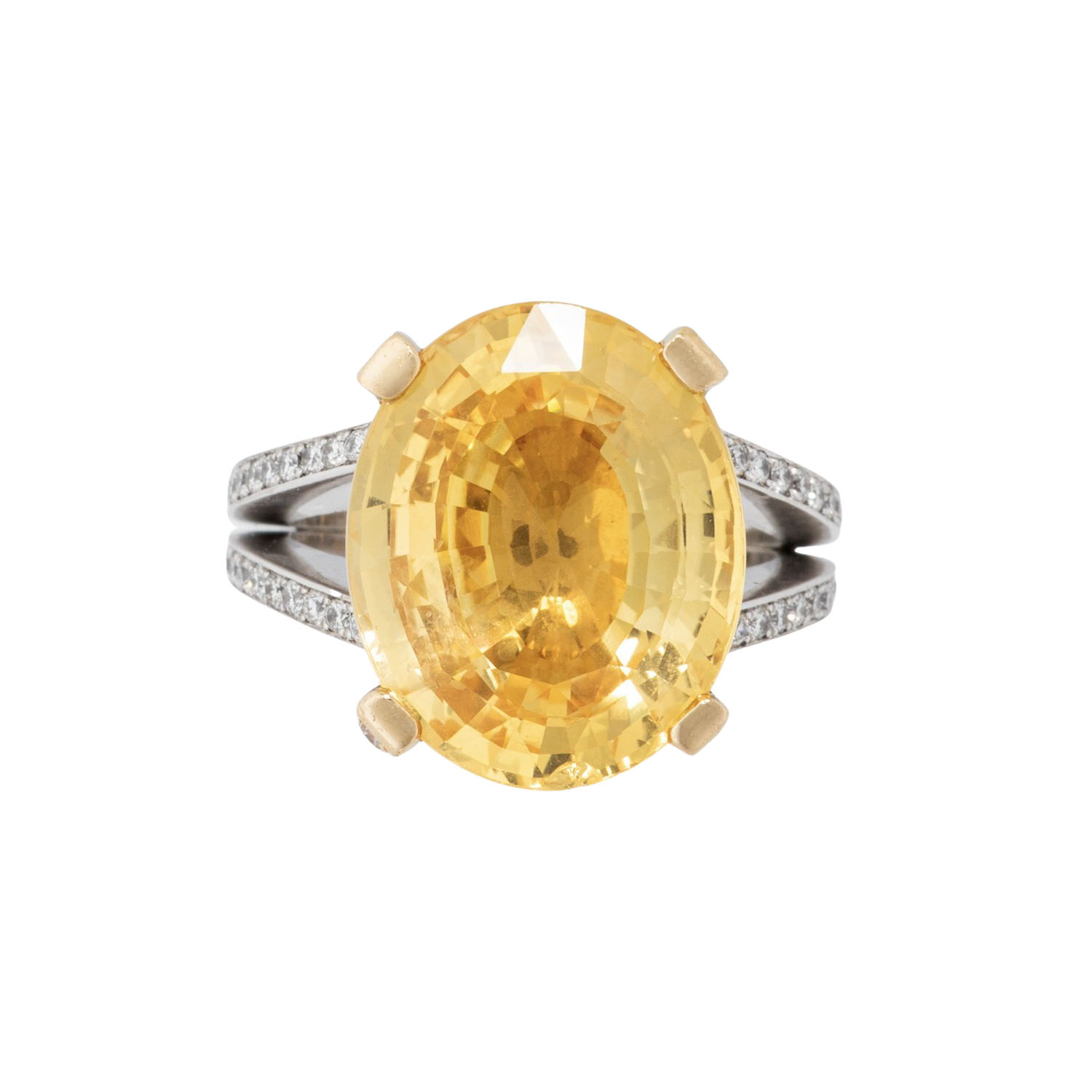 BUCHERER ring with yellow sapphire of 10.44 ct without indication of heating, brilliant-cut diamonds totalling 0.76 ct, good color a. clarity, 18K WG, 9.7 g, ring size 49, 21st century, minor signs of wear, sapphire chipped, with maker's mark 'CB', incl. copy of sales receipt and copy of gem report (DSEF).