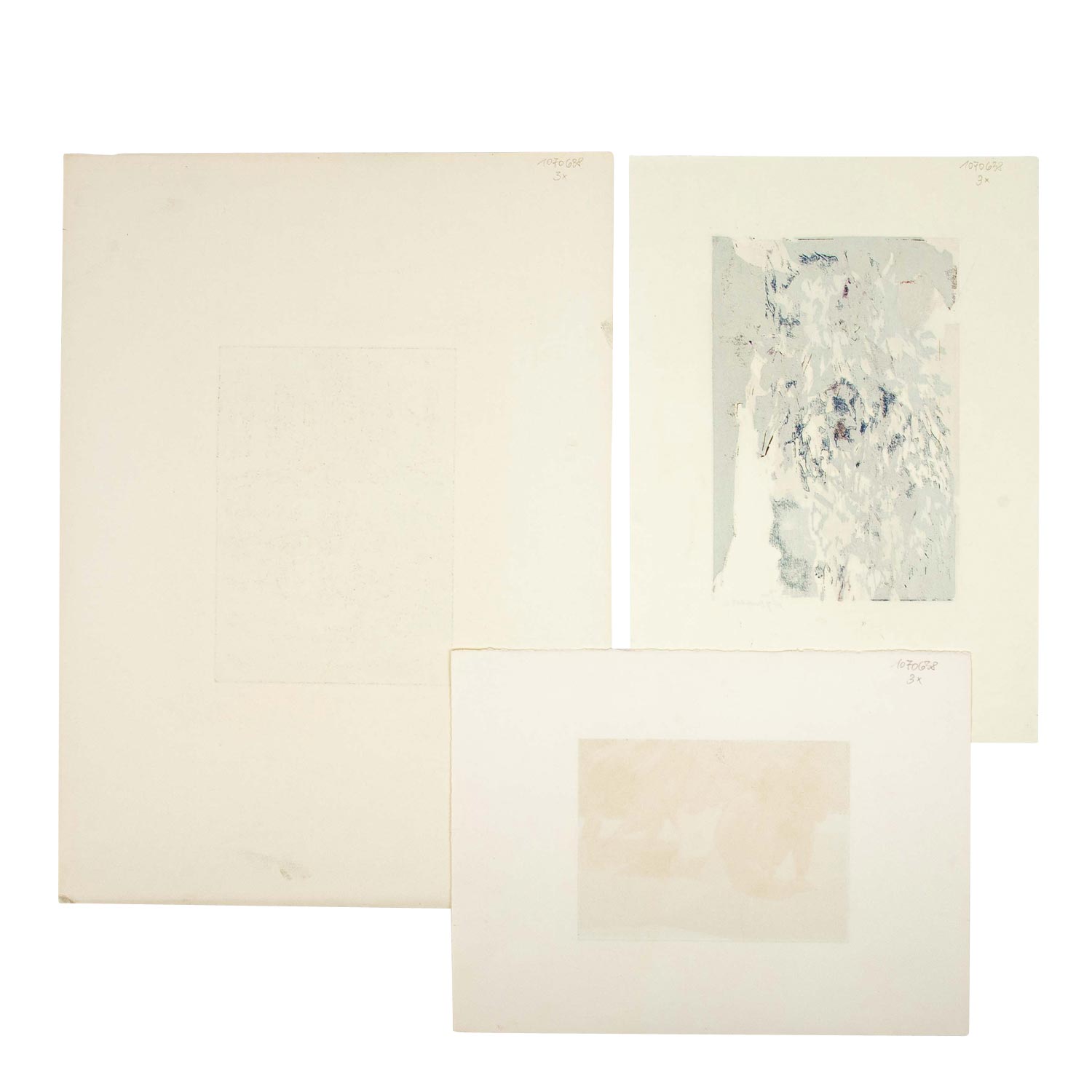 BUCHHOLZ, WOLFF (born 1935), 3 abstract and figurative compositions: 1x aquatint etching/paper, numbered by hand in pencil. 38/100, signed and dated (19)62, HxW: plate approx. 24.5x17.5 xm, sheet approx. 56x41 cm; 1x color woodcut/paper, numbered by hand in pencil. 71/100, signed and dated (19)73, HxW: plate approx. 27.5x18 cm, sheet approx. 43x30 cm; 1x color aquatint etching/paper, numbered by hand with pencil. 41/100, inscribed 'R 7406' signed and dated (19)74, HxW: plate approx. 15x20 cm, sheet approx. 28.5x38 cm. Slight signs of age and creases, part. few spots.