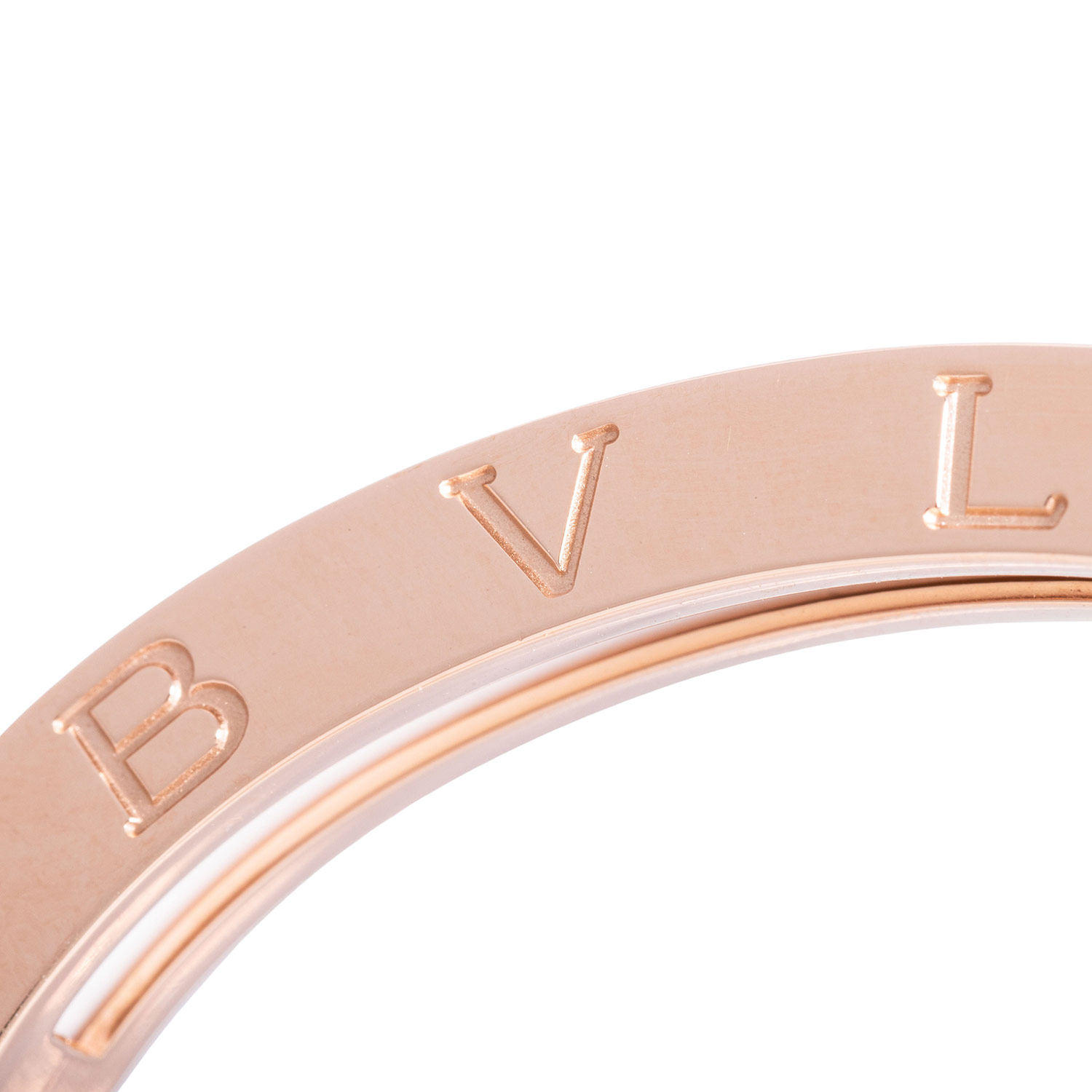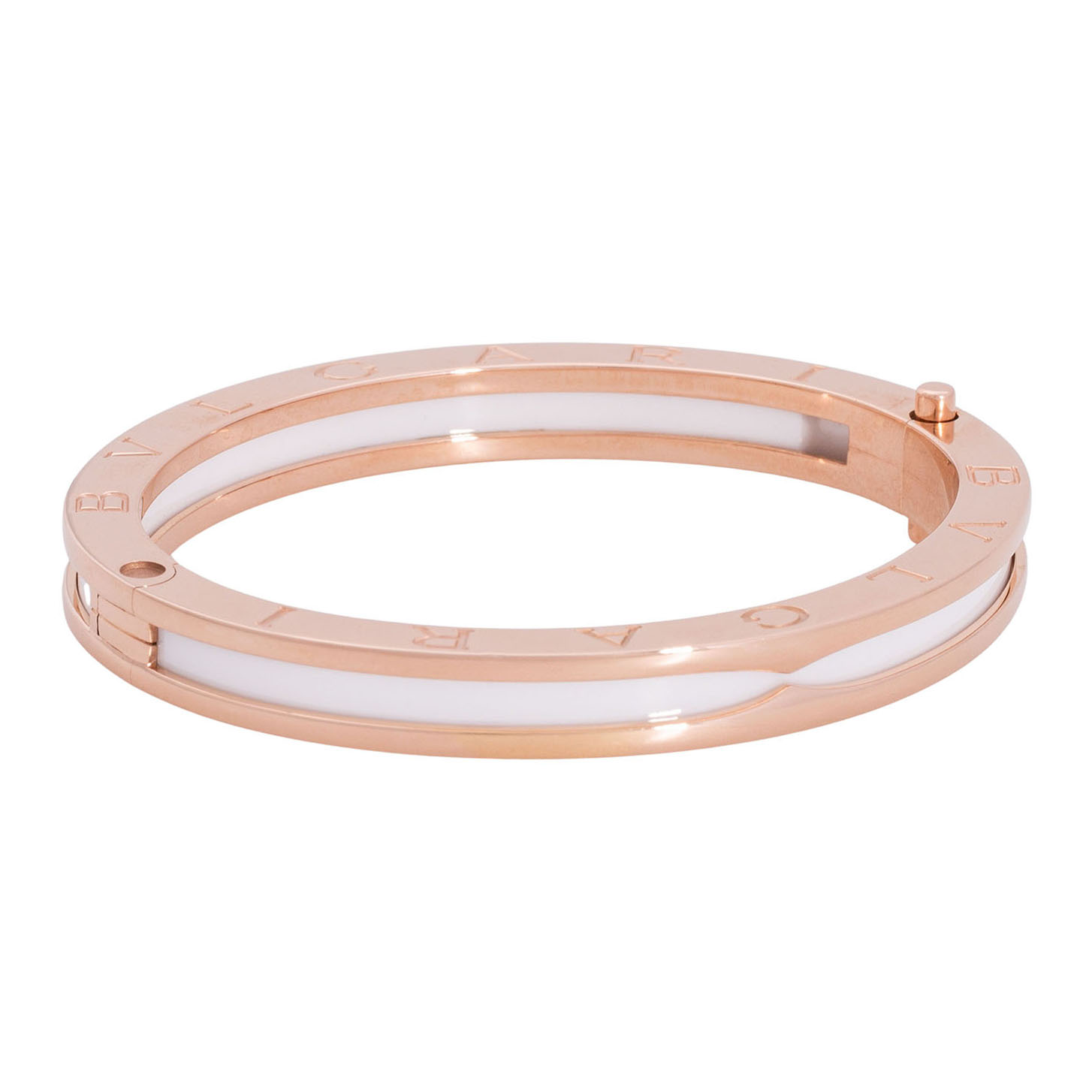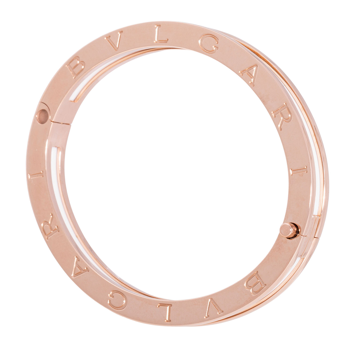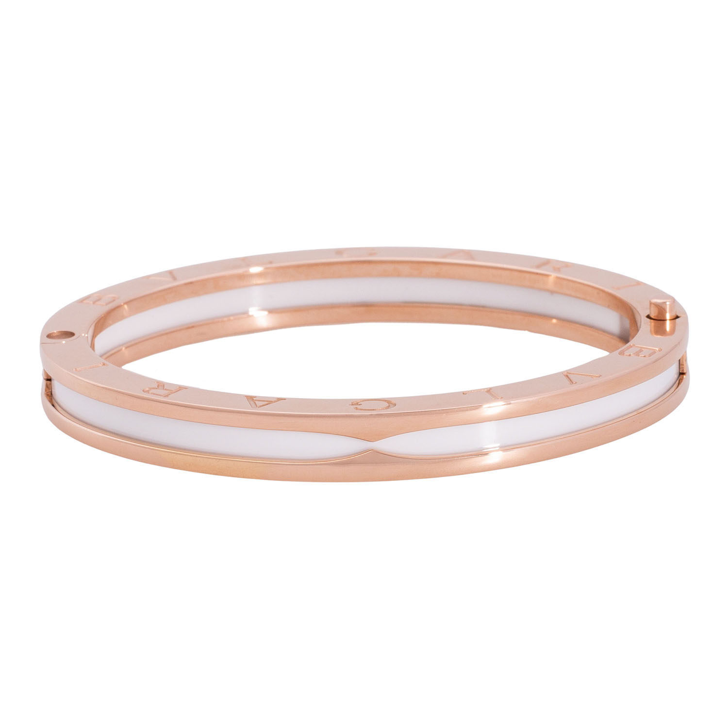 BULGARI bangle 'B.zero1' with white ceramics, NP of current model (more thin) 2024: 7,900 €, 18K red gold, 49.8 g, size M, inner circumference 16.5 cm, 21st century, good condition, with BULGARI Logo details.