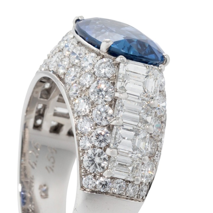 BULGARI. Ring with natural sapphire 6.25 ct, surrounded by brilliant-cut and emerald-cut diamonds totalling ca. 4.54 ct, good colour and clarity, platinum, 13 g, ring size 54, 21st century, mint condition, GRS gemstone report GRS2023-027369 enclosed.