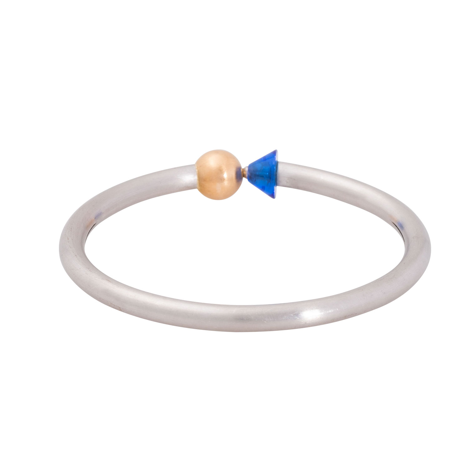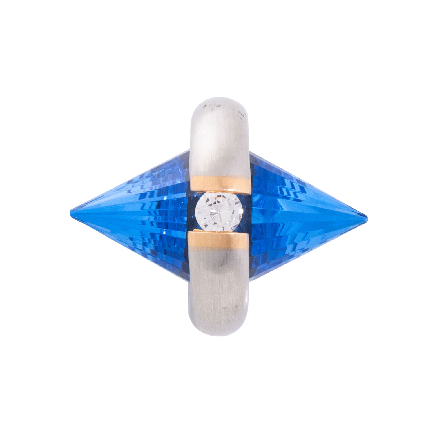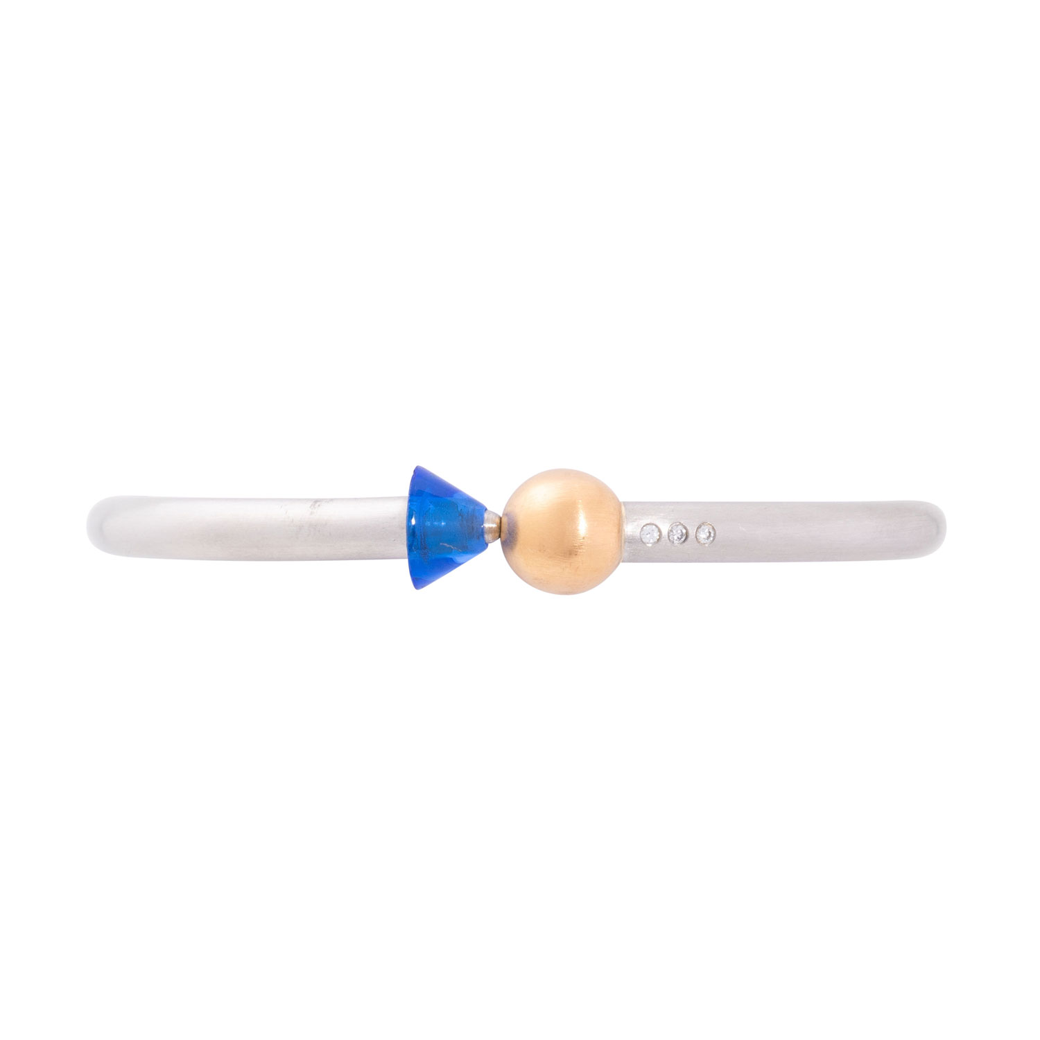 BUNZ designer's jewellery bundle bangle and pendant with cone-cut synthetic stones 'Cool Blue', platinum and 18K yellow gold 32,9 g, bangle with 3 brilliant-cut diamonds totalling ca. 0.03 ct (marked), inner circumference 17.5 cm and pendant with brilliant-cut diamond totalling ca. 0.2 ct (marked), ca. STW (J)/VS-VVS, 2x2.4 cm, 20th/21st century, minor signs of wear, with brand marks.