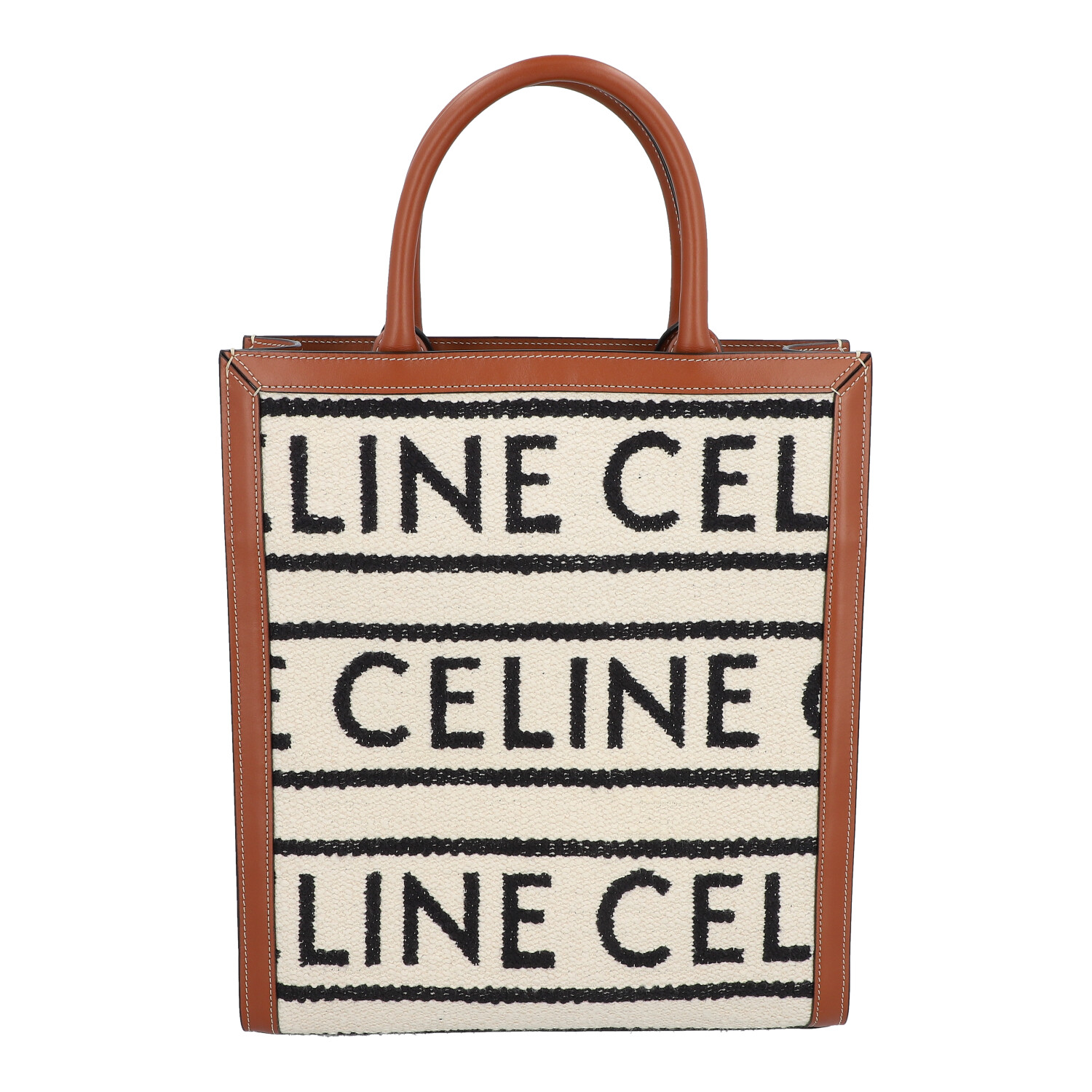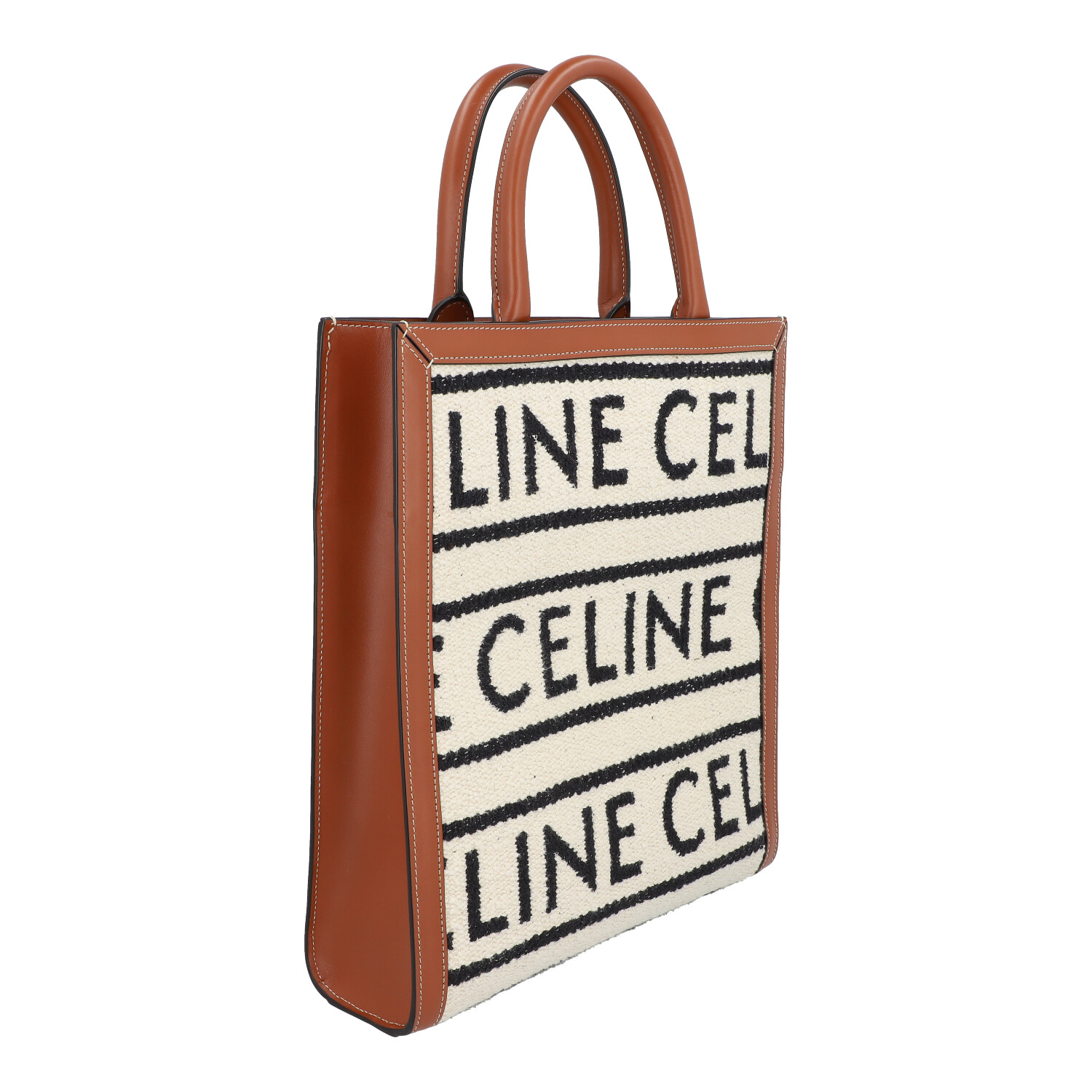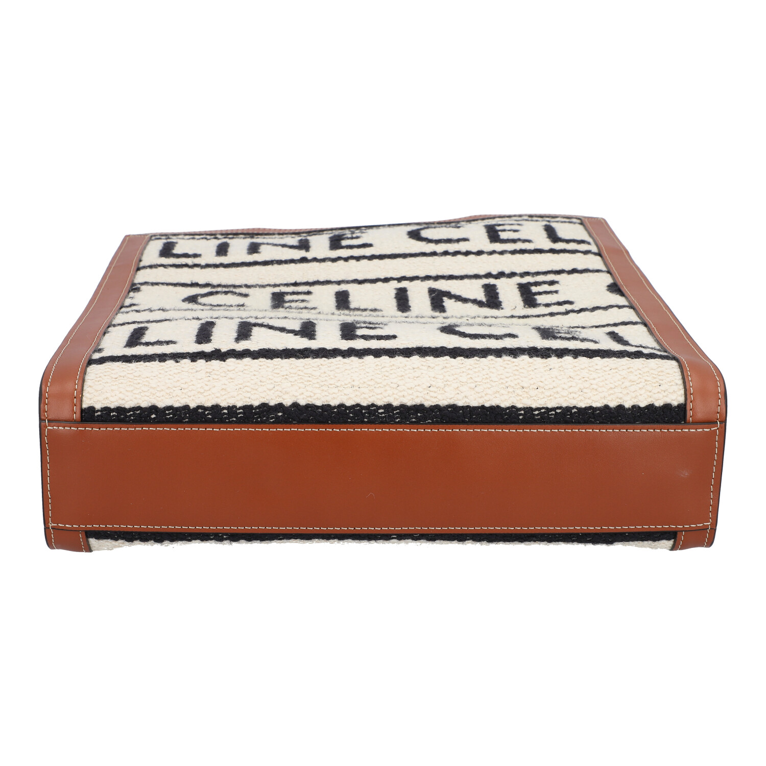 CELINE shoulder bag 'SMALL VERTICAL'. Light brown leather with a textile insert in white with black logo lettering. Shoulder strap and dust bag included. In very good condition. 28x7.5x32cm.