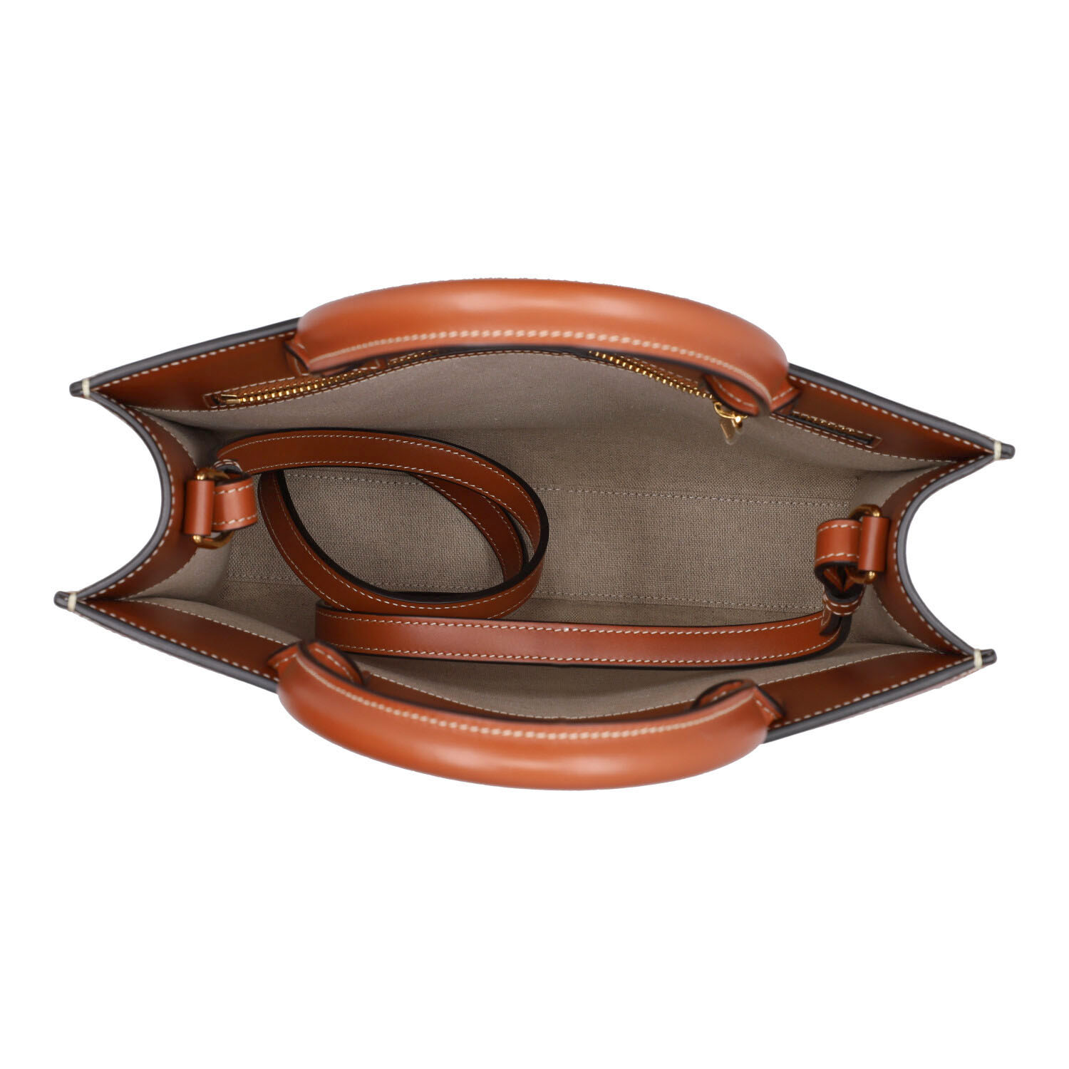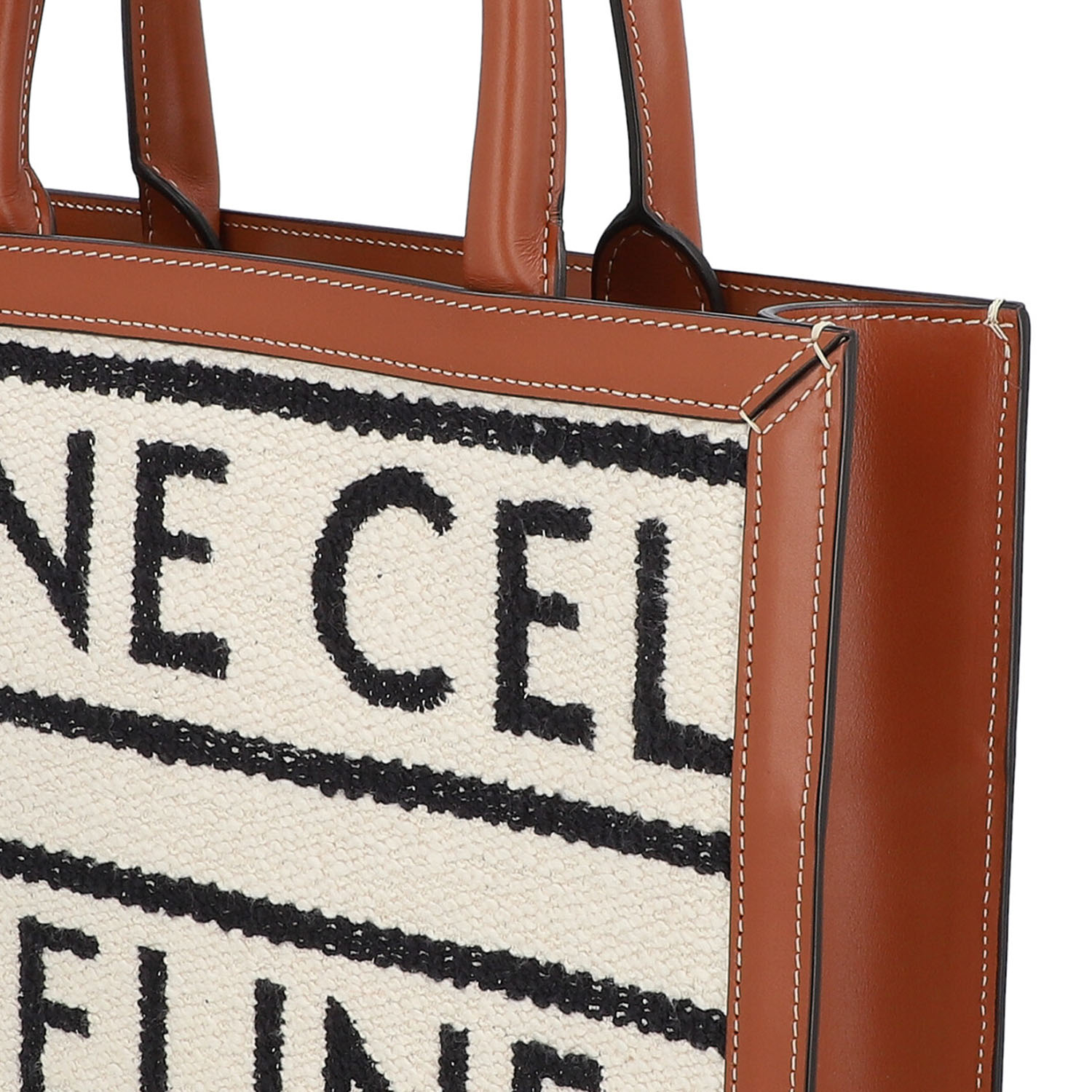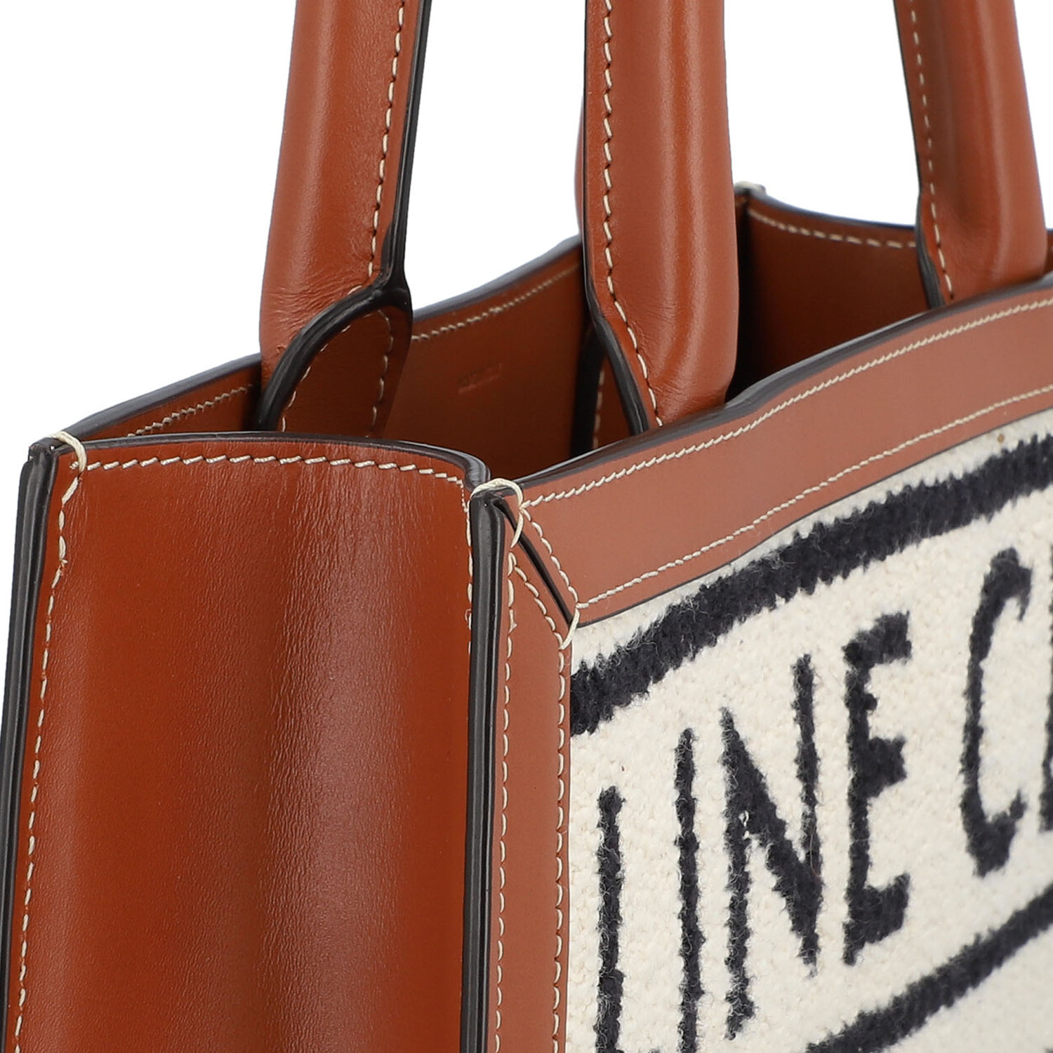 CELINE shoulder bag 'SMALL VERTICAL'. Light brown leather with a textile insert in white with black logo lettering. Shoulder strap and dust bag included. In very good condition. 28x7.5x32cm.