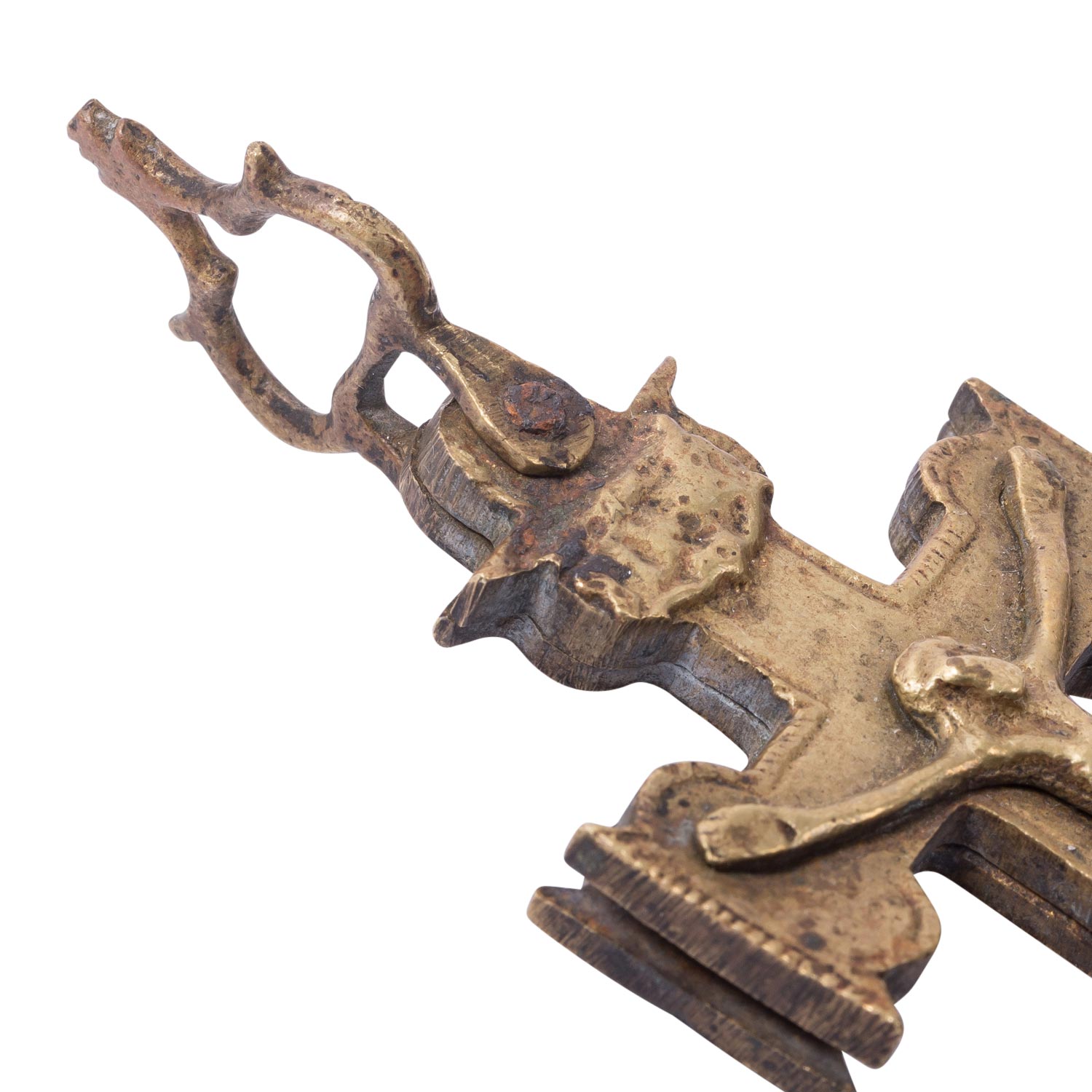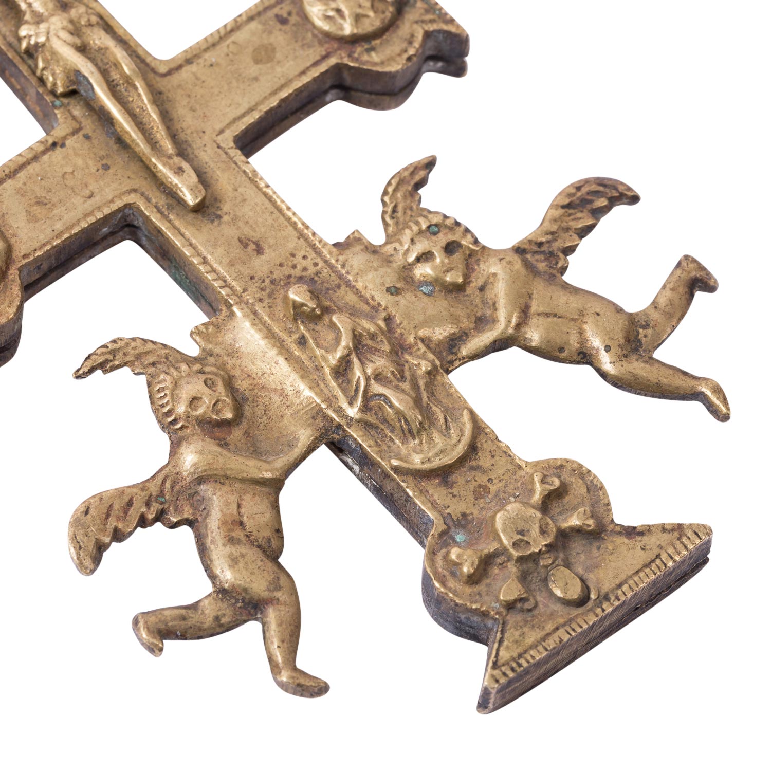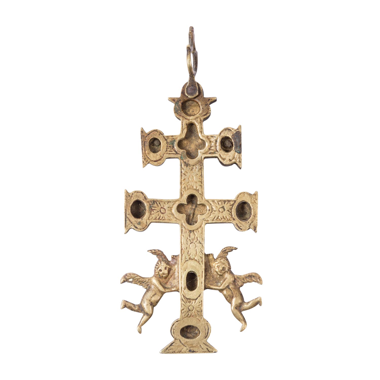 CARAVACA CROSS, Spain, probably 18th century, double cross with the crucified Christ, flanked by flying putti and a mourning Mary at the feet of the crucified Christ. HxW: 11.5/5.7 cm. Signs of age and use.
