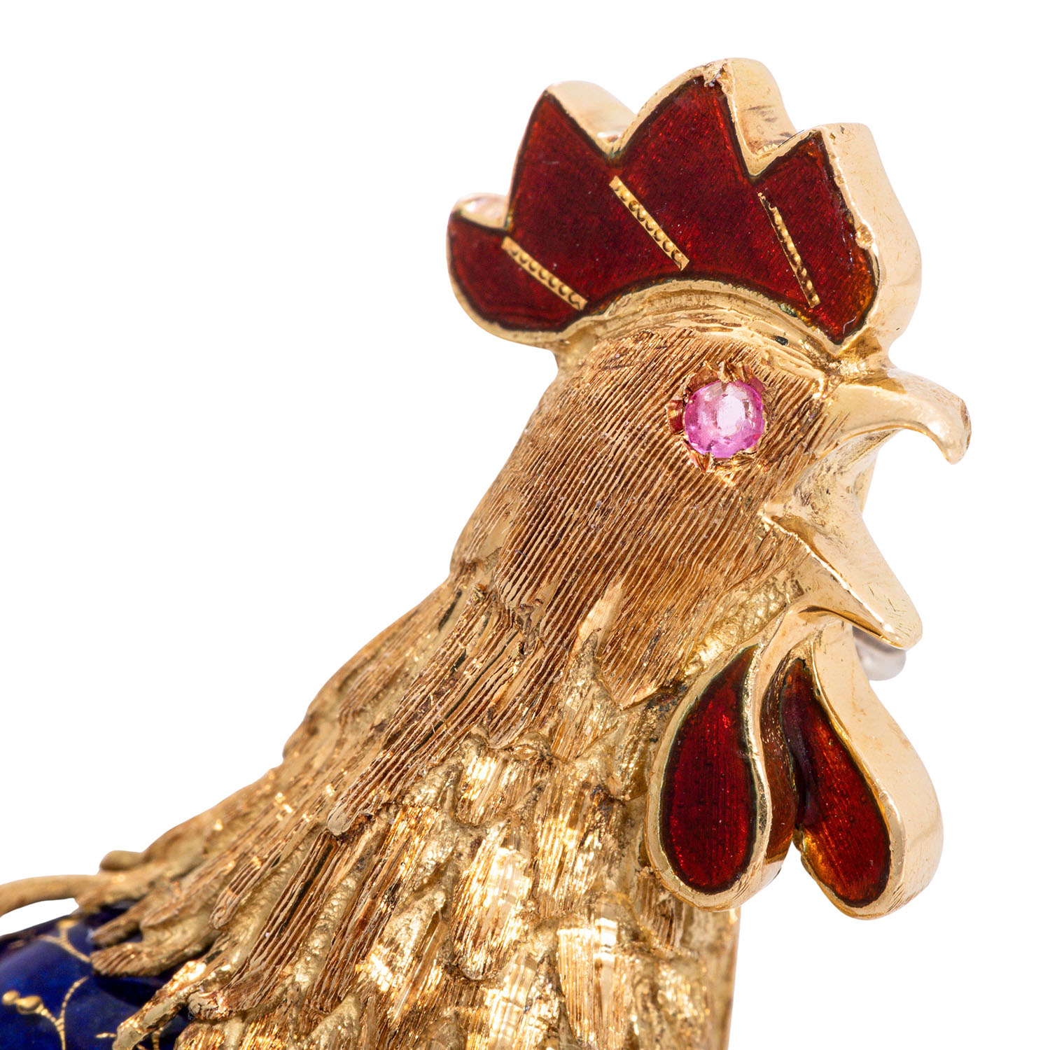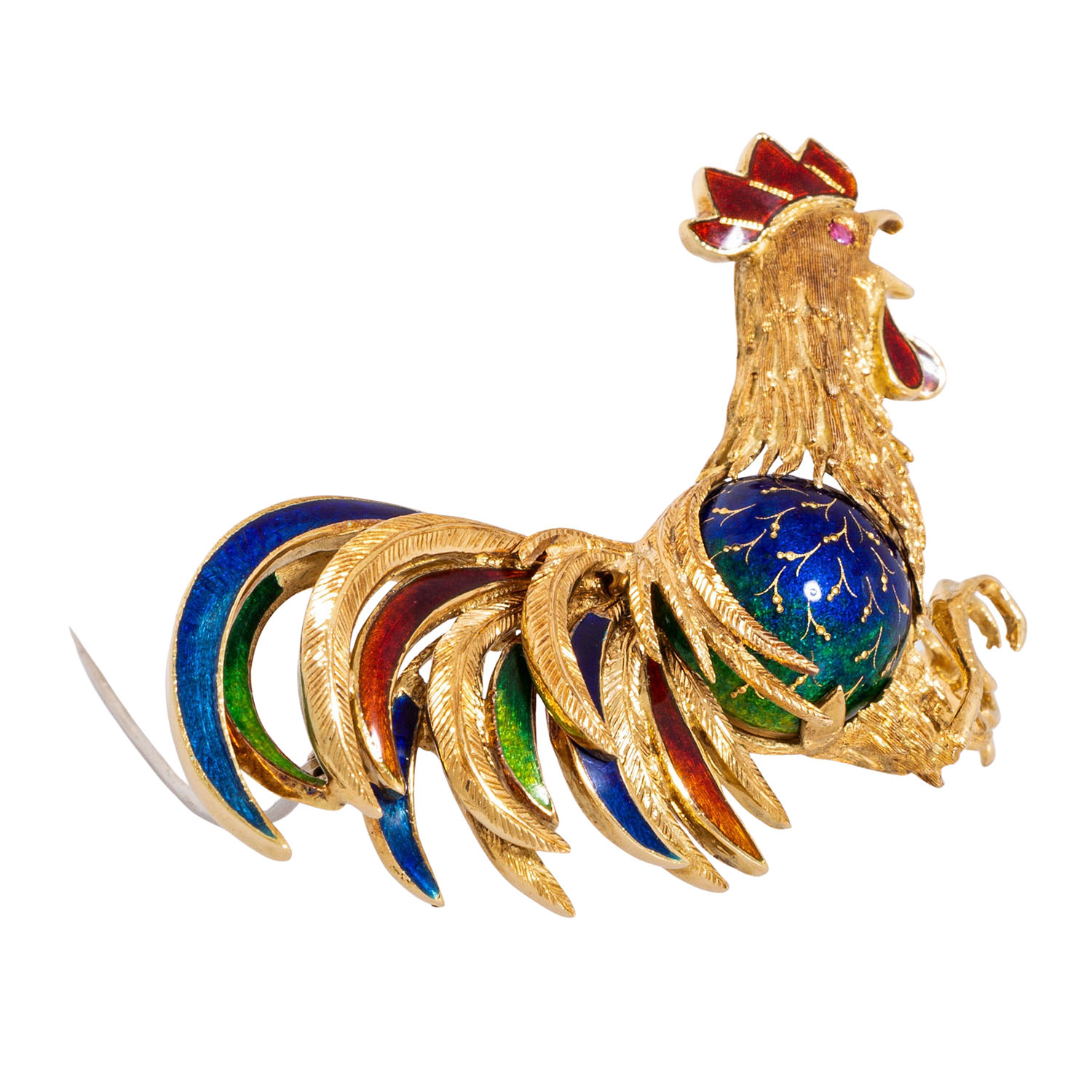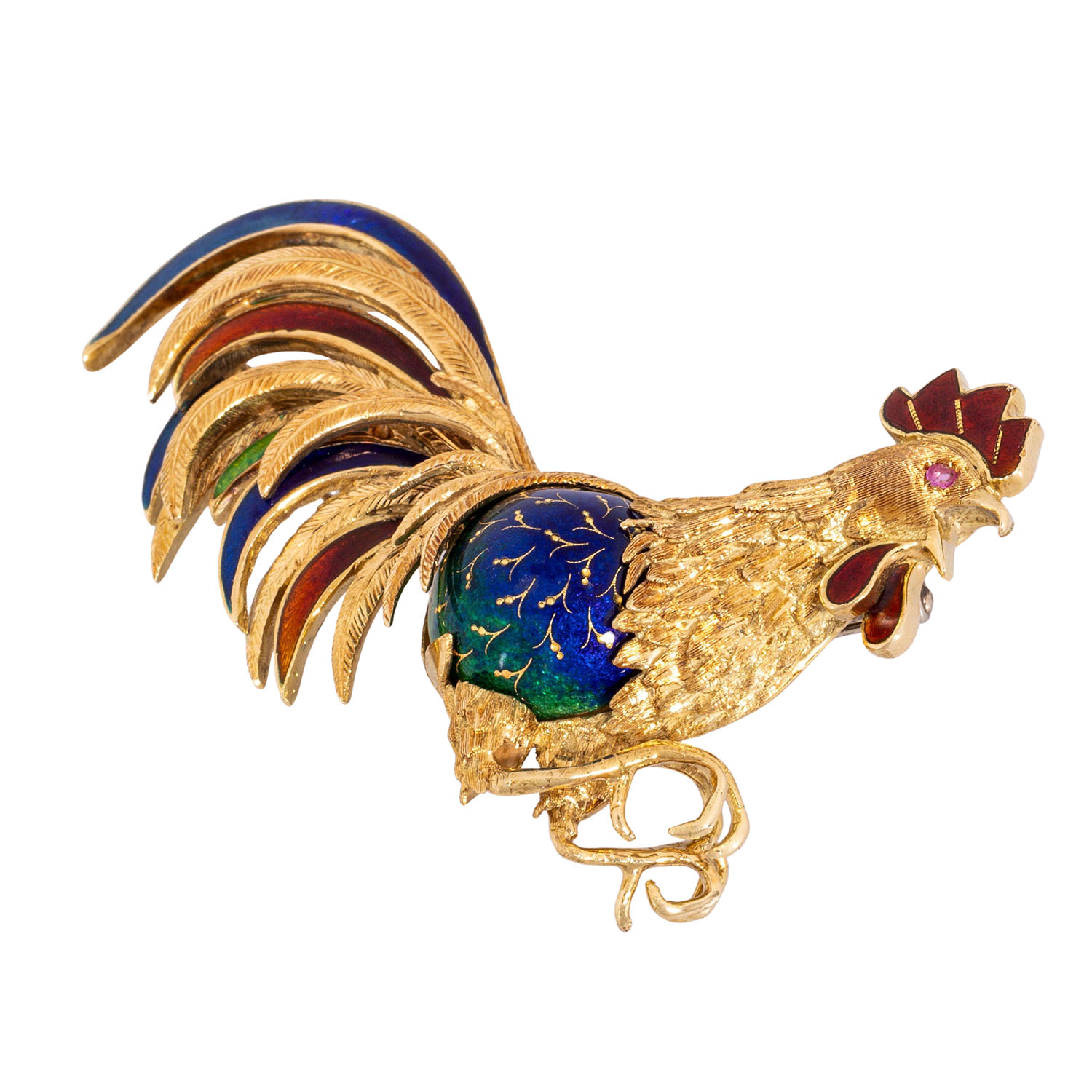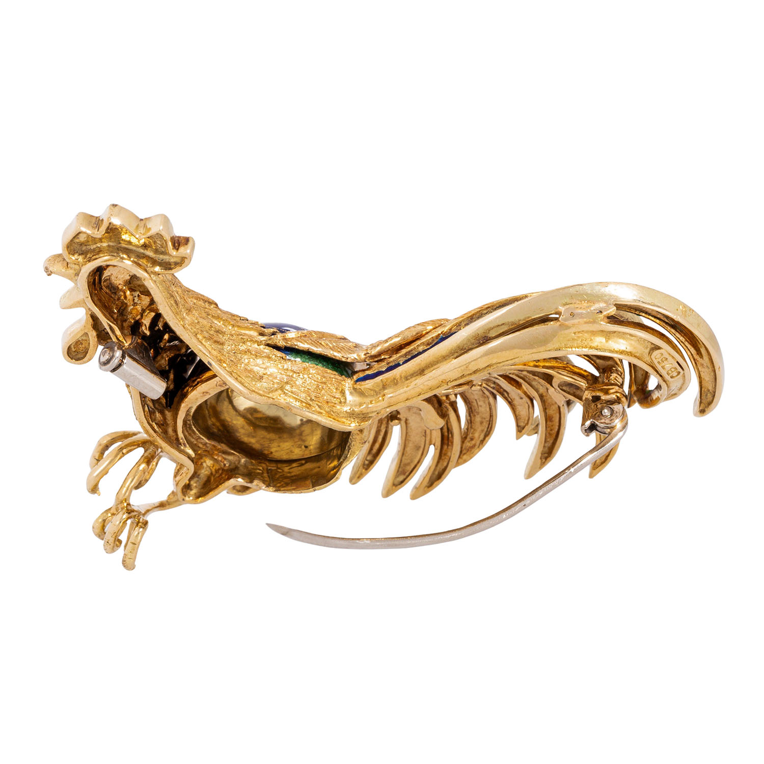 CARL BUCHERER Outstanding brooch 'Rooster', colored enamel, 18K yellow gold, 30.2 g, L x W: approx. 6 x 5 cm, 2nd half of the 20th century, minimal signs of wear, with hallmark 'CB', expressive depiction in masterful craftsmanship with hand engravings.