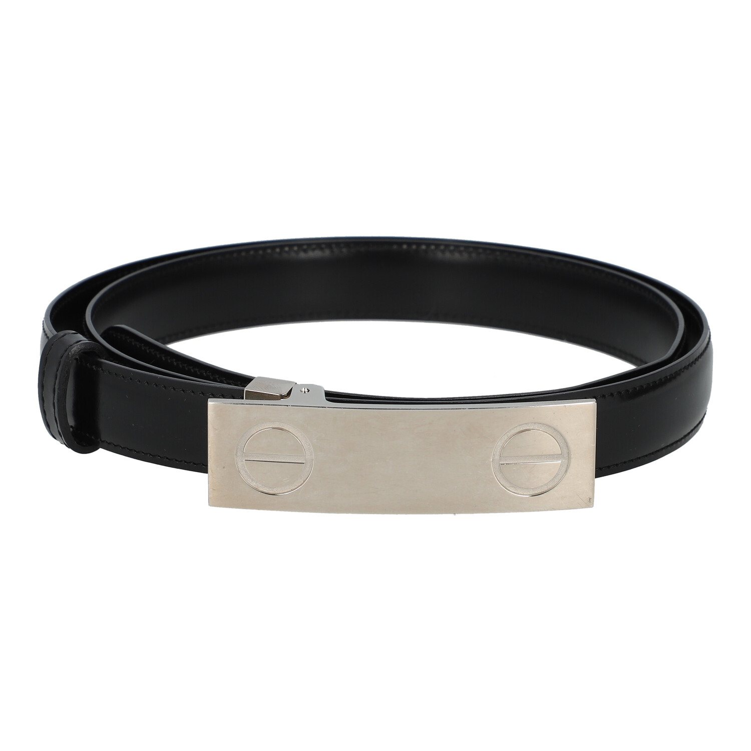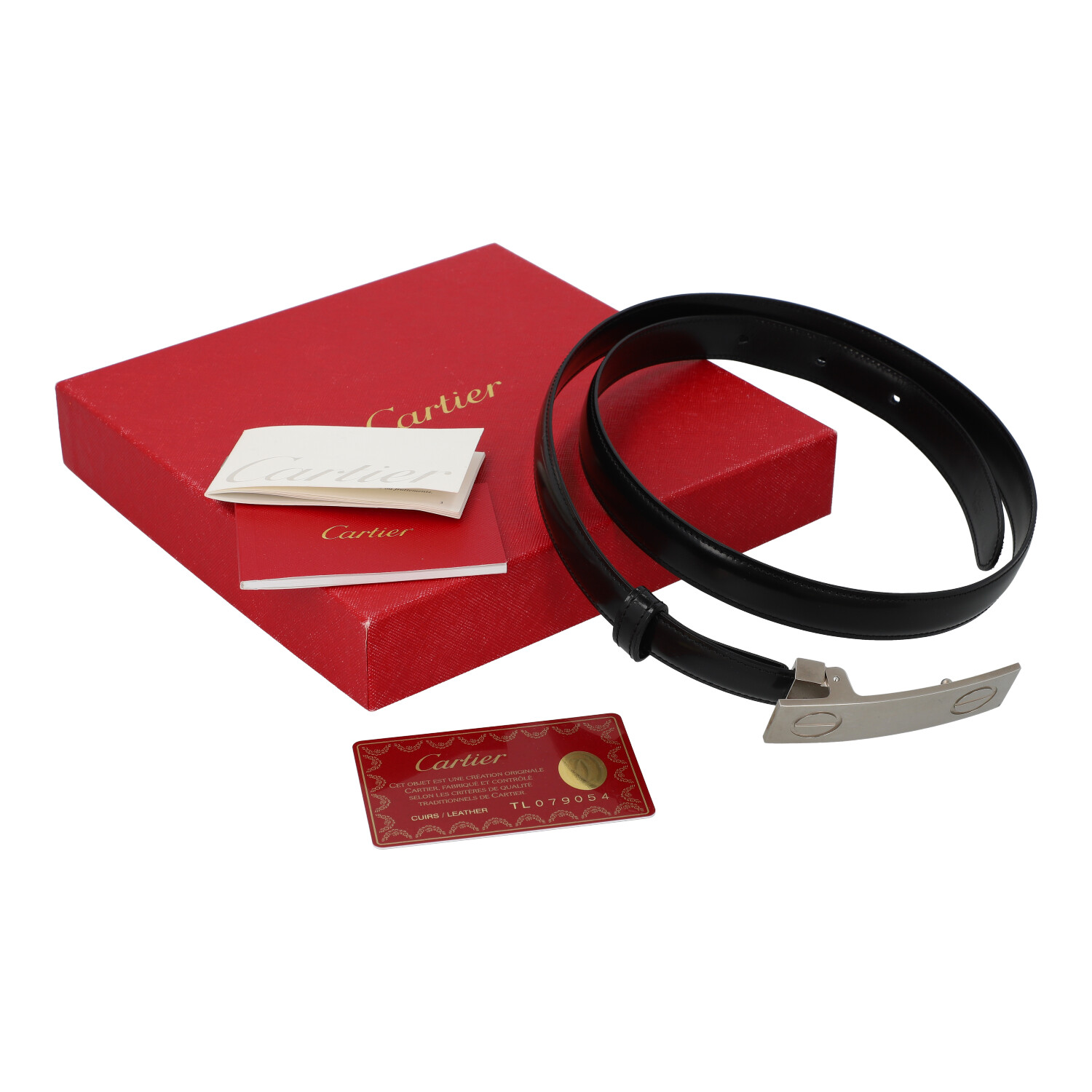 CARTIER belt 'LOVE', L.: 85 cm. Smooth black leather with silver-coloured clasp. Box, booklet and card enclosed. Signs of wear present. B.: approx. 2 cm.
